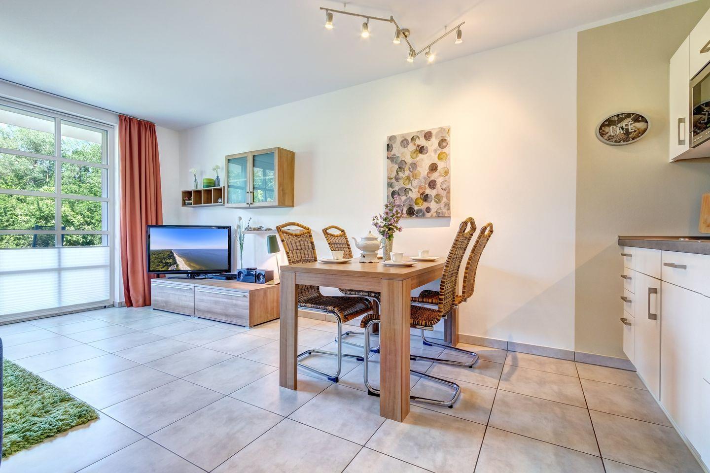 Die Wohnung bietet einen großzügigen Wohn- und Essbereich von etwa 20m², der zum Verweilen und Entspannen einlädt. Das absolute Highlight unserer Unterkunft ist zweifellos die sonnige, überdachte Terrasse mit Ihrem eigenen Strandkorb. Von hier aus genießen Sie einen traumhaften Ausblick auf die umliegende Natur – Wasser und Wald verschmelzen zu einer Kulisse, die pure Entspannung verspricht.