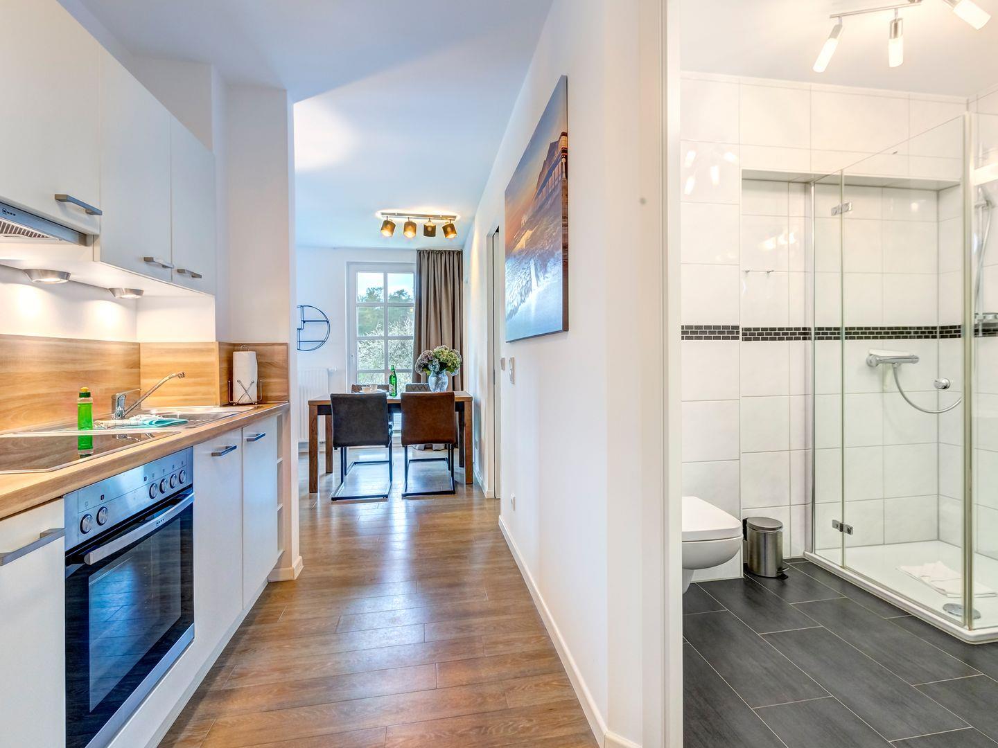 In unserer vollausgestatteten Küche können Sie nach Herzenslust kochen und kulinarische Genüsse zubereiten. Das moderne Badezimmer verfügt über eine erfrischende Dusche, um nach einem erlebnisreichen Tag zu entspannen.
