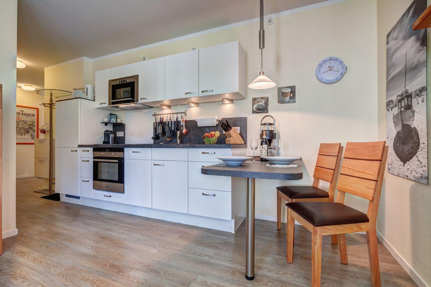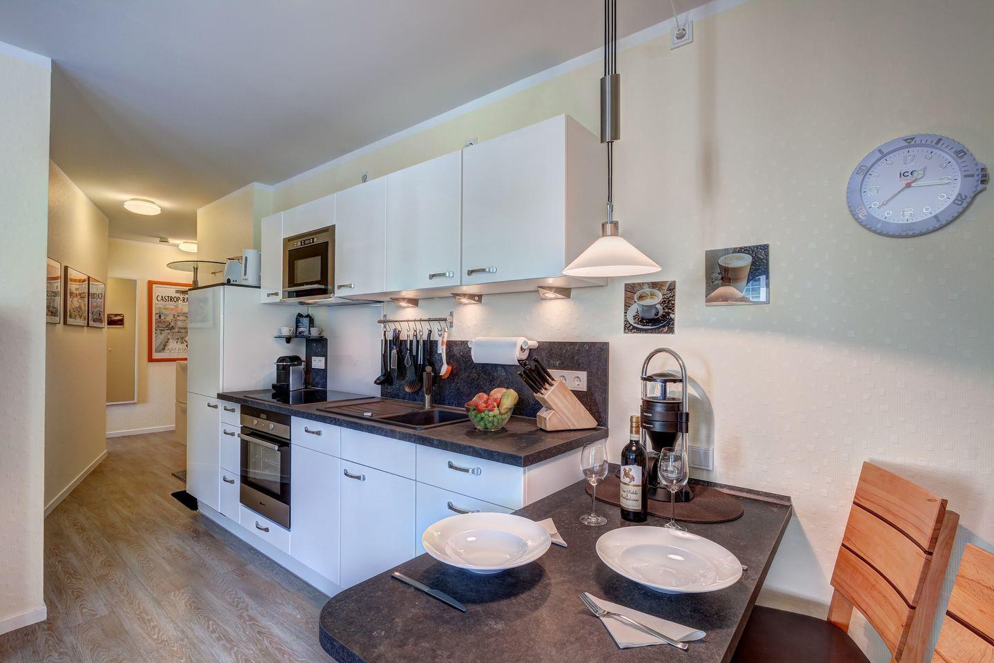 Die vollständig eingerichtete Küche lädt zum Kochen ein, während das moderne Schlafzimmer in massiver Kernbuche mit einem verstellbaren Lattenrost für erholsame Nächte sorgt. Im Badezimmer erwartet Sie eine bodentiefe Echtglas-Dusche.