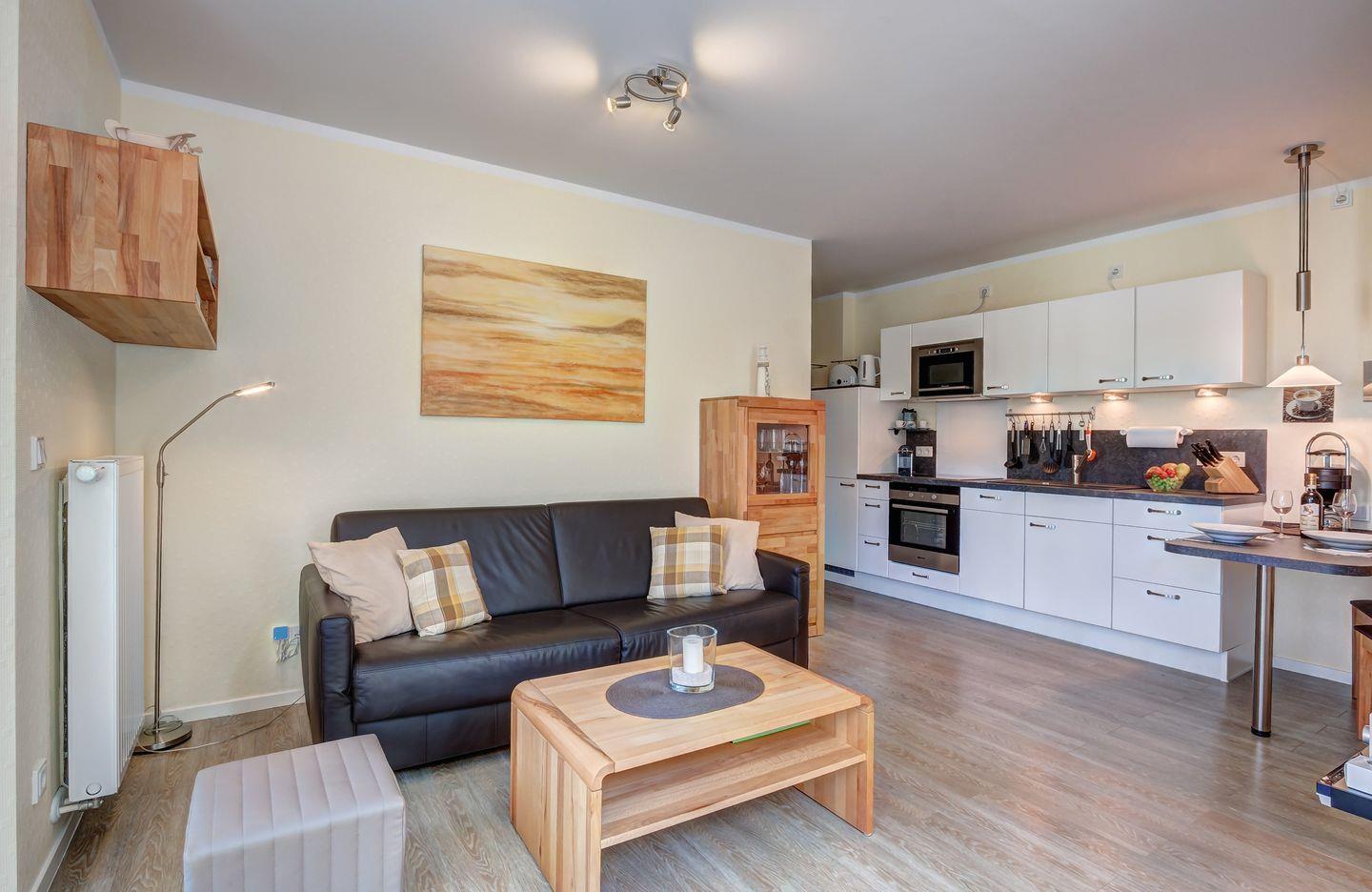 Die Wohnung ist lichtdurchflutet und offen gestaltet, ideal für maximal 2 Personen, die sich hier garantiert wohlfühlen werden. Im Wohnzimmer erwartet Sie ein gemütliches Leder-Sofa, ein 37 Zoll LED Flachbildschirm SAT HD TV (3D-fähig) mit Blu-Ray DVD/CD-Player, sowie ein kleiner Erker mit einem Stressless Sessel und Blick auf den Balmer See. Der Zugang zur Süd/West ausgerichteten Terrasse mit Strandkorb, Tisch, 2 Stühlen und der beeindruckenden Aussicht auf den Balmer See (Achterwasser) bietet einen malerischen Rahmen für Ihre Erholung.