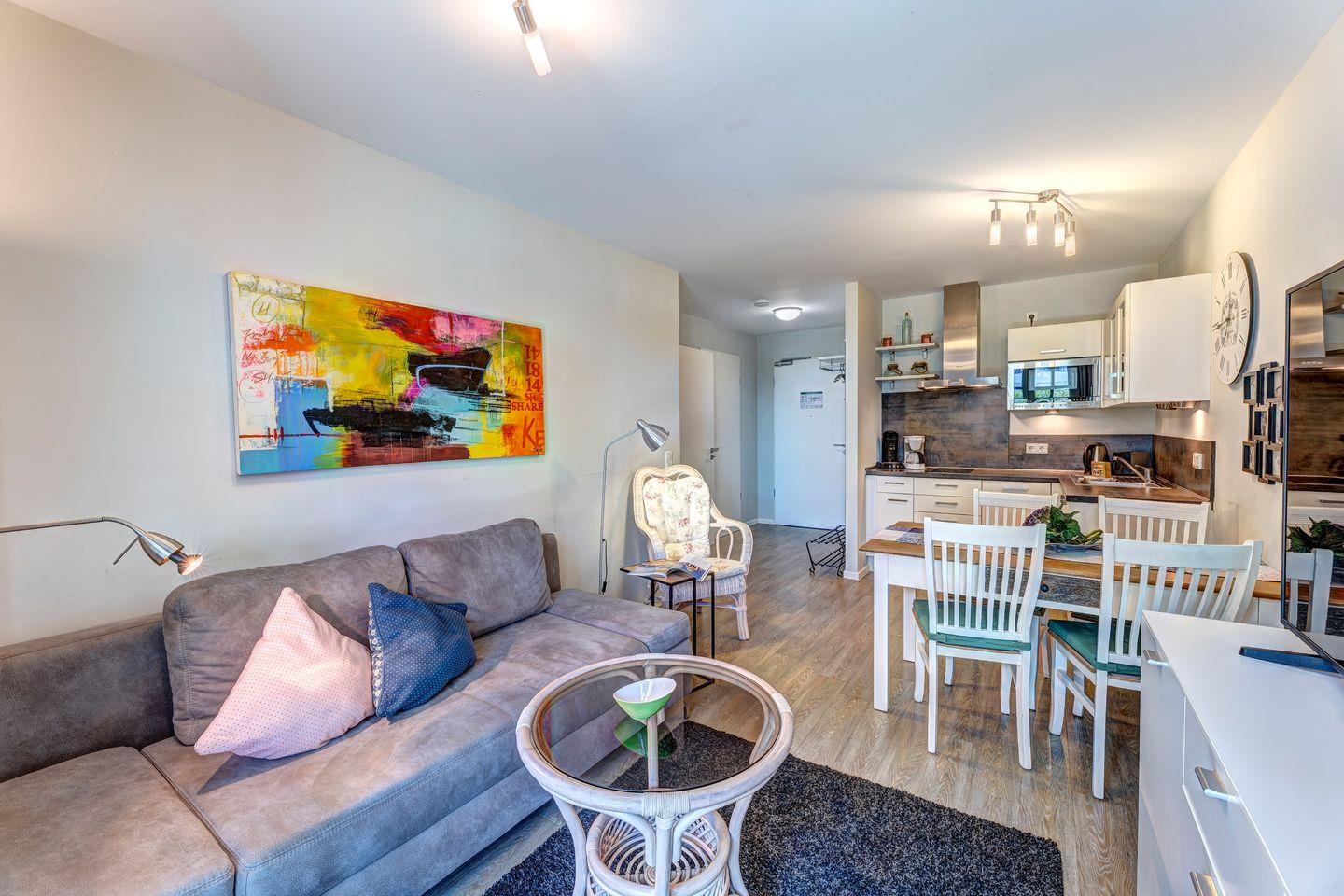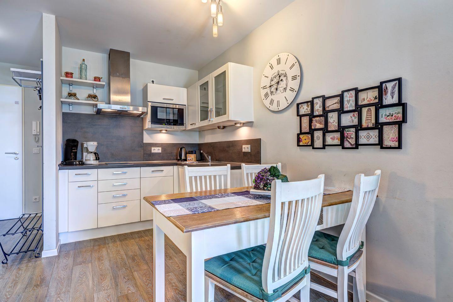 Die 41 m² große Wohnung beeindruckt durch eine gut ausgestattete und moderne Einbauküche mit Vollausstattung, die nahtlos in den gemütlichen Wohnbereich übergeht. Hier können Sie sich ganz nach Belieben kulinarisch verwöhnen und entspannen. Die gemütliche Atmosphäre setzt sich auf der sonnigen Terrasse fort, wo Sie Ihre Urlaubstage inmitten der Natur und an der frischen Luft ausklingen lassen können.