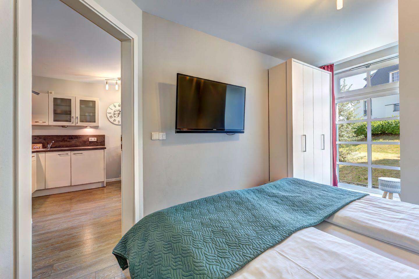 Das vollwertige Schlafzimmer mit einem komfortablen Doppelbett und ein Schlafsofa laden zu erholsamen Nächten ein. Ein eigener Fernseher im Schlafzimmer ermöglicht es Ihnen, sich vor dem Schlafengehen zu entspannen oder morgens in Ruhe zu frühstücken.