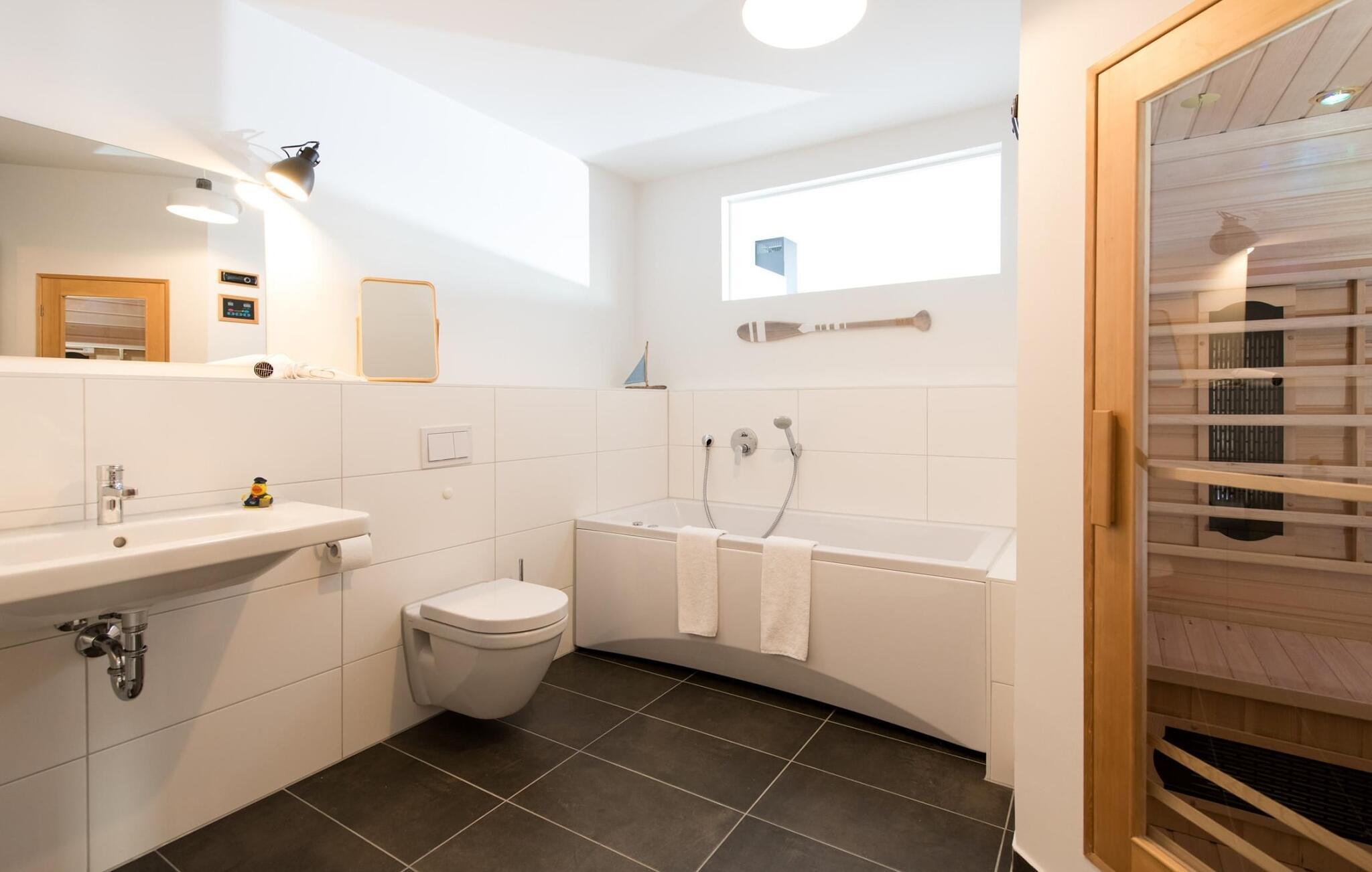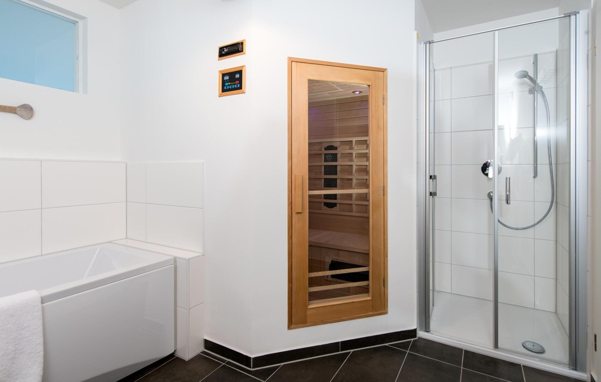 Wellness Liebhaber kommen ganz auf ihre Kosten, Infrarot Wärmekabine mit Hifi-Sound-System und LED-Farblichttherapie sowie eine Relax-Whirlwanne laden nach dem Strandspaziergang zum Entspannen ein. Auch eine bodengleiche Dusche steht bereit.