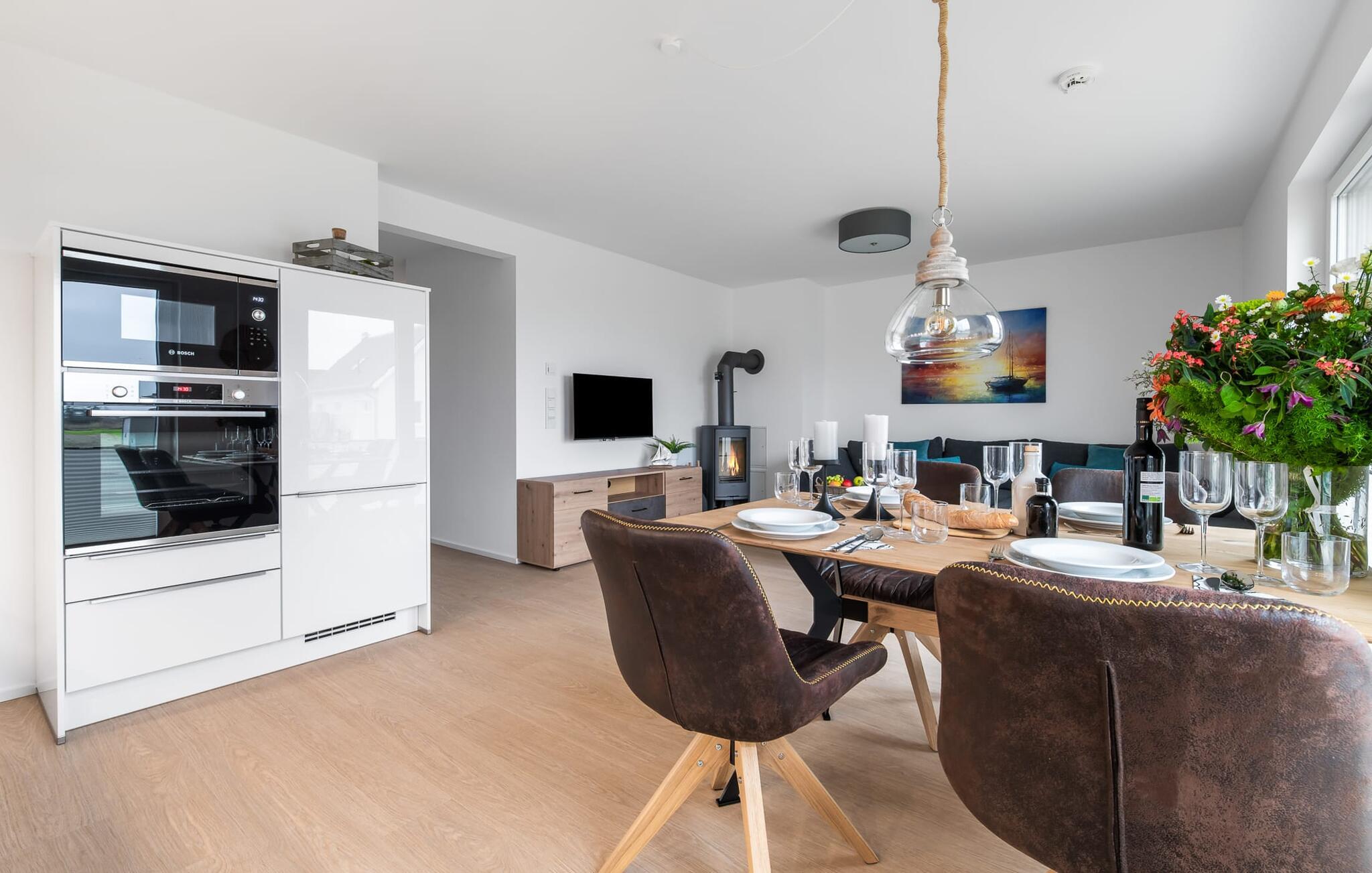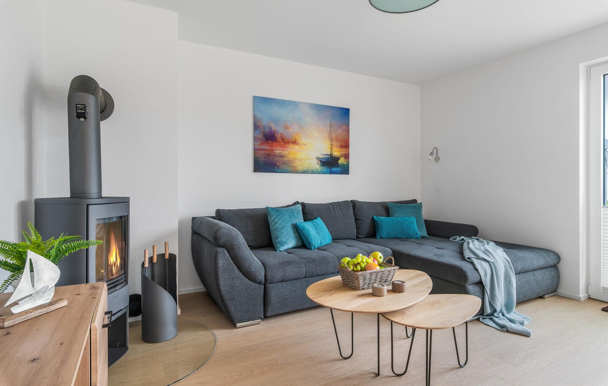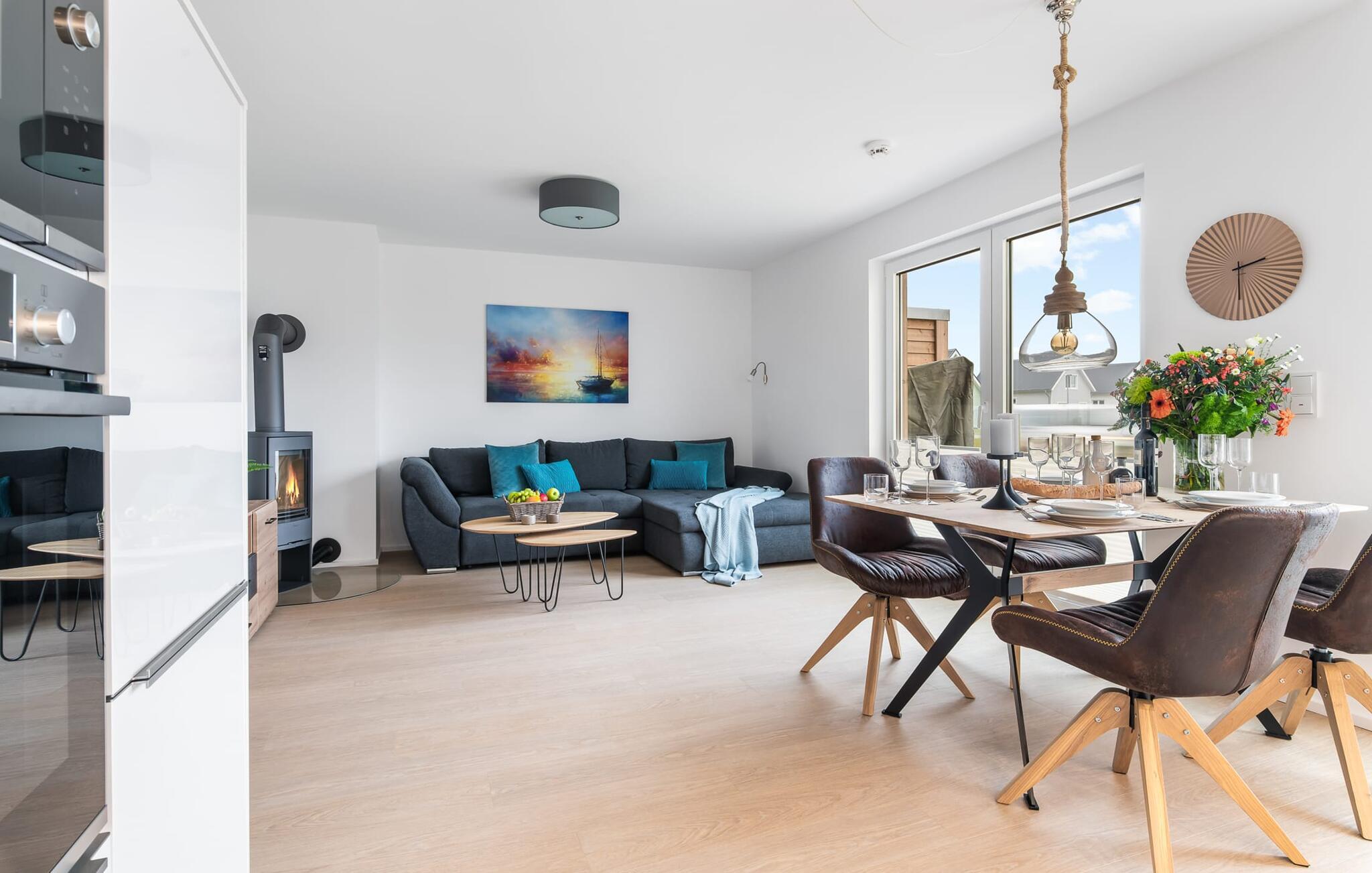 Mit seiner bodentiefen Fensterfront und der angrenzenden großen Terrasse ist der offene Wohn-/Essbereich das Herz der Wohnung. Hineinkommen und sich sofort Zuhause fühlen. Auf der Wohnlandschaft mit Kuschelfaktor zu entspannen oder fernsehen ist Entspannung und Erholung pur! BALTIC HOME lässt den Alltag immer mehr entrücken... Sollte das Wetter sich einmal von der nordischen Seite zeigen, sorgt der Kaminofen mit seinem prasselnden Feuer für weitere Behaglichkeit.