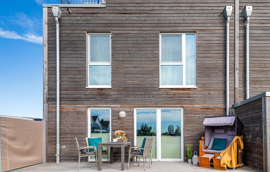 Direkt vom Wohnbereich der BALTIC HOME aus betretet ihr die große Terrasse mit Süd-Ausrichtung. Nach hinten ausgerichtet laden die bereitstehenden Gartenmöbel zu erholsamen Urlaubstagen ein.