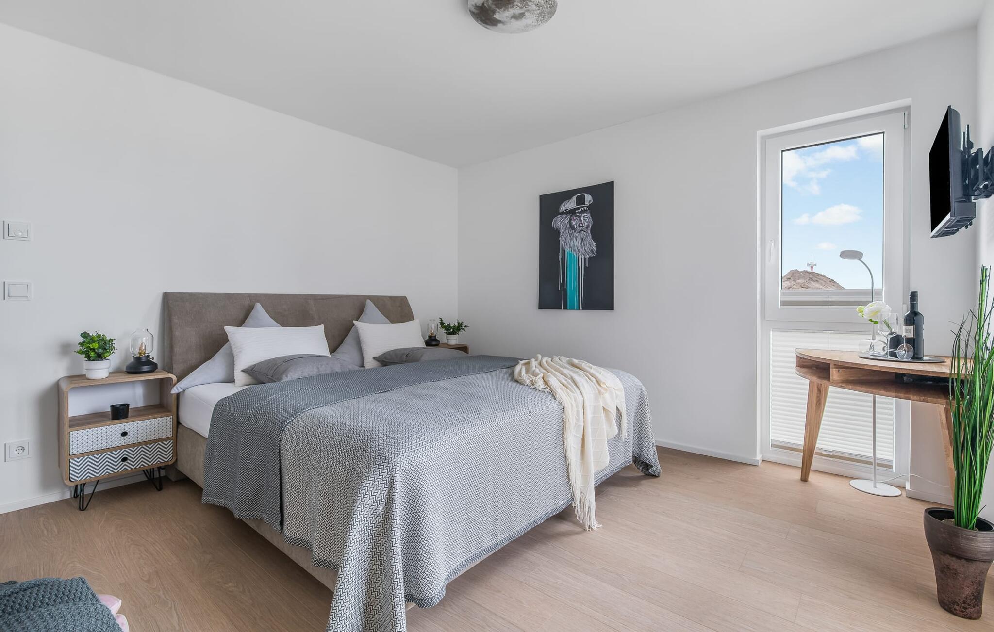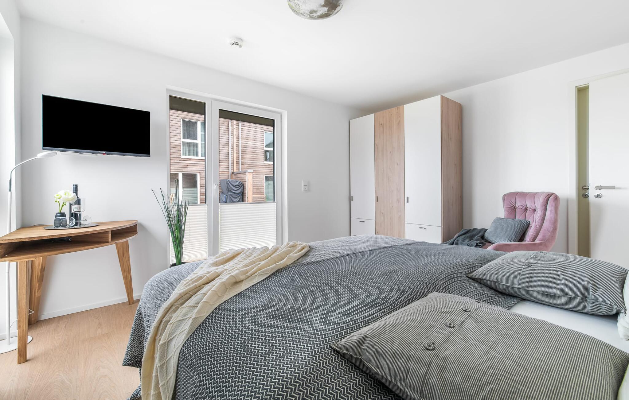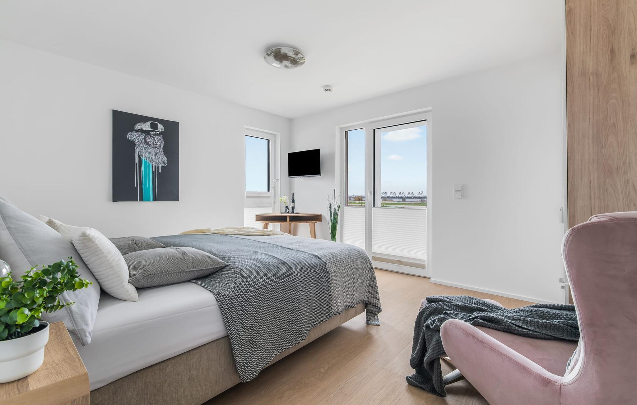 Bewusst abgelegen vom Familienleben im Wohnzimmer bietet BALTIC HOME für alle, die Homeoffice auch im Urlaub leben wollen, einen Arbeitsplatz im Schlafzimmer an. Von diesem könnt ihr zwischenzeitlich euren Blick auf den Hafen schweifen lassen oder eine kurze Pause auf der angrenzenden Terrasse einlegen.