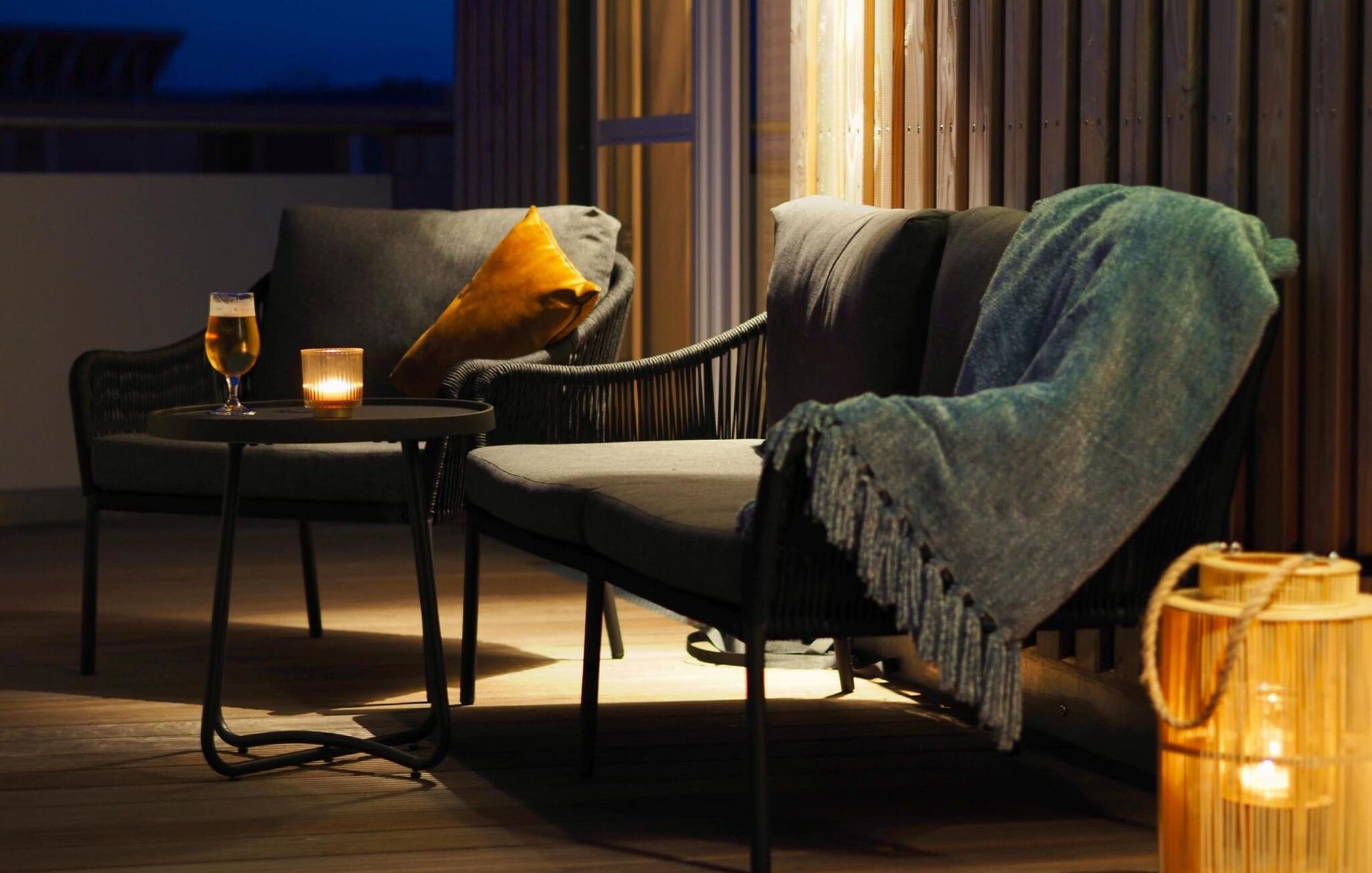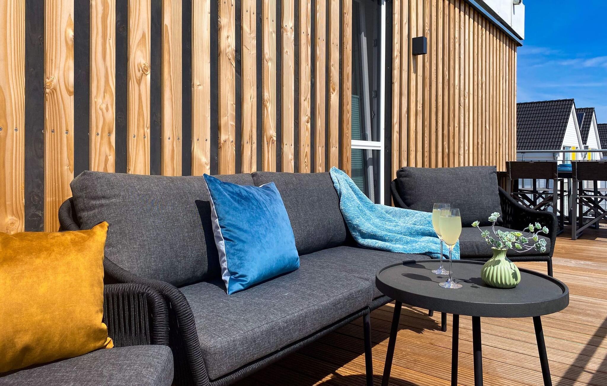 Unser Lieblingsplatz: auf dem rundum laufenden Balkon der Sonne hinterher wandern und mit einem Drink in der Hand den Wasserblick genießen.