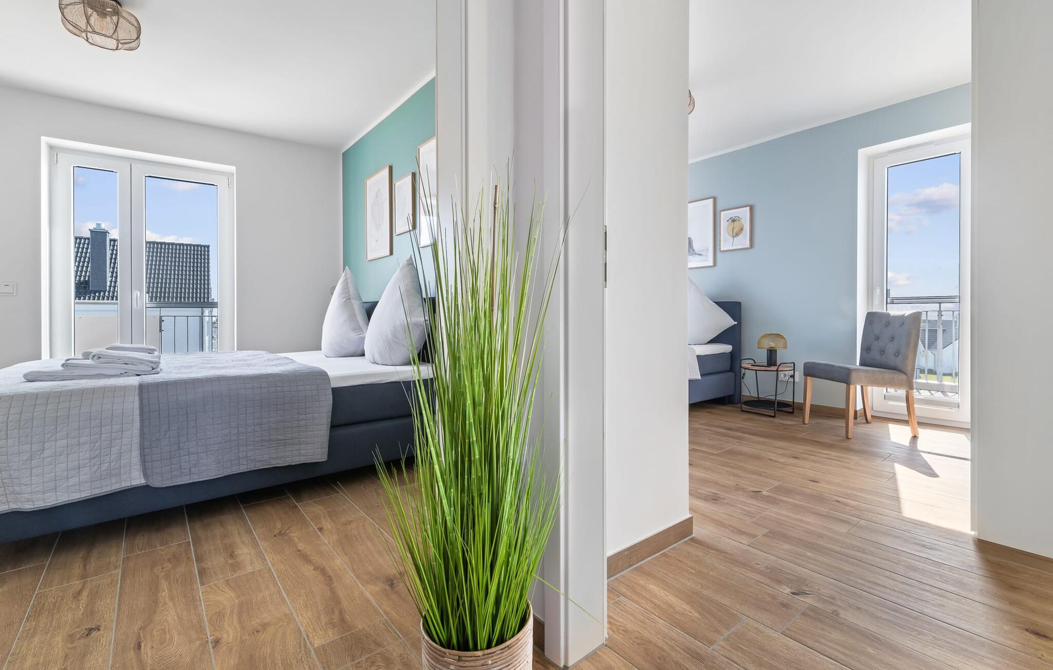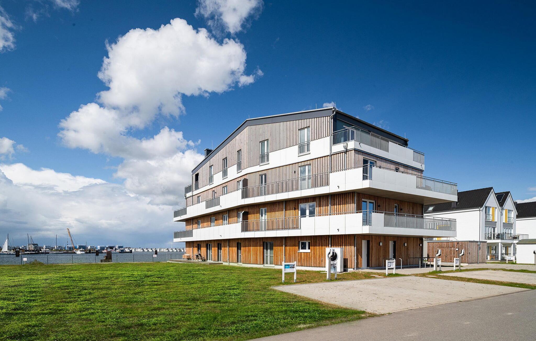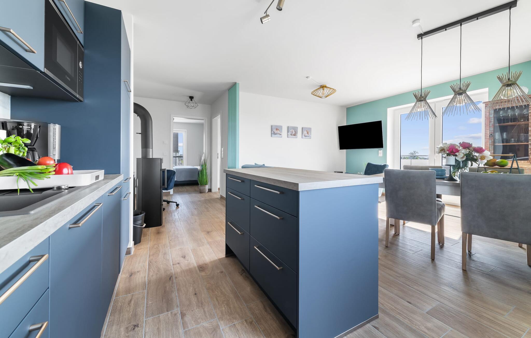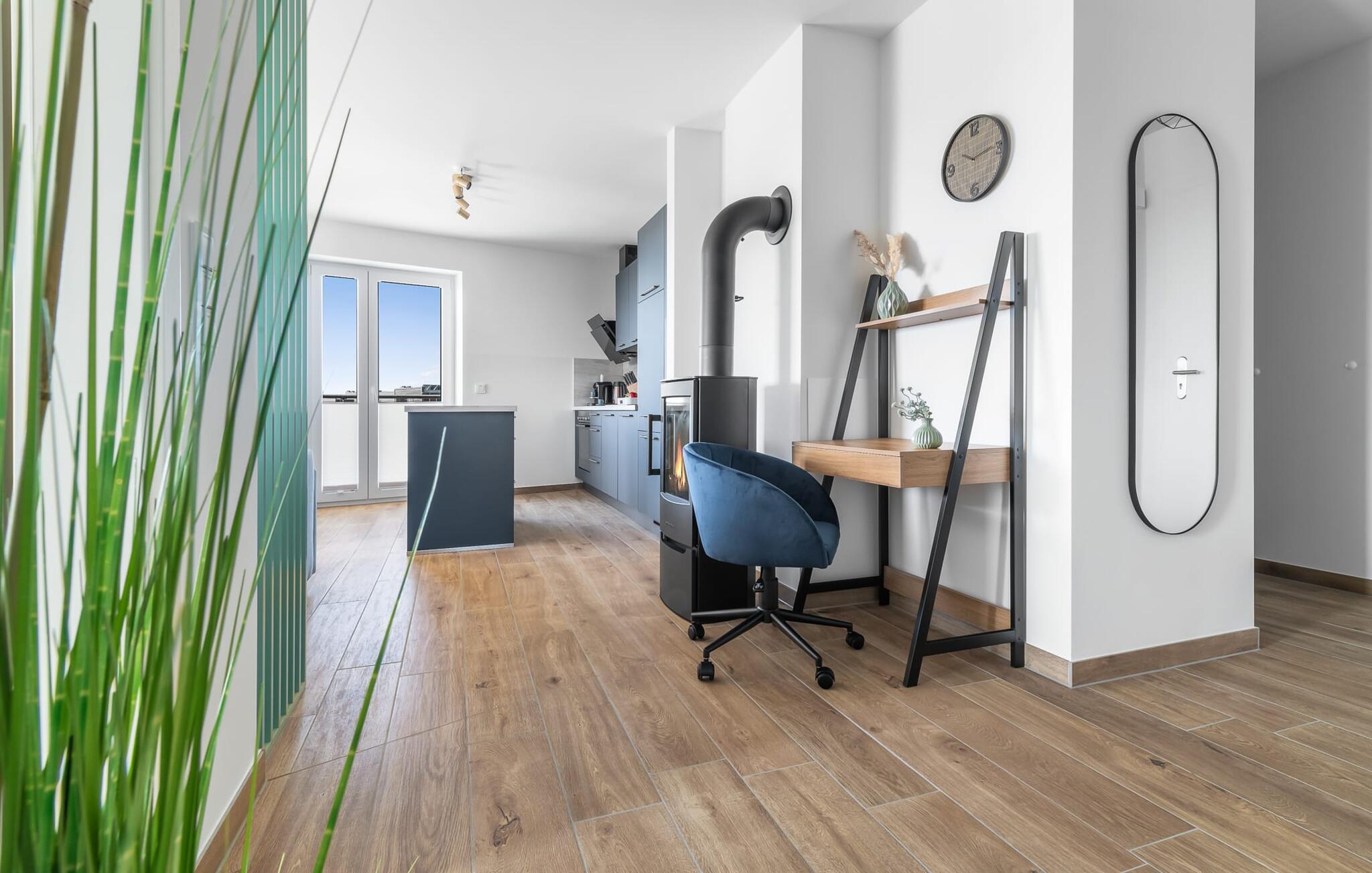 Der offene Wohn- und Essbereich mit integrierter, hochwertig ausgestatteter Küche gestaltet sich aufgrund der bodentiefen Fensterfront lichtdurchflutet und bietet einen einzigartigen Blick bis zur Ostsee. Der von jedem Raum zugängliche Rundum-Balkon ist der perfekte Ort, um sich zu erholen und dem Stress des Alltags zu entfliehen. Ob beim Sonnenbaden auf der Liege, beim Entspannen in der gemütlichen Loungeecke oder beim Genießen eines Sundowners mit Blick auf den Hafen - hier ist für alle was dabei.