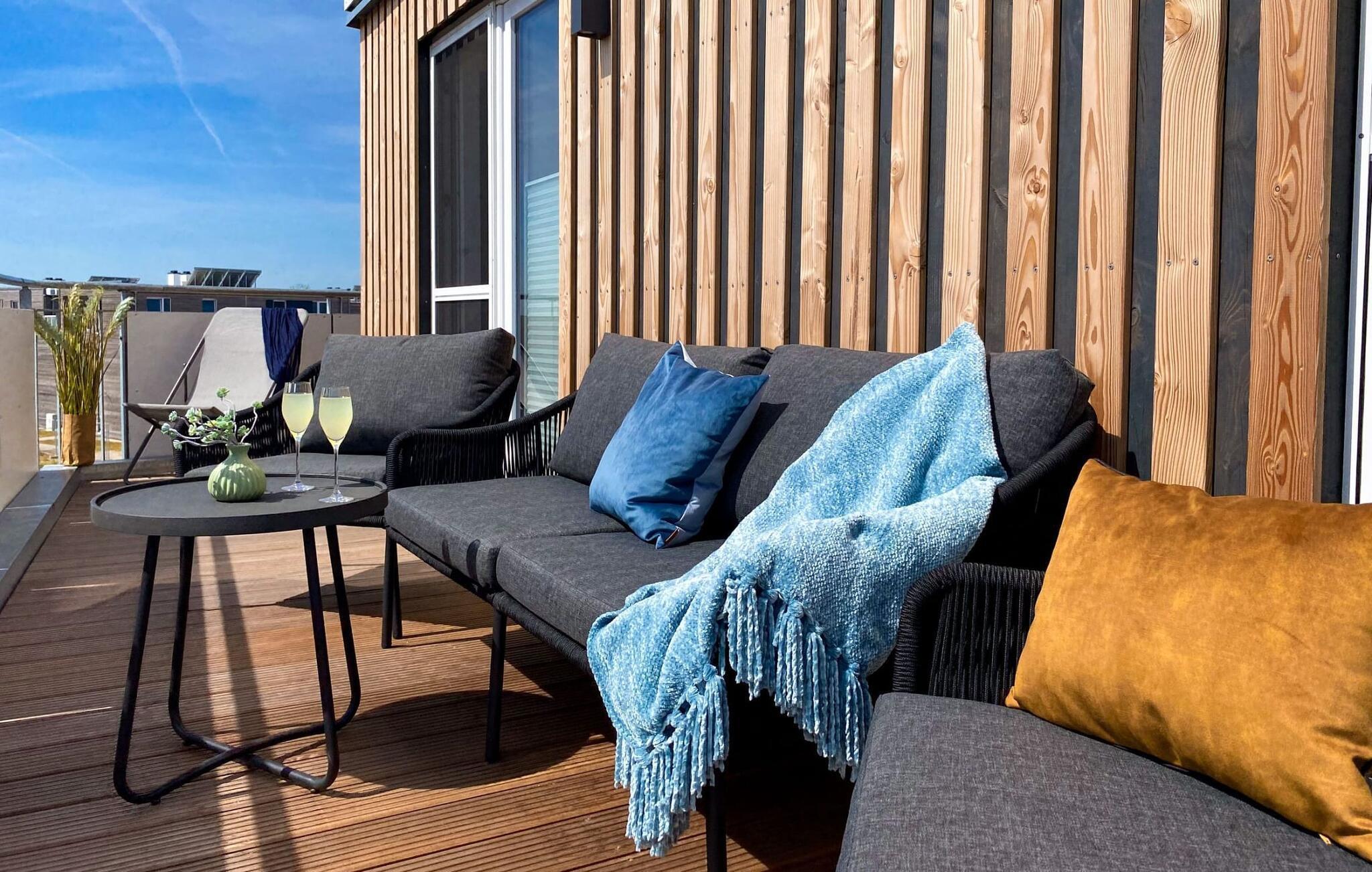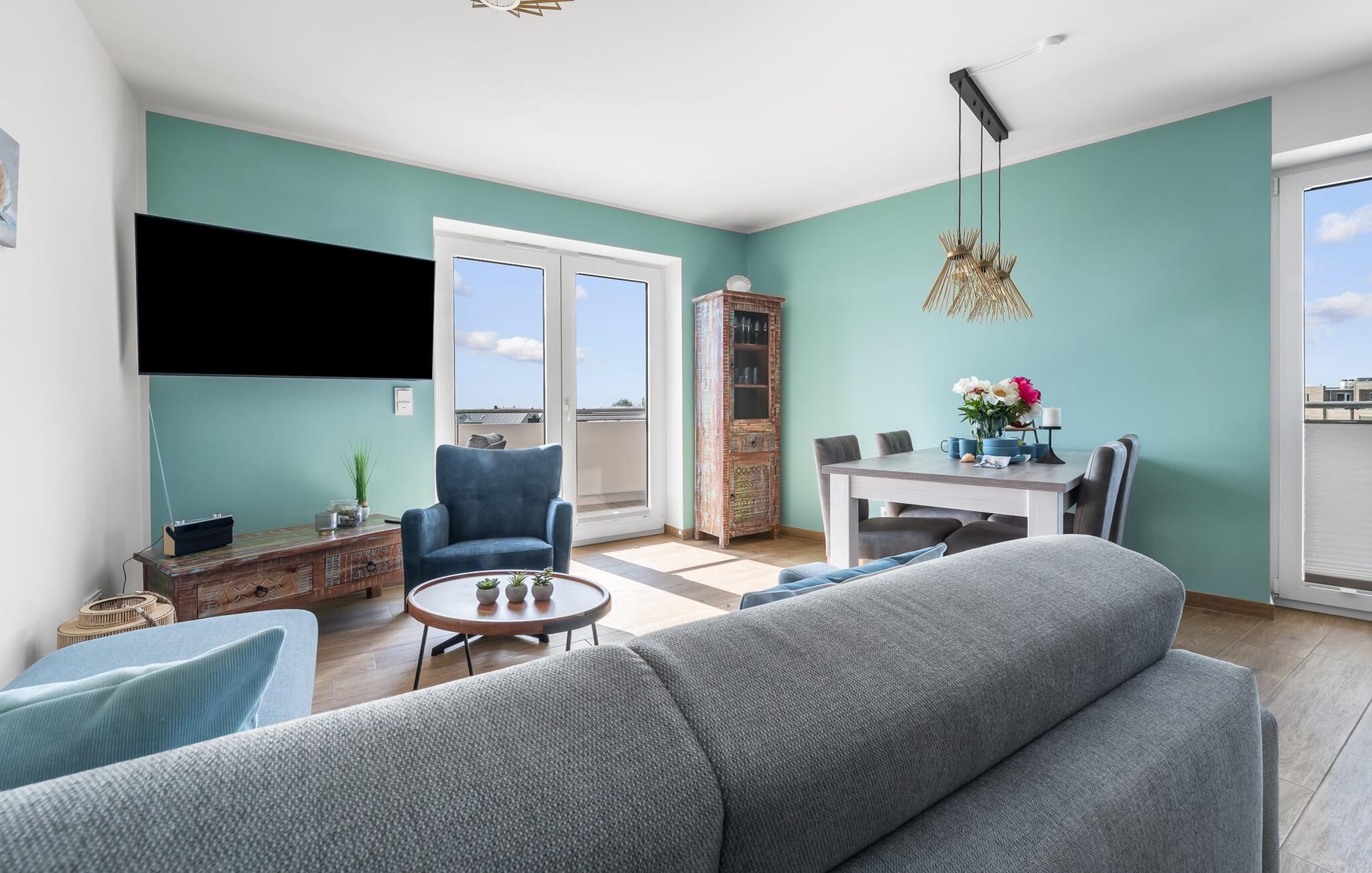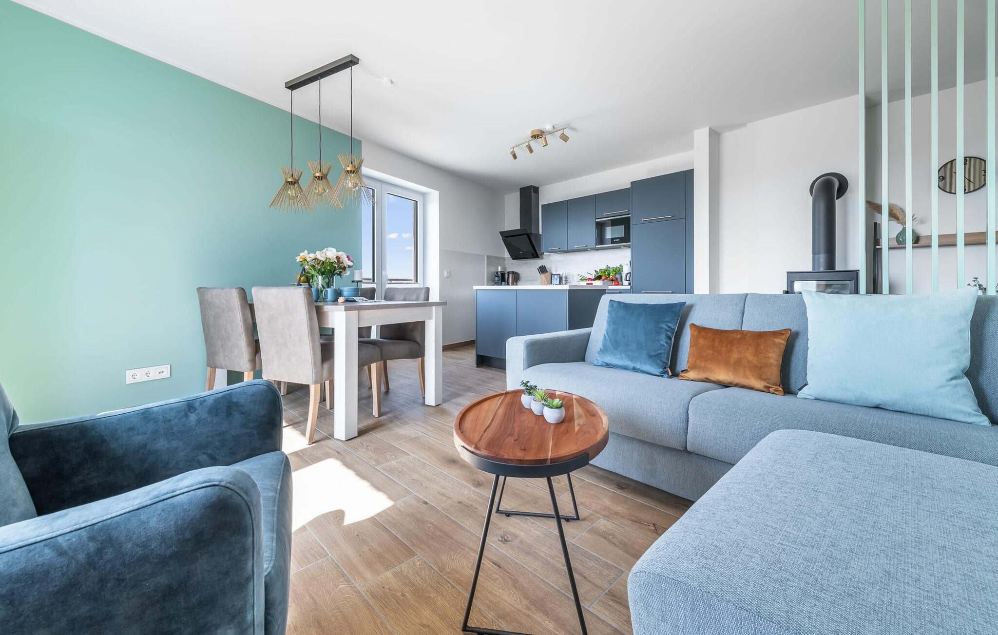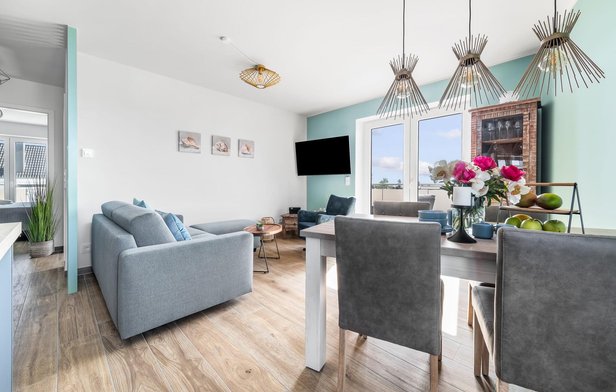 Der offene Wohn- und Essbereich mit integrierter, hochwertig ausgestatteter Küche gestaltet sich aufgrund der bodentiefen Fensterfront lichtdurchflutet und bietet einen einzigartigen Blick bis zur Ostsee. Der von jedem Raum zugängliche Rundum-Balkon ist der perfekte Ort, um sich zu erholen und dem Stress des Alltags zu entfliehen. Ob beim Sonnenbaden auf der Liege, beim Entspannen in der gemütlichen Loungeecke oder beim Genießen eines Sundowners mit Blick auf den Hafen - hier ist für alle was dabei.