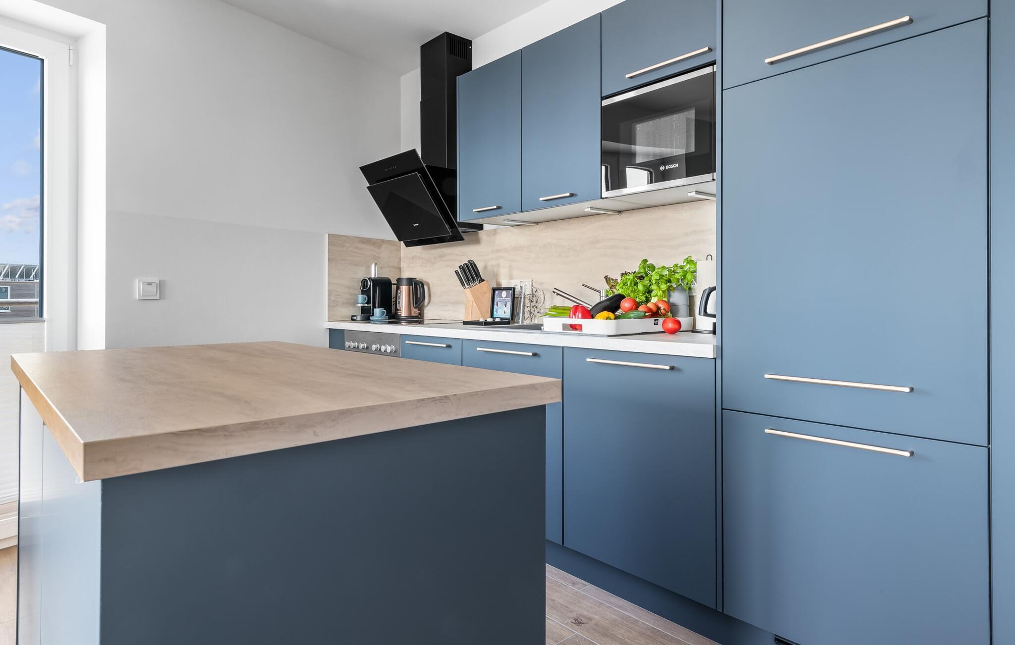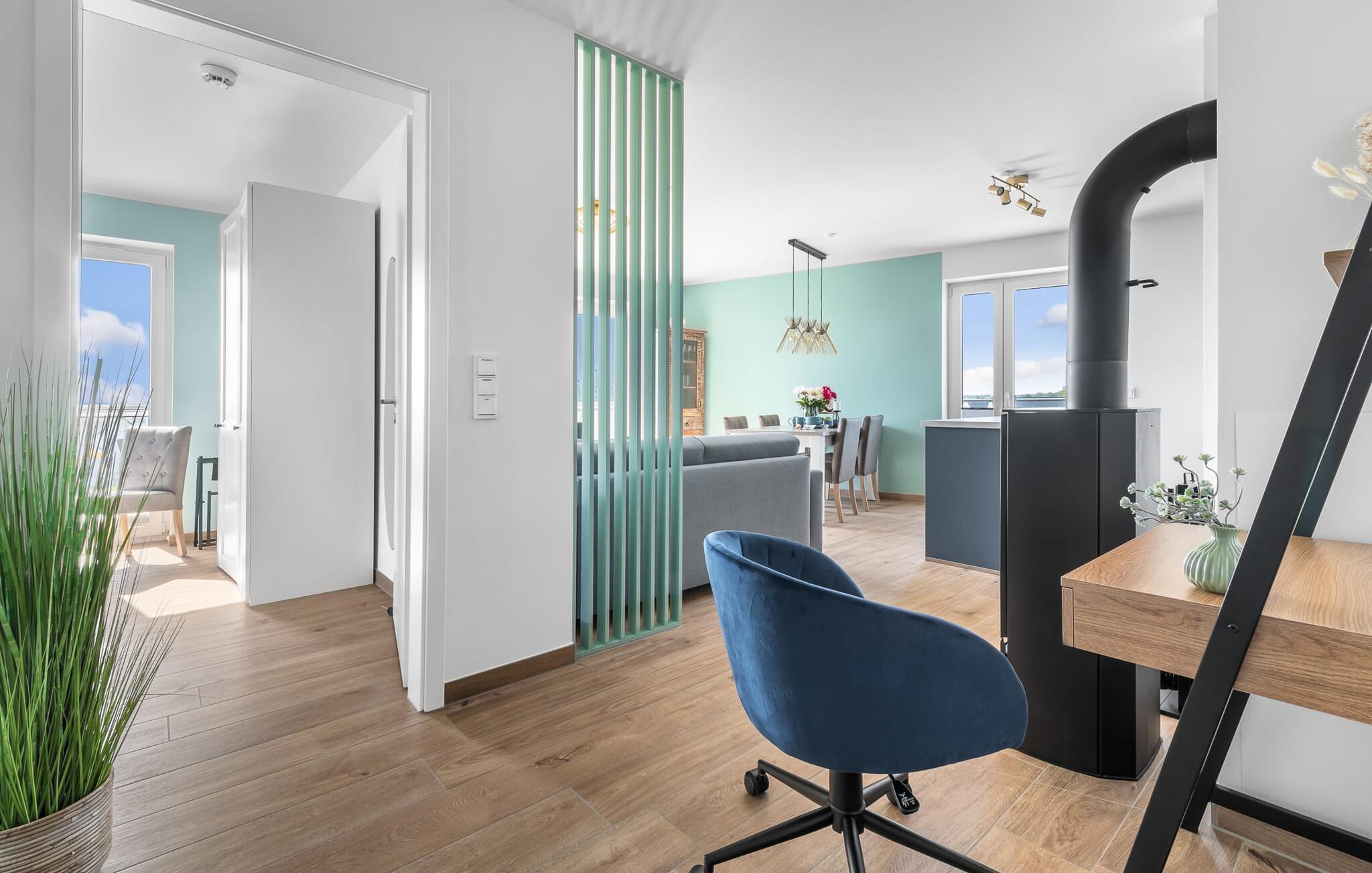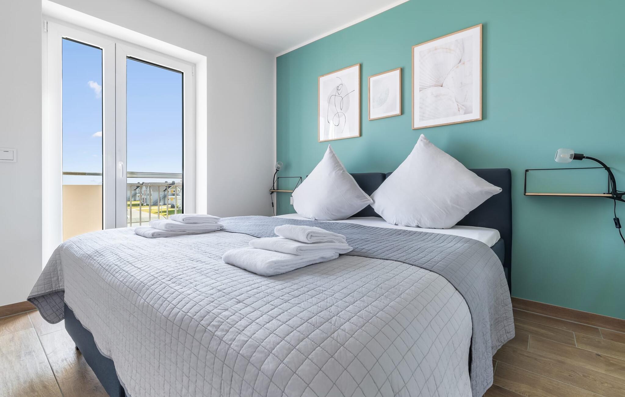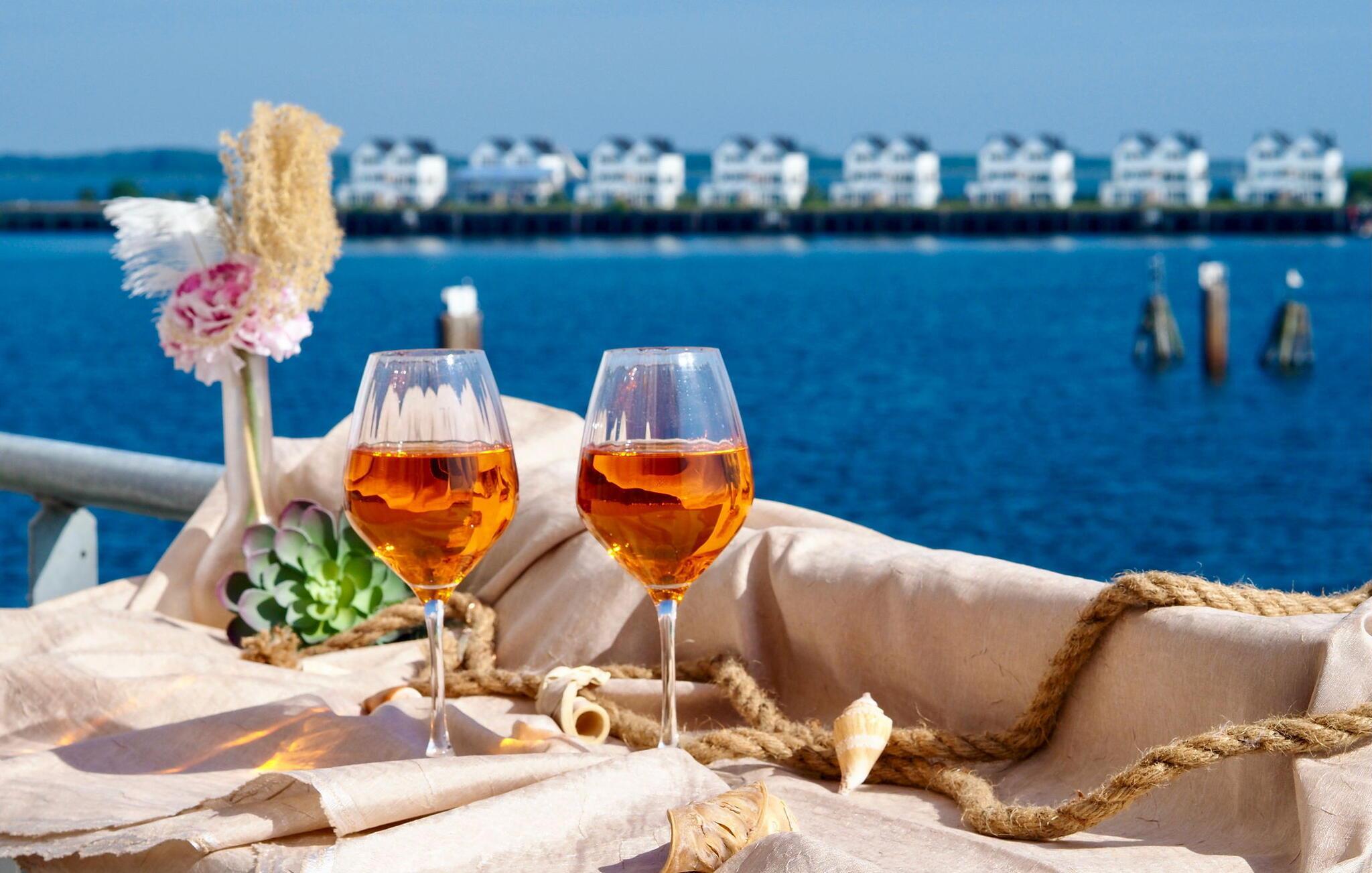 Der offene Wohn- und Essbereich mit integrierter, hochwertig ausgestatteter Küche gestaltet sich aufgrund der bodentiefen Fensterfront lichtdurchflutet und bietet einen einzigartigen Blick bis zur Ostsee. Der von jedem Raum zugängliche Rundum-Balkon ist der perfekte Ort, um sich zu erholen und dem Stress des Alltags zu entfliehen. Ob beim Sonnenbaden auf der Liege, beim Entspannen in der gemütlichen Loungeecke oder beim Genießen eines Sundowners mit Blick auf den Hafen - hier ist für alle was dabei.