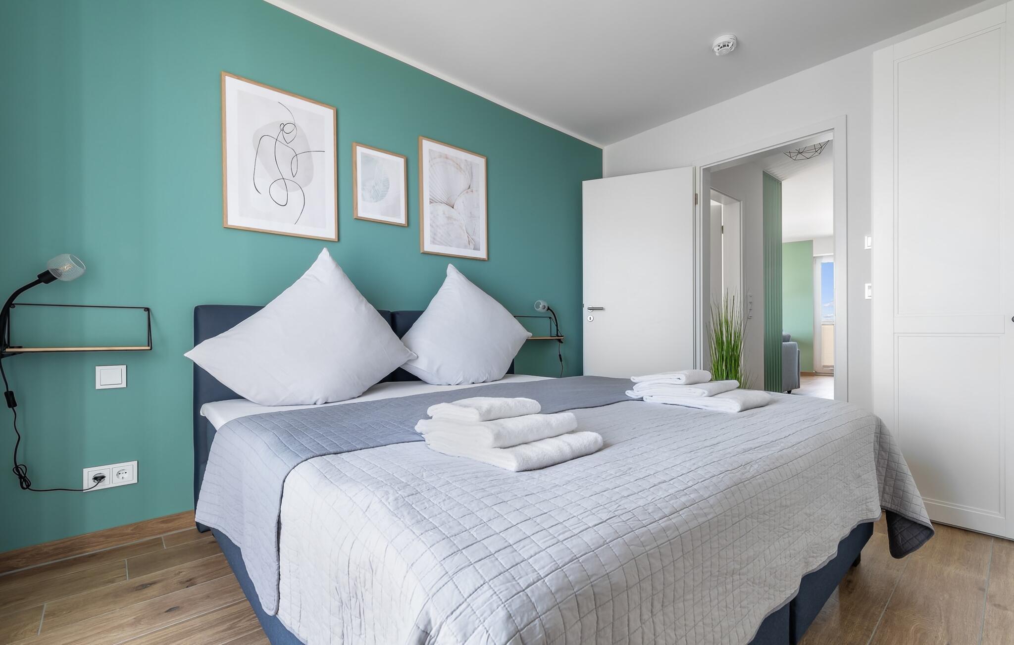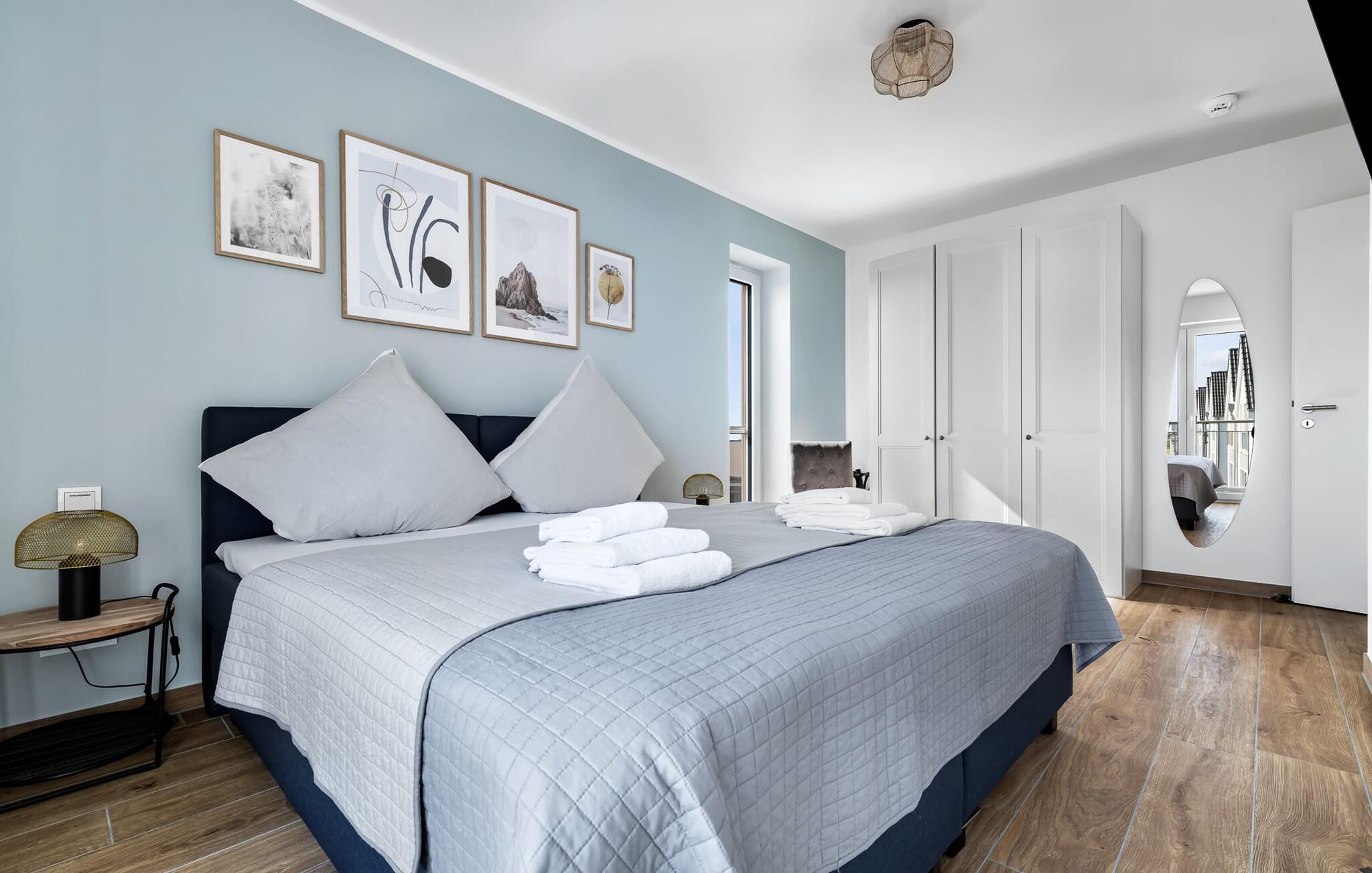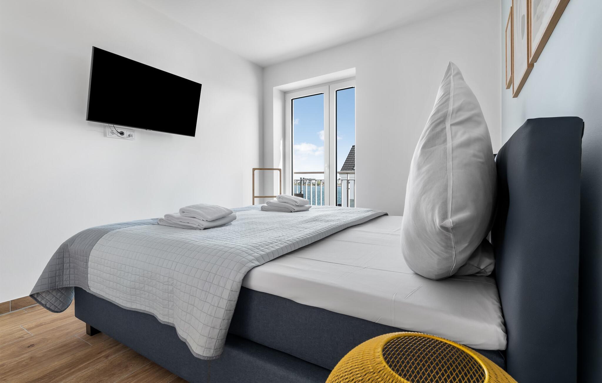 Ebenfalls hochwertig und geschmackvoll eingerichtet sind die beiden Schlafzimmer - beide mit einem unverwechselbaren Blick auf den Hafen. Sollte das Wetter mal zu grau für den Blick nach draußen sein, steht euch im Hauptschlafzimmer ein weiterer Fernseher zur Unterhaltung zur Verfügung. Dieses Schlafzimmer bietet ein Doppelbett, das zweite Schlafzimmer ist mit zwei Einzelbetten ausgestattet. Auf Wunsch können die Einzelbetten zu einem Doppelbett verstellt werden. Erholsamer Schlaf ist garantiert und die schönen Träume kommen dann wie von selbst.