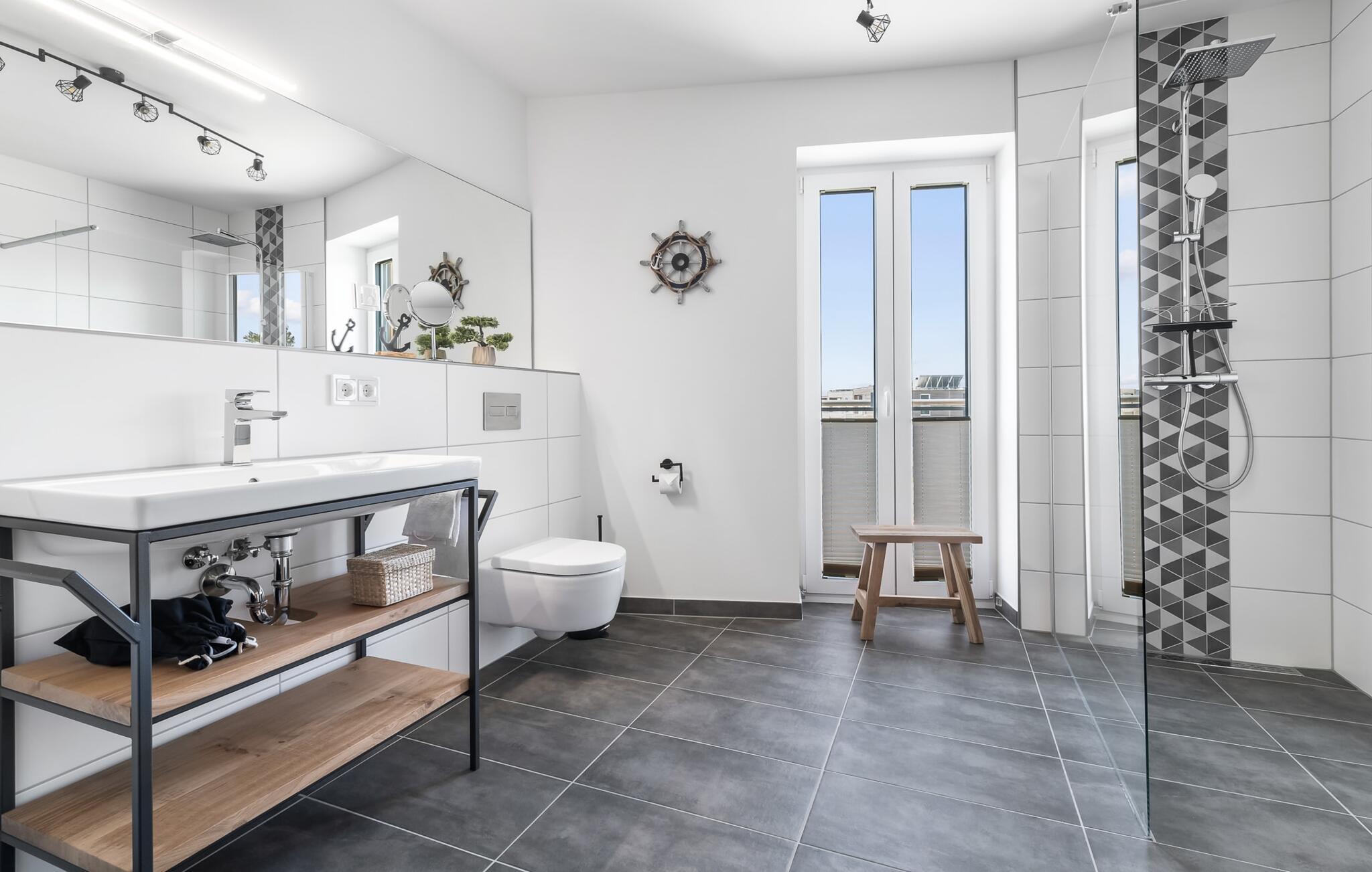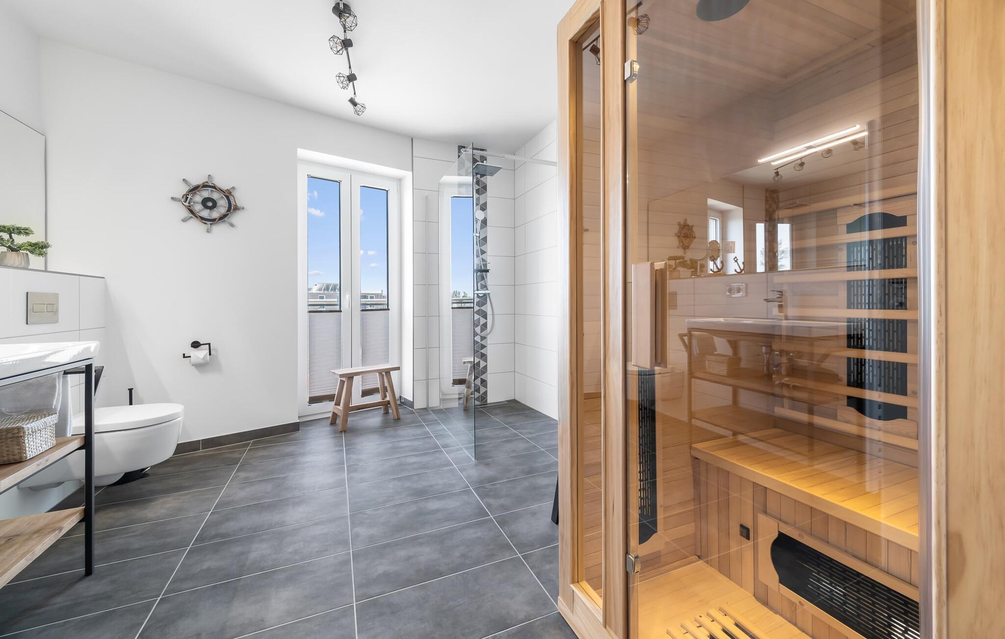 Eine weiteres Highlight ist das Duschbad. Neben allem Nützlichen, wie einem Waschtrockner, runden hier eine bodengleiche Regendusche und eine Infrarotkabine das Rundum-Wohlfühlerlebnis ab.