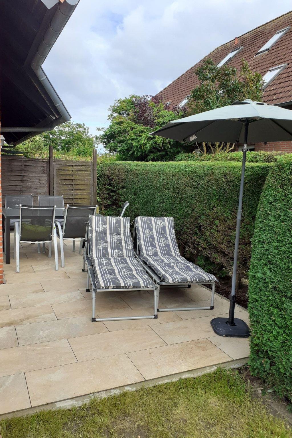 Die Terrasse ist mit Gartenmöbeln, Sonnenliegen und einem Sonnenschirm ausgestattet. Ein Grill steht Ihnen ebenfalls zur Verfügung. Entspannen können Sie sich auch im Strandkorb, Den Garten können Sie gern mitbenutzen. Ihr Auto parken Sie im Carport vor dem Haus. Dahinter befindet sich ein abschließbarer Abstellraum für Fahrräder oder andere Dinge.