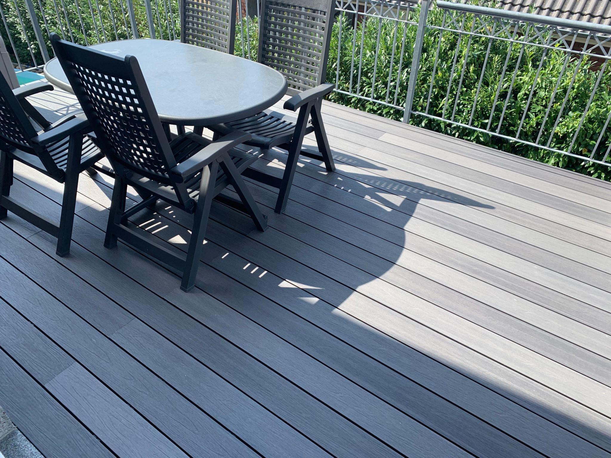 Auf dem Balkon stehen Gartenmöbel mit Sitzauflagen sowie ein Sonnenschirm zur Verfügung.
