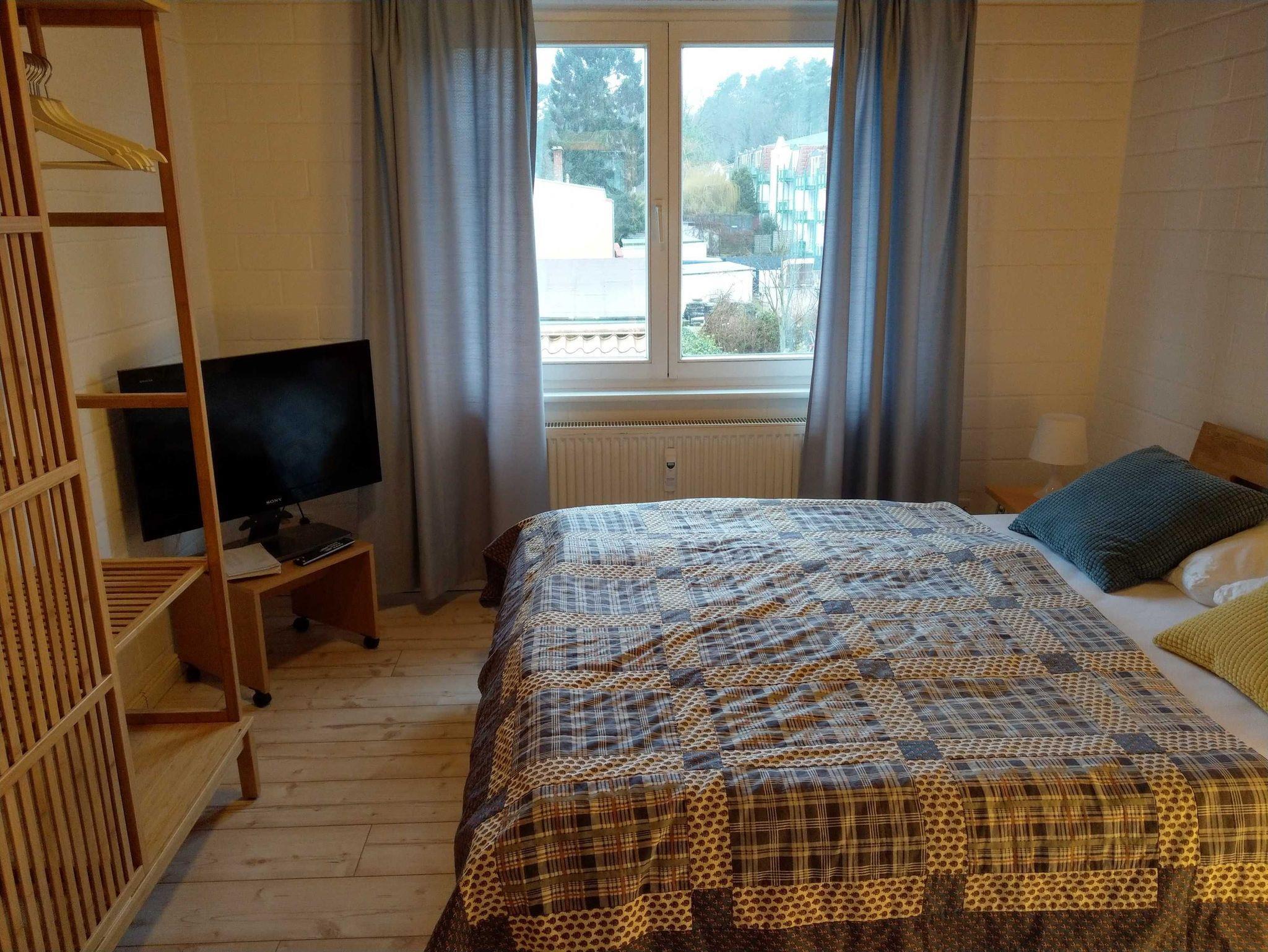 Im Obergeschoss befindet sich das Schlafzimmer mit Doppelbett und Fernseher und ein Kinderzimmer mit zwei Einzelbetten. Das Bad mit Dusche und WC hat auch eine Waschmaschine.