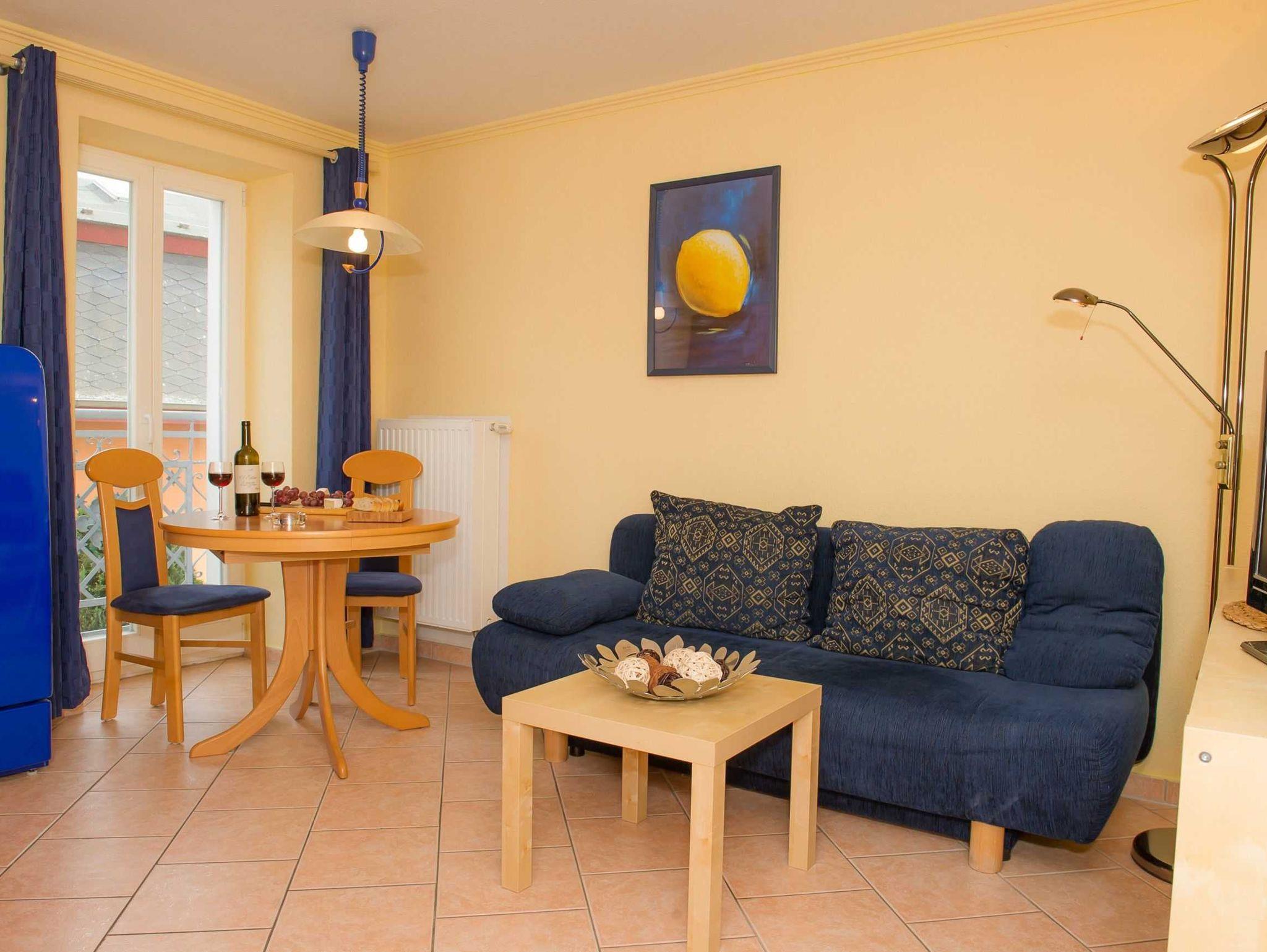Die gemütliche 2-Zimmer-Wohnung liegt in der ersten Etage der Villa Stadt Residenz - strandnah und zugleich dennoch zentral zwischen Schloonsee und Ostsee. Das Wohnesszimmer mit seinem französischen Balkon ist geschmackvoll eingerichtet, die integrierte Küchenzeile verfügt über Backenofen, Spülmaschine und Kühlschrank mit Gefrierfach, natürlich fehlen auch Toaster und Kaffeemaschine nicht. Im Schlafzimmer verspricht ein großes französisches Bett angenehmen Schlafkomfort, aber auch eine Aufbettung für zwei weitere Personen ist auf dem komfortablen Schlafsofa im Wohnbereich ist möglich. Das maritim eingerichtete Duschbad vervollständigt den Gesamteindruck der 32 qm großen Wohnung. Ein Waschraum mit Waschmaschine und Trockner steht den Hausgästen mittels Münzautomat zur Verfügung. Die Stadt Residenz verfügt über einen kleinen Wellnessbereich mit Sauna und Whirlpool, den die Hausgäste gegen Gebühr individuell nach Absprache nutzen können. Ideal zum Entspannen nach einem Strandspaziergang in den Herbst-, Winter- und Frühjahrsmonaten.