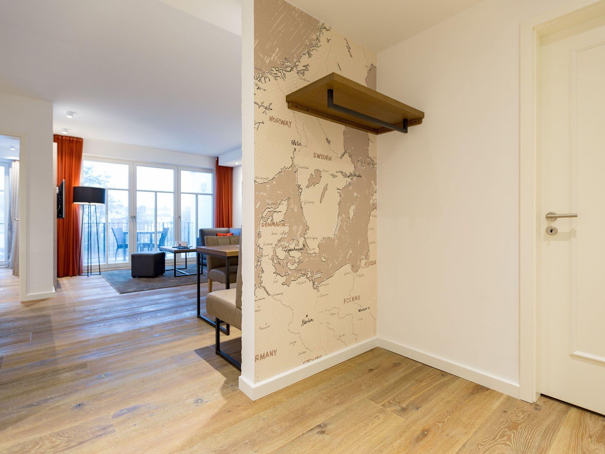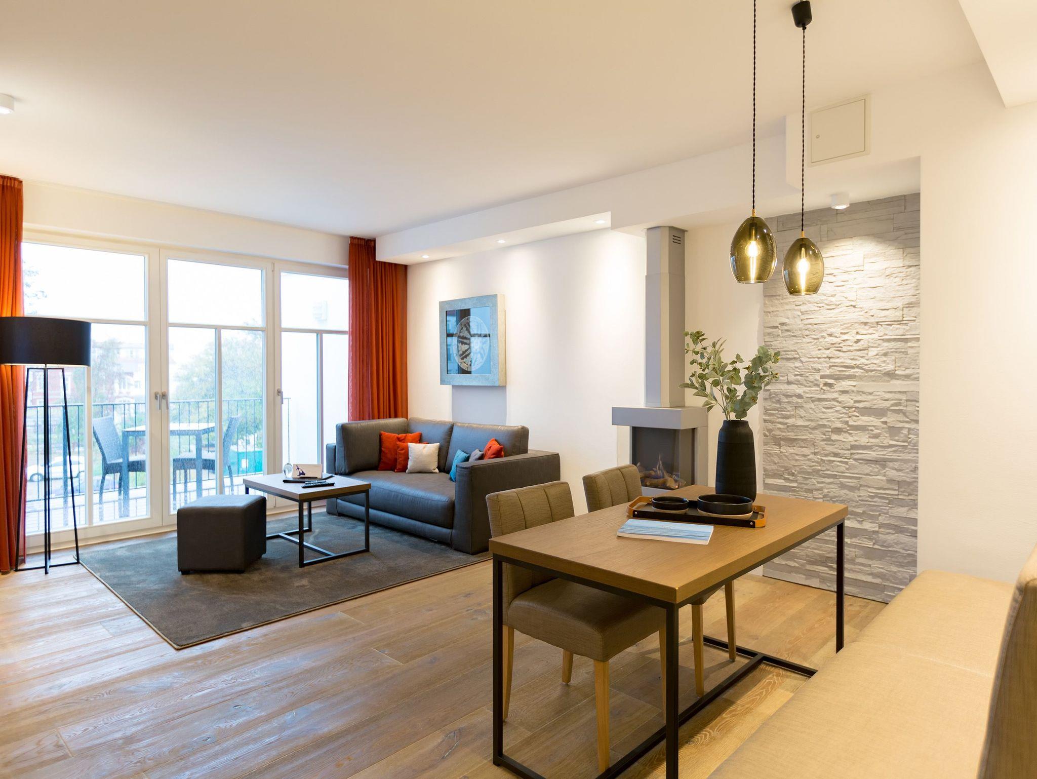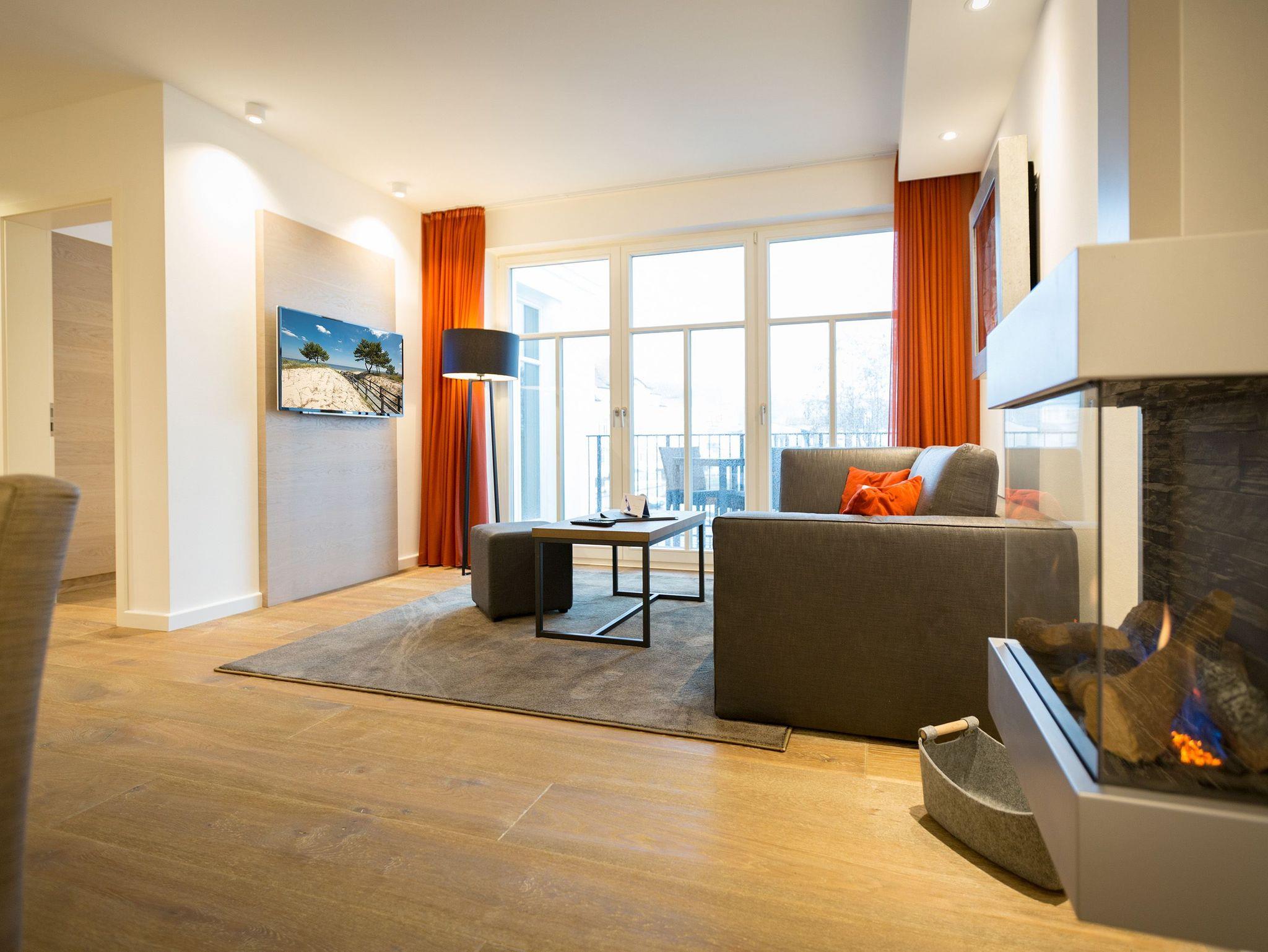 Reinkommen, durchatmen und wohlfühlen ? so schnell geht das Ankommen in diesem wunderschönen Urlaubsdomizil in der 3. Etage. Zwei helle und von Designerhand konzipierte Räume warten nur darauf, Ihnen die Urlaubszeit an der Ostsee so komfortabel und erholsam wie möglich zu machen. In dem 53 Quadratmeter großen Paradies ist Platz für zwei Personen und ein Kleinkind bis drei Jahre (im Kinderreisebett). Holz, Stein, edle Stoffe ? Materialien, die für eine wunderbar warme Atmosphäre sorgen. Dezente Farbtupfer lockern auf. Die bodentiefen Fenster lassen viel Licht ins Innere. Vom Wohnzimmer können Sie direkt auf den kleinen Balkon (7 Quadratmeter) mit Nordwest-Ausrichtung hinaustreten und die Ostseeweite in sich aufnehmen. Gönnen Sie Ihren Augen einen entspannenden Blick und Ihrer Nase einen tiefen Atemzug der frischen Meeresbrise. Das Interieur der beiden Zimmer ist stilvoll und elegant. Ein bequemes Sofa, ein schöner Essplatz, ein großer Flat-TV, eine Bose-Anlage mit Bluetooth, ein Kamin, bei dem Sie per Knopfdruck kuschelige Wärme produzieren können ? was will man mehr. Ein durchdachtes Lichtdesign bringt Licht an genau die richtigen Stellen. In der offenen Wohnküche lässt es sich ausgesprochen gut kochen. Denn die Geräte sind hochwertige Markengeräte. Hier finden Sie alles, was Sie brauchen, unter anderem auch edles Geschirr. Doch die Entspannung im Urlaub hört nicht an der Schlafzimmertür auf. Ein komfortables Boxspringdoppelbett (1,80 m x 2,00 m) und ein weiterer Flat-TV bringen Auszeitvergnügen auch hier. Vom Schlafzimmer aus haben Sie ebenfalls einen Zugang zum Balkon. Ein geräumiger Schrank bietet viel Stauraum. Im Badezimmer bringt Sie eine Finnische Sauna gehörig ins Schwitzen. Abkühlen können Sie sich nach dem Hitzegang unter der Regendusche, die natürlich auch warmes Wasser zu bieten hat. Ein Waschtisch und ein WC gehören außerdem zur Ausstattung des Bades. Wollen Sie Ihre Sachen auch im Urlaub einmal waschen, können Sie das mittels des Wasch-Trockners im kleinen Hauswirtschaftsraum. Rundum sorglos heißt auch, dass bei Anreise die Betten bereits bezogen sind, Handtücher für Sie bereit liegen und das WLAN in der Wohnung kostenfrei ist. Ihr Auto können Sie auf dem für dieses Appartement vorgesehenen Stellplatz 27 abstellen.