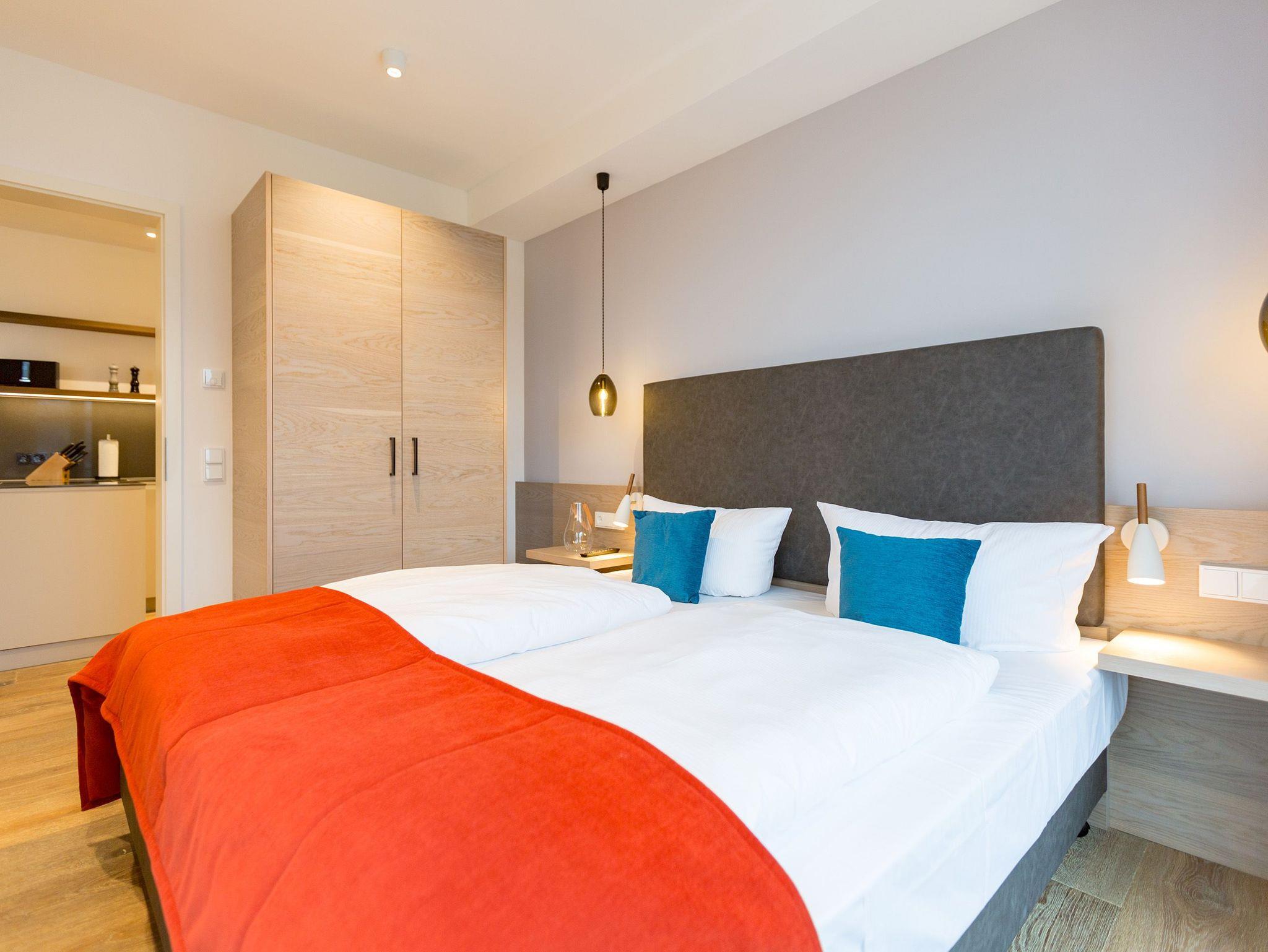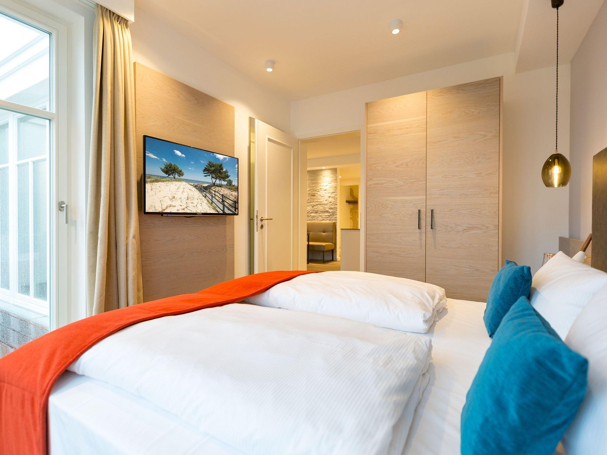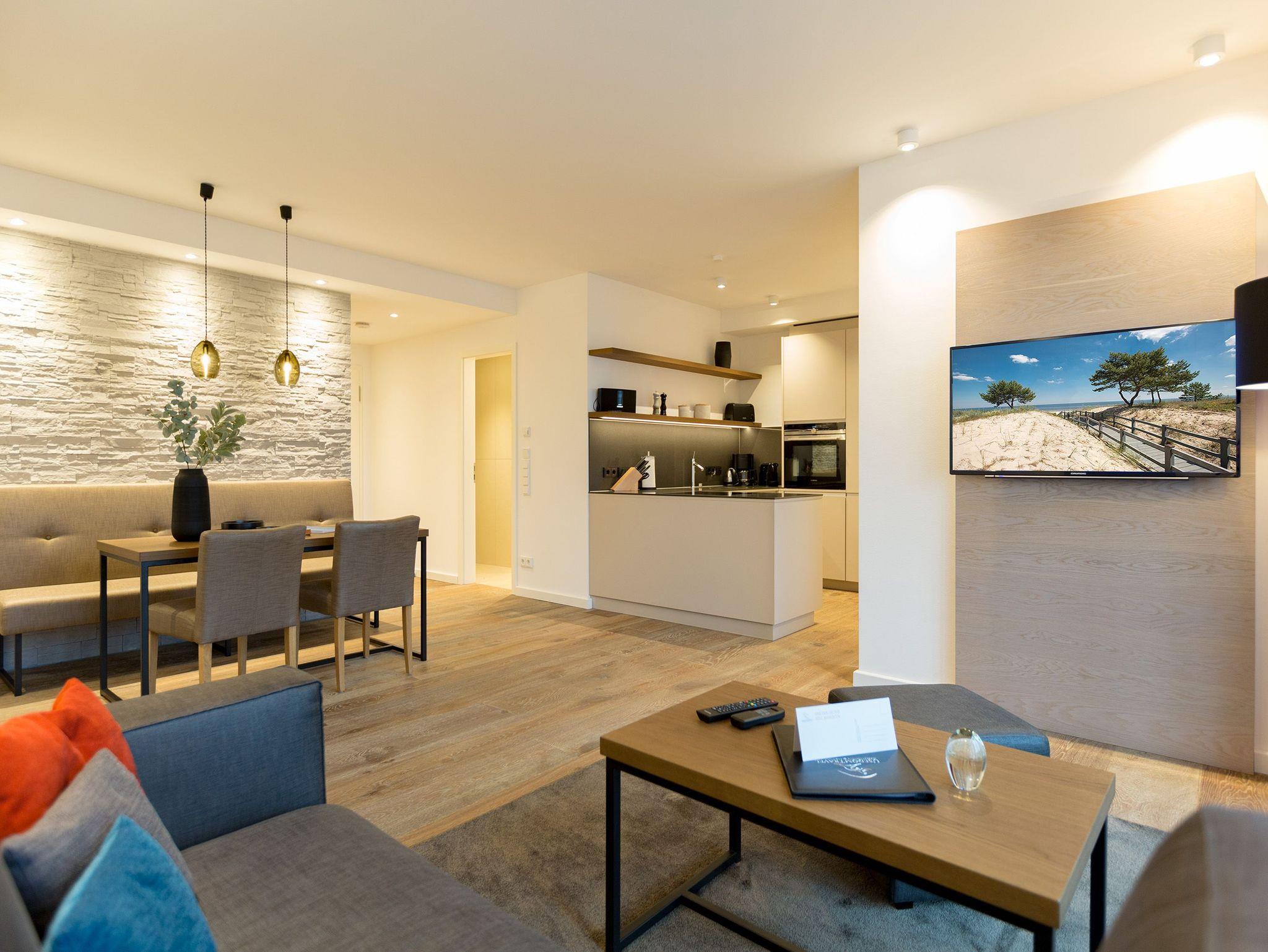 Reinkommen, durchatmen und wohlfühlen so schnell geht das Ankommen in diesem wunderschönen Urlaubsdomizil in der 3. Etage. Zwei helle und von Designerhand konzipierte Räume warten nur darauf, Ihnen die Urlaubszeit an der Ostsee so komfortabel und erholsam wie möglich zu machen. In dem 53 Quadratmeter großen Paradies ist Platz für zwei Personen und ein Kleinkind bis drei Jahre (im Kinderreisebett). Holz, Stein, edle Stoffe Materialien, die für eine wunderbar warme Atmosphäre sorgen. Dezente Farbtupfer lockern auf. Die bodentiefen Fenster lassen viel Licht ins Innere. Vom Wohnzimmer können Sie direkt auf den kleinen Balkon (7 Quadratmeter) mit Nordwest-Ausrichtung hinaustreten und die Ostseeweite in sich aufnehmen. Gönnen Sie Ihren Augen einen entspannenden Blick und Ihrer Nase einen tiefen Atemzug der frischen Meeresbrise. Das Interieur der beiden Zimmer ist stilvoll und elegant. Ein bequemes Sofa, ein schöner Essplatz, ein großer Flat-TV, eine Bose-Anlage mit Bluetooth, ein Kamin, bei dem Sie per Knopfdruck kuschelige Wärme produzieren können was will man mehr. Ein durchdachtes Lichtdesign bringt Licht an genau die richtigen Stellen. In der offenen Wohnküche lässt es sich ausgesprochen gut kochen. Denn die Geräte sind hochwertige Markengeräte. Hier finden Sie alles, was Sie brauchen, unter anderem auch edles Geschirr. Doch die Entspannung im Urlaub hört nicht an der Schlafzimmertür auf. Ein komfortables Boxspringdoppelbett (1,80 m x 2,00 m) und ein weiterer Flat-TV bringen Auszeitvergnügen auch hier. Vom Schlafzimmer aus haben Sie ebenfalls einen Zugang zum Balkon. Ein geräumiger Schrank bietet viel Stauraum. Im Badezimmer bringt Sie eine Finnische Sauna gehörig ins Schwitzen. Abkühlen können Sie sich nach dem Hitzegang unter der Regendusche, die natürlich auch warmes Wasser zu bieten hat. Ein Waschtisch und ein WC gehören außerdem zur Ausstattung des Bades. Wollen Sie Ihre Sachen auch im Urlaub einmal waschen, können Sie das mittels des Wasch-Trockners im kleinen Hauswirtschaftsraum. Rundum sorglos heißt auch, dass bei Anreise die Betten bereits bezogen sind, Handtücher für Sie bereit liegen und das WLAN in der Wohnung kostenfrei ist. Ihr Auto können Sie auf dem für dieses Appartement vorgesehenen Stellplatz 27 abstellen.