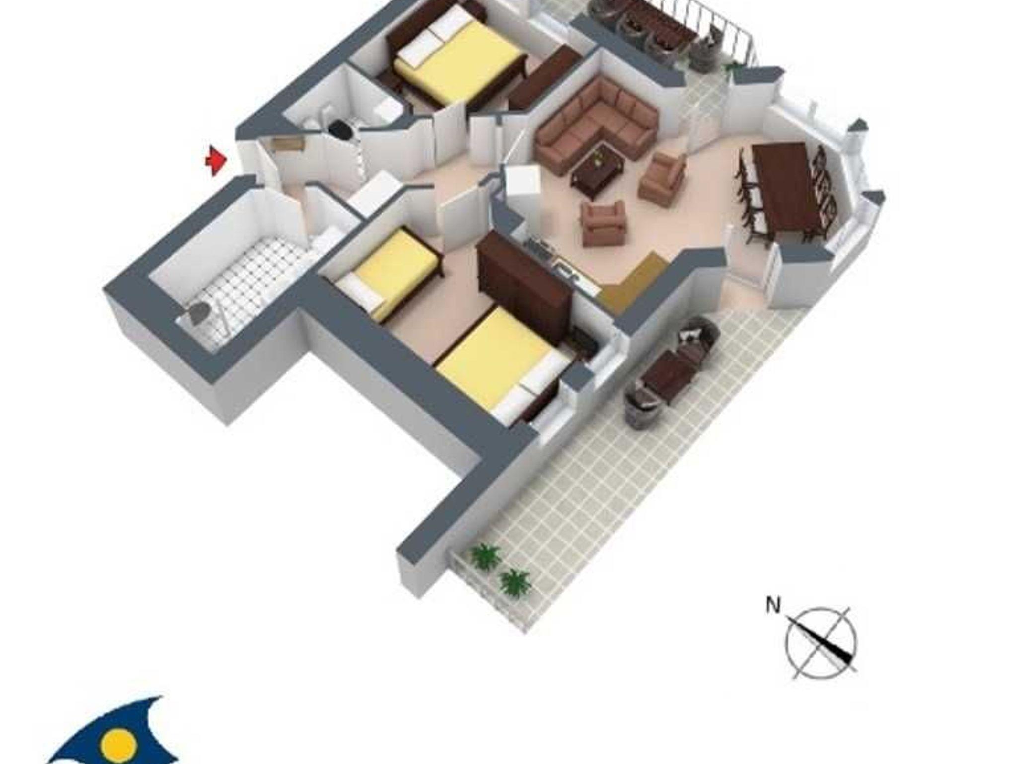 Zu der Wohnung gehören ein Wohnzimmer mit Küchenzeile und Essecke, ein Schlafzimmer mit Doppelbett, ein weiteres Schlafzimmer mit Doppel- und Etagenbett, ein Badezimmer mit Dusche und WC inkl. Kosmetikspiegel sowie ein Gäste WC.