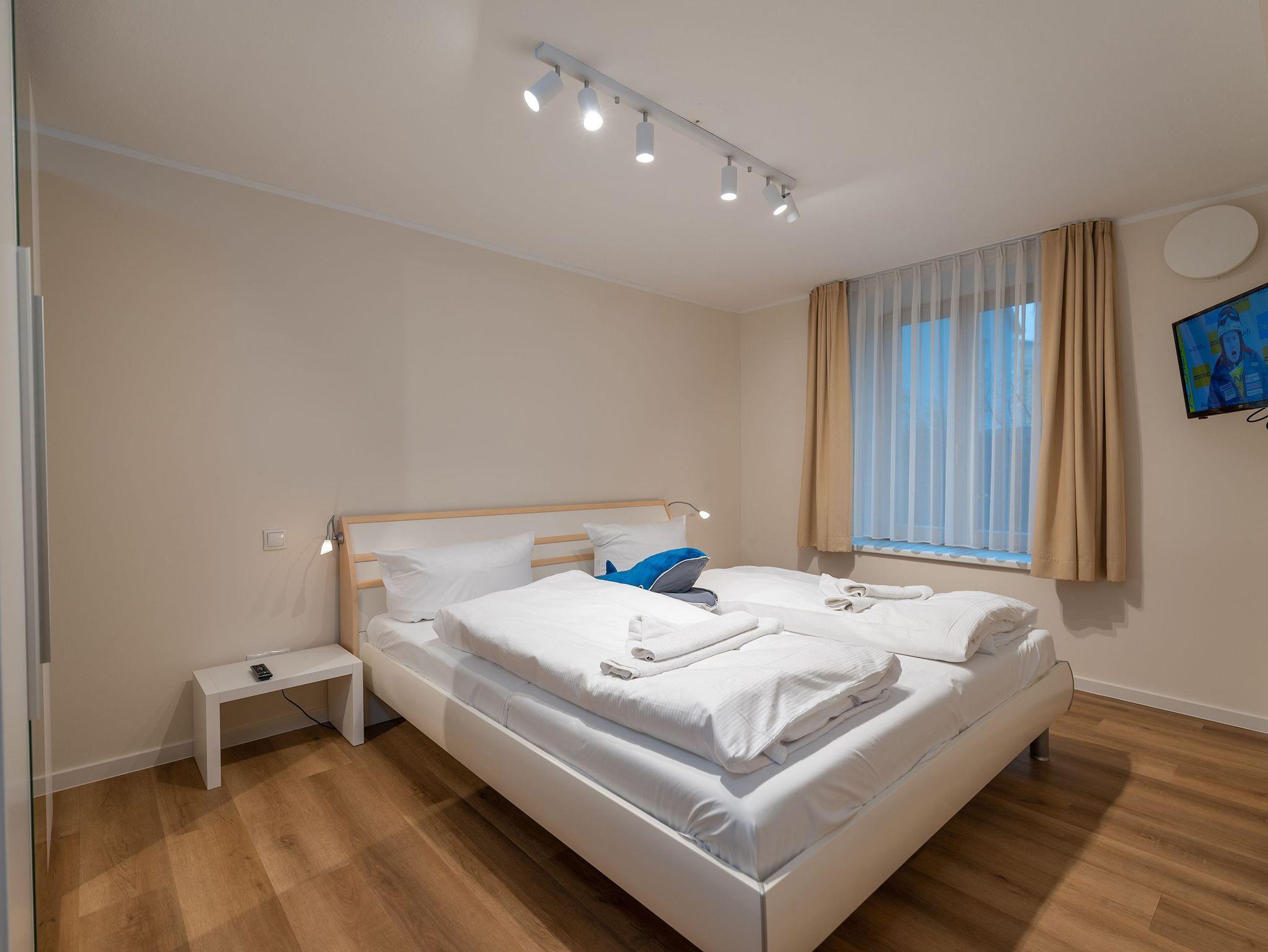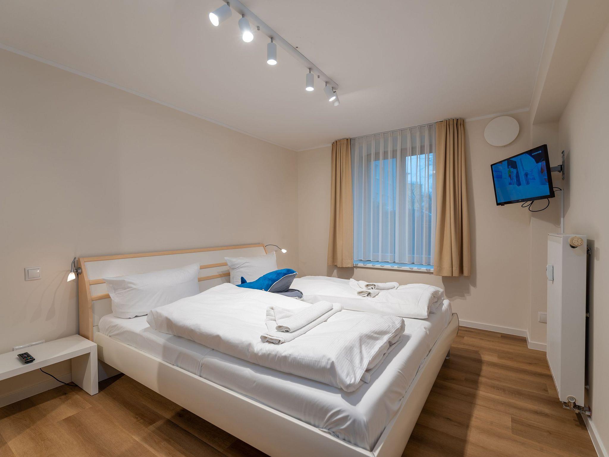 Das separate Schlafzimmer bietet ein gemütliches Doppelbett, einen wandmontierten Flachbild-TV und einen geräumigen Kleiderschrank ideal für längere Aufenthalte. Im modernen Tageslicht-Badezimmer mit Eckdusche, Waschbecken und WC sorgt ein großes Fenster für angenehmes Licht und frische Luft.