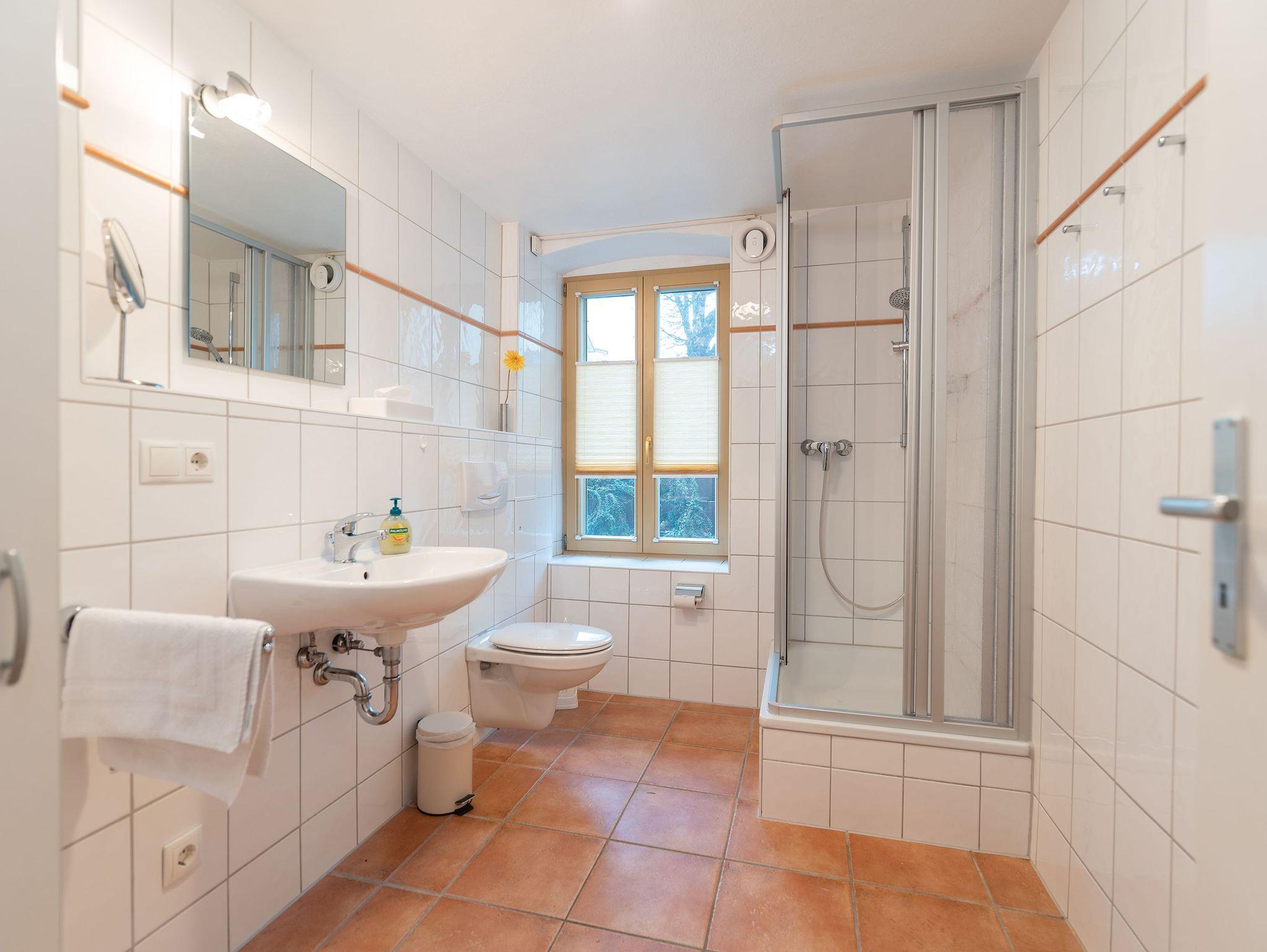 • Tageslicht-Bad mit Eckdusche, Waschbecken und WC