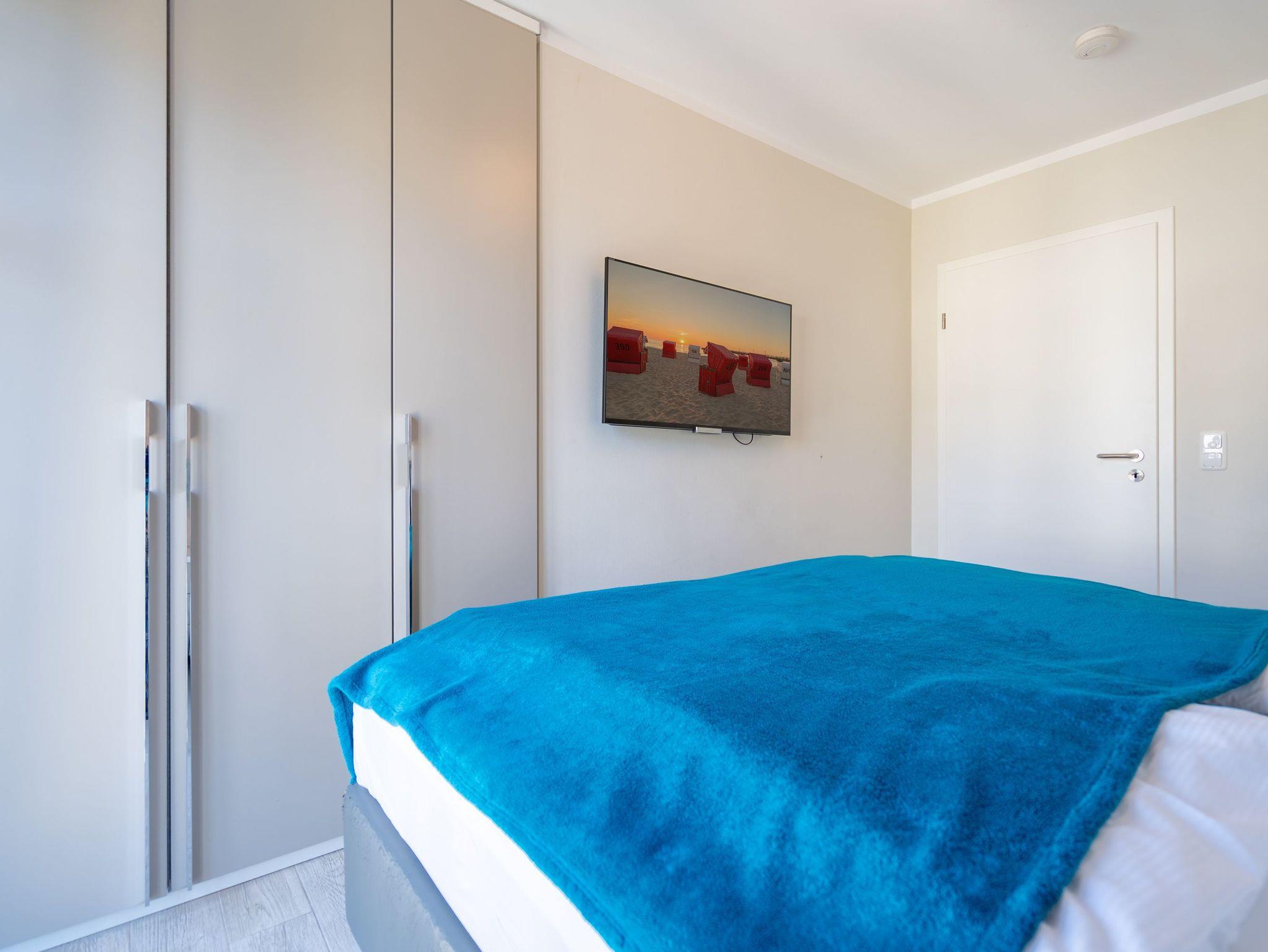 Diese stilvolle 3-Raum-Ferienwohnung (58 qm) im 2. Obergeschoss bietet Platz für bis zu 4 Personen. Helle, modern eingerichtete Räume mit harmonisch abgestimmten Farben und Materialien schaffen eine gemütliche Atmosphäre. Der offene Wohnbereich verfügt über eine komfortable Couch, einen Flat-TV und einen stimmungsvollen Gas-Kamin. Direkt angrenzend befindet sich die voll ausgestattete Küche mit integriertem Essbereich. Zwei separate Schlafzimmer mit hochwertigen Boxspringbetten (1,80 m x 2,00 m) und jeweils eigenem Flat-TV garantieren erholsame Nächte. Für Kleinkinder können ein Kinderreisebett und ein Hochstuhl gegen einen Aufpreis hinzugebucht werden. Das Badezimmer überzeugt mit einer Echtglasdusche und WC. Ein besonderes Highlight ist der großzügige Balkon (Nord- und Westseite), der mit Gartenmöbeln ausgestattet ist und zum Entspannen einlädt ? zugänglich direkt vom Wohnbereich. Zusätzlicher Komfort: kostenfreies WLAN, ein eigener Pkw-Stellplatz (Nr. 3.3) auf dem Grundstück sowie ein separater Abstellraum für Fahrräder.