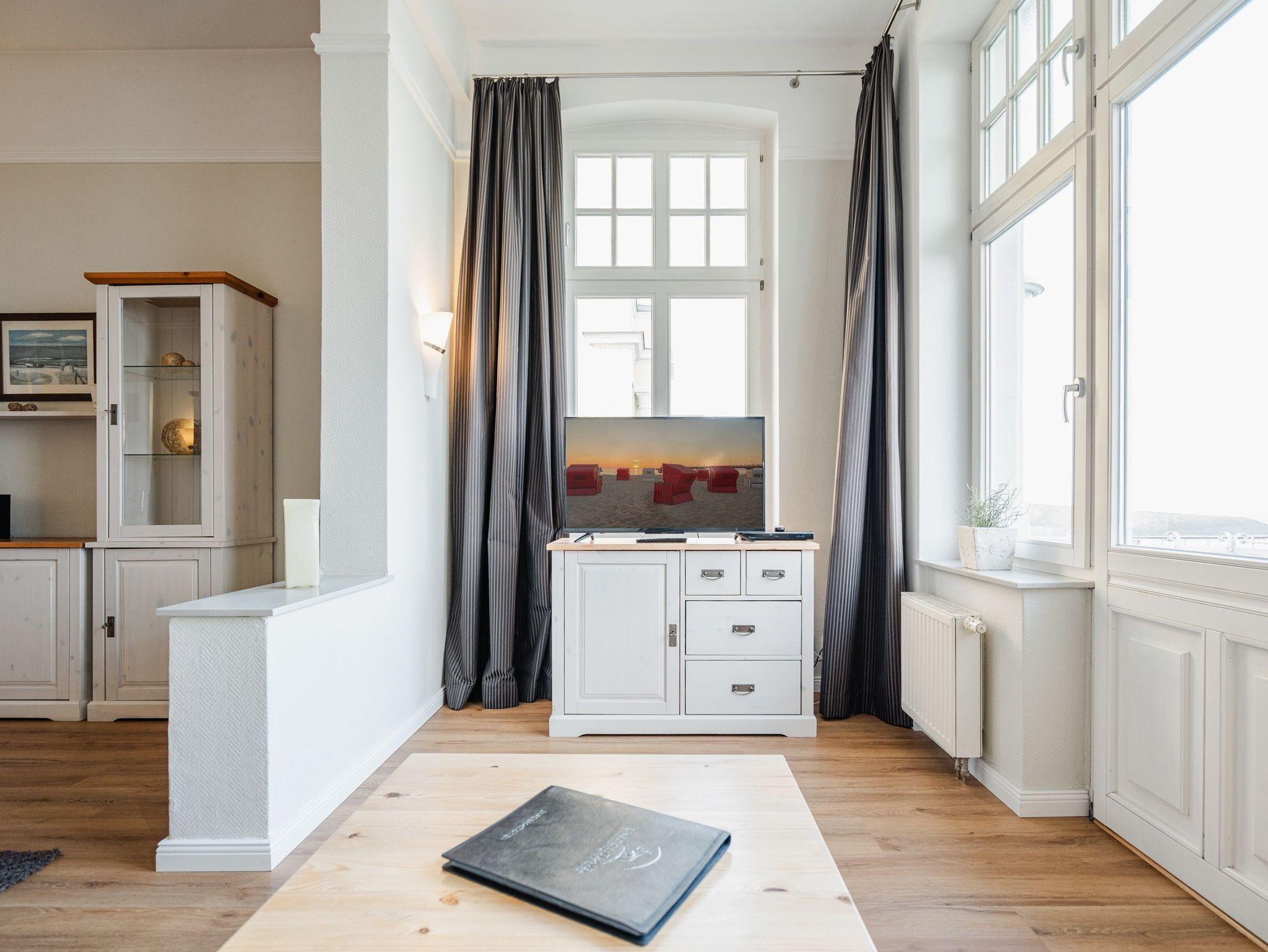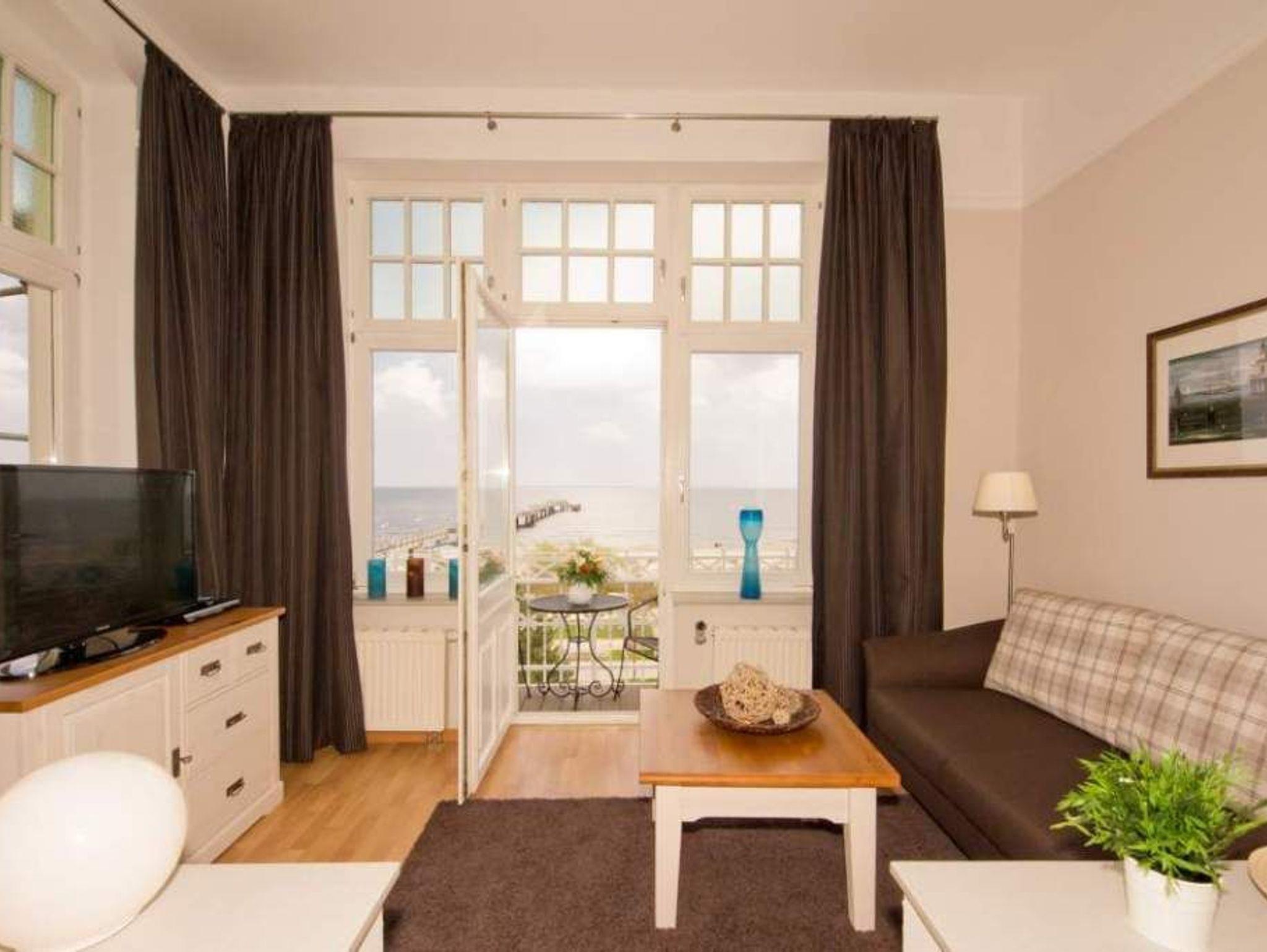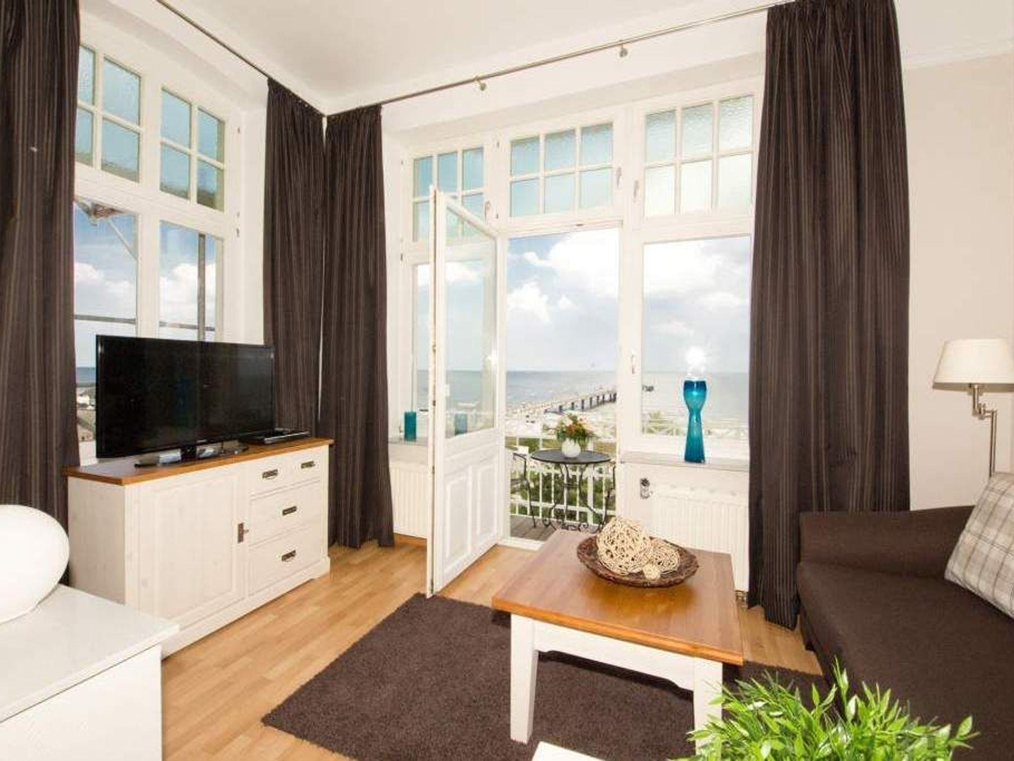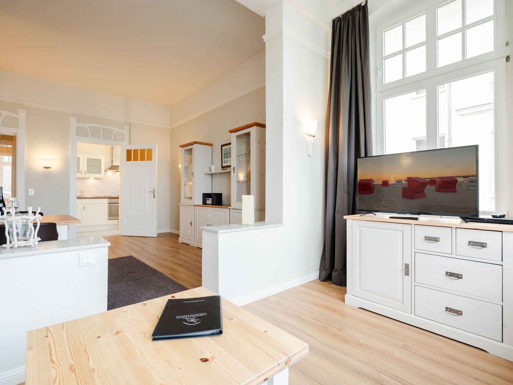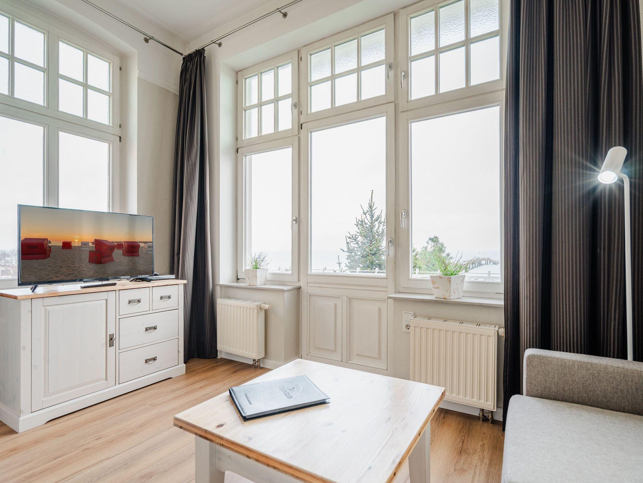 Mit fantastischem Meerblick begrüßt Sie die Ferienwohnung 07 in der Villa Dora. Hier im 2. Obergeschoss finden Sie auf großzügigen 70 qm ein liebevoll arrangiertes Urlaubsdomizil für bis zu 4 Personen (Für die 3. und 4. Person besteht die Möglichkeit der Aufbettung auf der Schlafcouch im Wohnzimmer). Stilvoll abgestimmte Farben und Stoffe werden Sie neben dem tollen Ausblick auf die Ostsee sicher schnell in Urlaubslaune versetzen. Der große, helle Wohnbereich ist mit einer gemütlichen Sitzgruppe und Flat-TV sowie einer schönen Essgruppe ausgestattet. Von hier hat man auch Zugang zum Balkon mit Meerblick. Die offene, komplett ausgestattete Küche, ein großzügiges Schlafzimmer mit Doppelbett ( 1,60m x 2,00m) und ein Bad mit zwei Waschbecken, Dusche, Badewanne und WC ergänzen die Wohnung. Für Ihren Komfort sind die Betten bei der Anreise bezogen und Handtücher liegen bereit. Für kleine Gäste kann ein Kinderreisebett und ein Kinderhochstuhl bestellt werden. Für Ihren PKW steht Ihnen ein Parkplatz mit Poller vor dem Haus zur Verfügung.