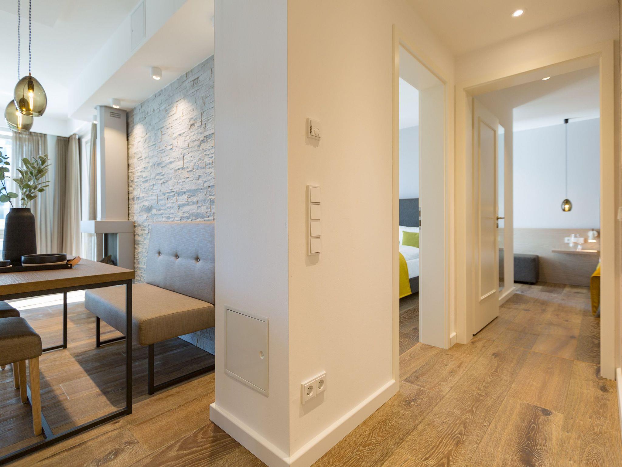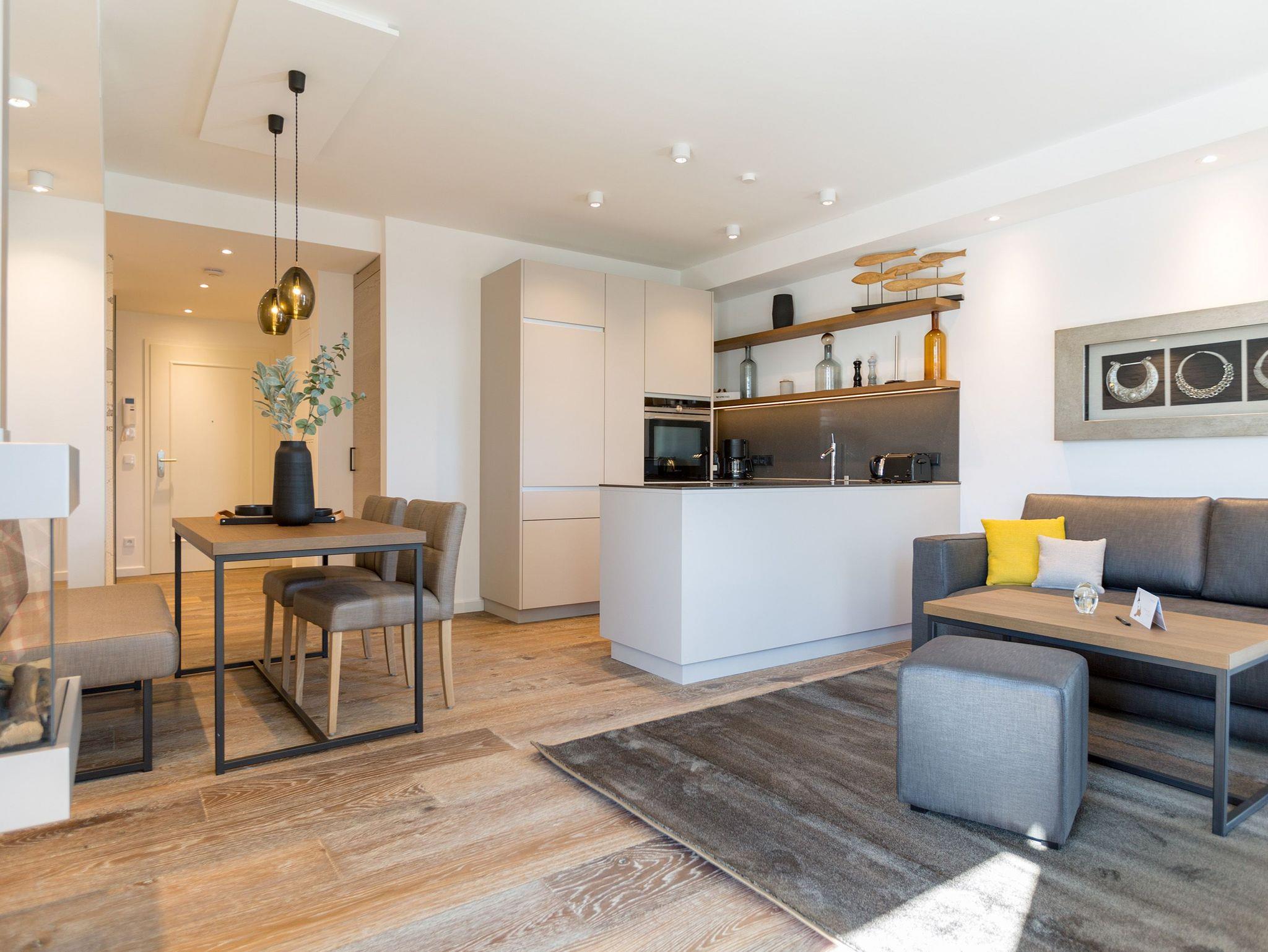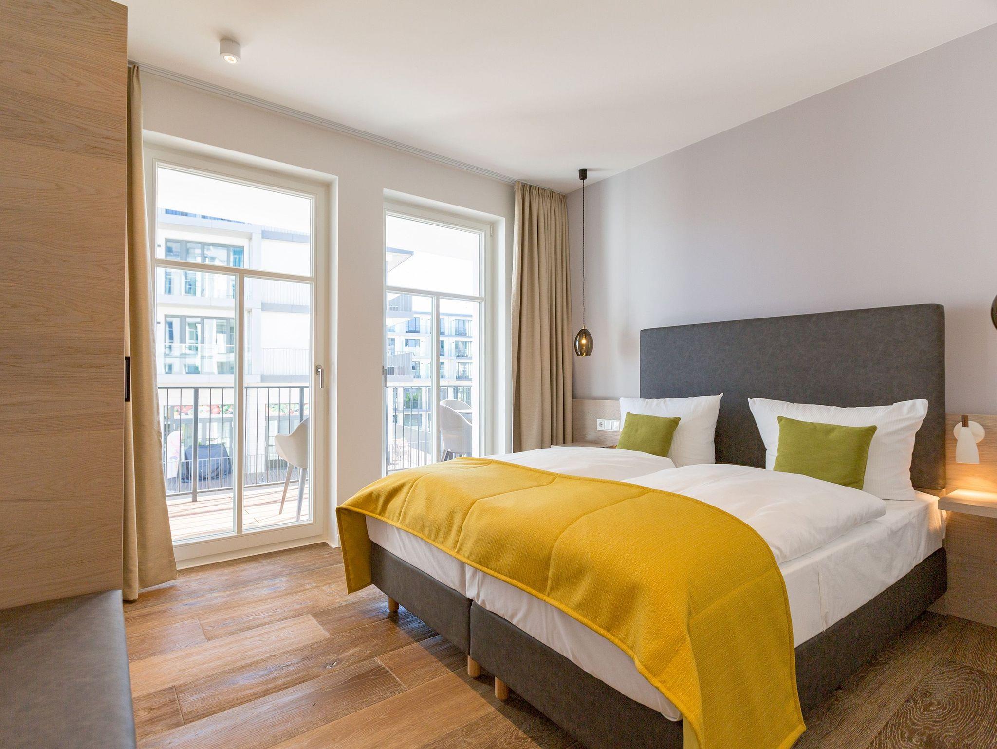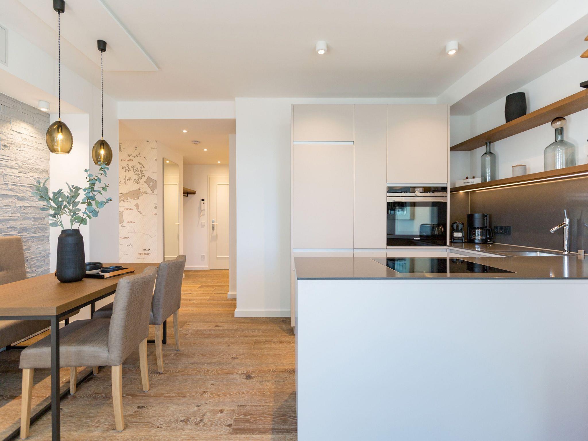Modern, offen, lichtdurchflutet dieses 66 Quadratmeter große Feriendomizil im 1. Obergeschoss macht Ihren Urlaub zu einer Ostsee-Auszeit der exklusiven Art. Vier Personen, ein Kleinkind bis drei Jahre (im Kinderreisebett) und der geliebte Vierbeiner werden sich hier so pudelwohl fühlen, dass sie gar nicht wieder nach Hause wollen. Das Drei-Zimmer-Appartement bietet allen Komfort, den man sich nur vorstellen kann. Dazu modernste Technik und ein ausgewählt stylisches Interieur. Das großzügige und offene Wohn-Esszimmer bildet den Mittelpunkt der Wohnung. Bodentiefe Fenster lassen viel Licht ins Innere. Ein wunderschöner Gas-Kamin sorgt für Behaglichkeit. Ebenso die harmonisch aufeinander abgestimmten Naturmaterialien Holz und Stein. Und immer im Blick das Wasser der Ostsee. Denn vom Balkon (9 Quadratmeter groß) aus haben Sie seitlichen Meerblick. Dieser ist übrigens von allen drei Zimmern aus begehbar. Im Wohnzimmer wartet eine bequeme Couch nur darauf, dass Sie sich einfach fallen und verwöhnen lassen. Ein großer Flat-TV und eine Hi-Fi-Anlage mit Bluetooth sorgen für qualitativ hochwertige Unterhaltung. Ein schöner Essplatz mit zwei Stühlen und einer Sitzbank lädt zum ausgiebigen Dinieren ein. Das Essen können Sie in der vollausgestatteten und in den Wohnraum integrierten Küche zubereiten. Die freistehende Kochinsel eignet sich ideal als Raumteiler. In den Schränken finden Sie ausgewähltes Design-Geschirr. Etwas, was man vor allem im Urlaub sich sehnlichst wünscht, ist ein erholsamer Schlaf. In den bequemen Boxspringdoppelbetten (1,60 m x 2,00 m) werden diese Träume in den beiden Schlafzimmern Realität. Das angenehme Farbkonzept und die anheimelnde Atmosphäre der Einrichtung machen es Ihnen leicht. Das Appartement verfügt über zwei Bäder. Bad Nummer 1 ist nur über eines der beiden Schlafzimmer zugänglich. Beide Bäder jedoch sind mit einer ebenerdigen und großen Regendusche, einem Waschtisch und einem WC ausgestattet. Ein absolutes Highlight erwartet Sie zudem im 2. Bad: Eine Finnische Sauna. Was gibt es Schöneres, als einen entspannten Urlaubstag mit einem noch entspannenderem Saunagang abzuschließen? Handtücher finden Sie natürlich vor Ort. Ebenso sind die Betten bei Ihrer Anreise bereits bezogen. Wenn Sie ins Internet gehen wollen, können Sie das über das kostenfreie WLAN tun. In der Wohnung gibt es einen kleinen Hauswirtschaftsraum, in dem ein Waschtrockner steht. In der modernen Tiefgarage ist für Sie der Stellplatz Nr. 3 im Doppelparker oben (max. Höhe 1,90m, max. Länge 5,10 m, max. Breite 2,50 m, max. Last 2.600 kg) reserviert.
