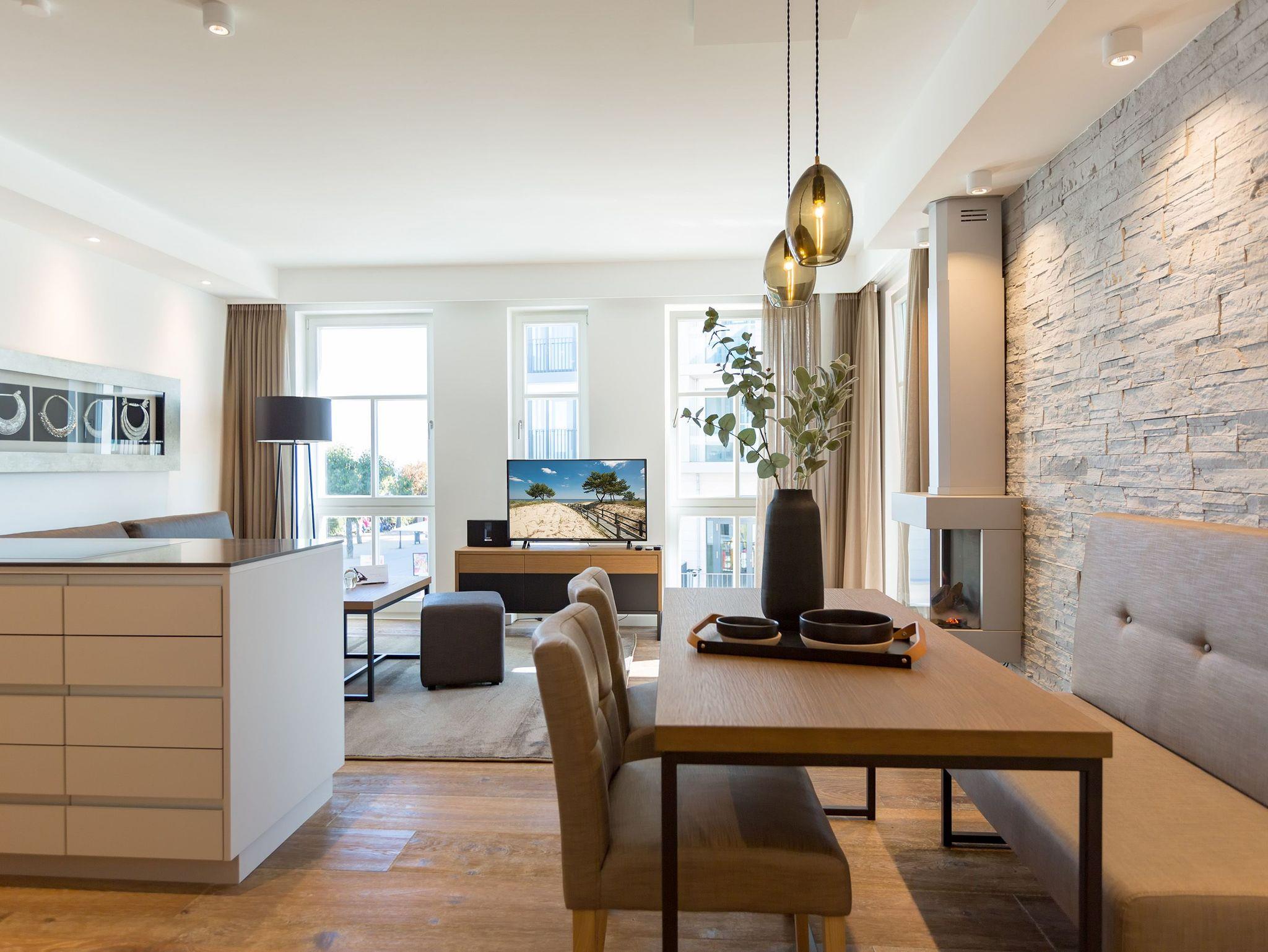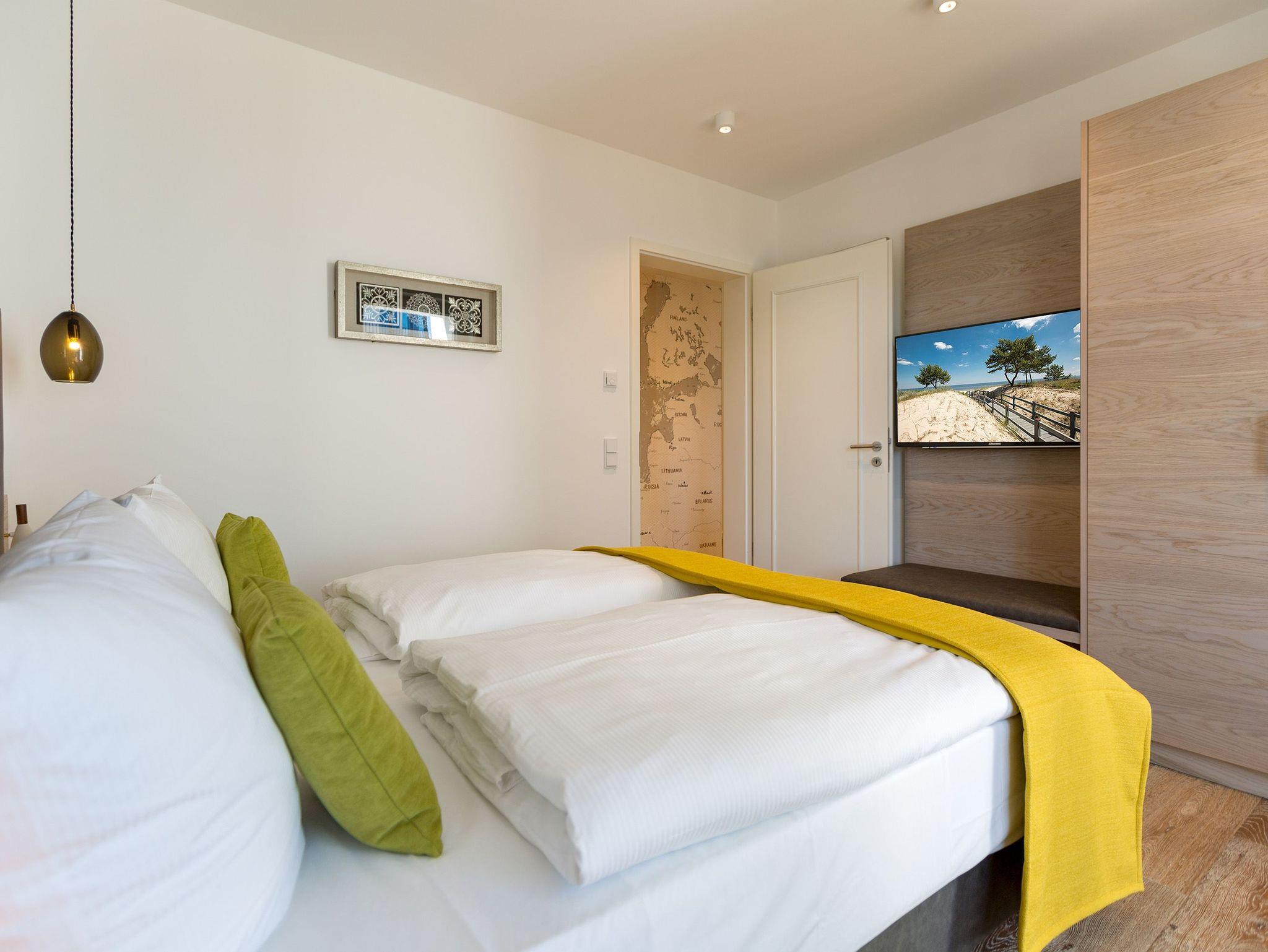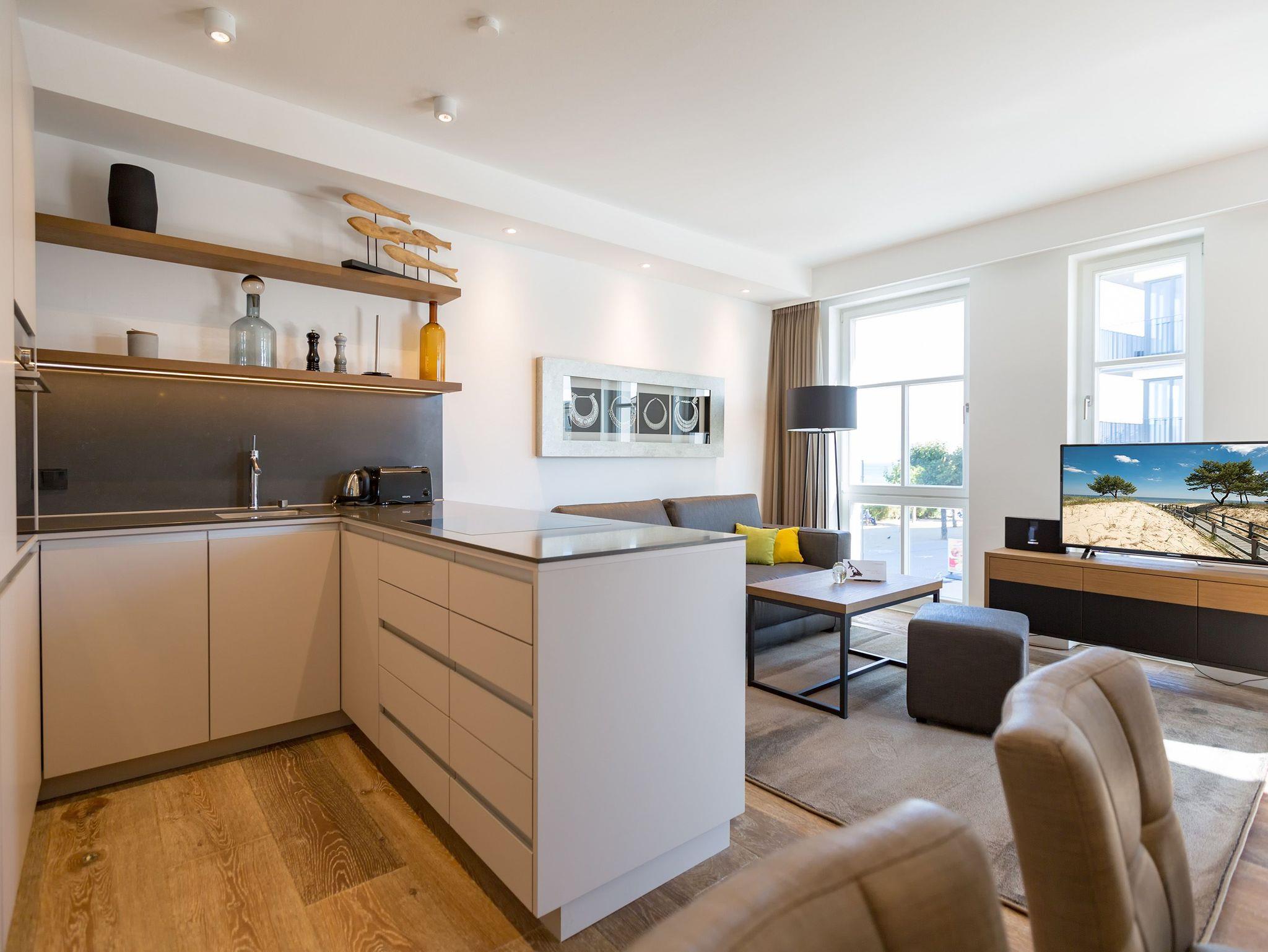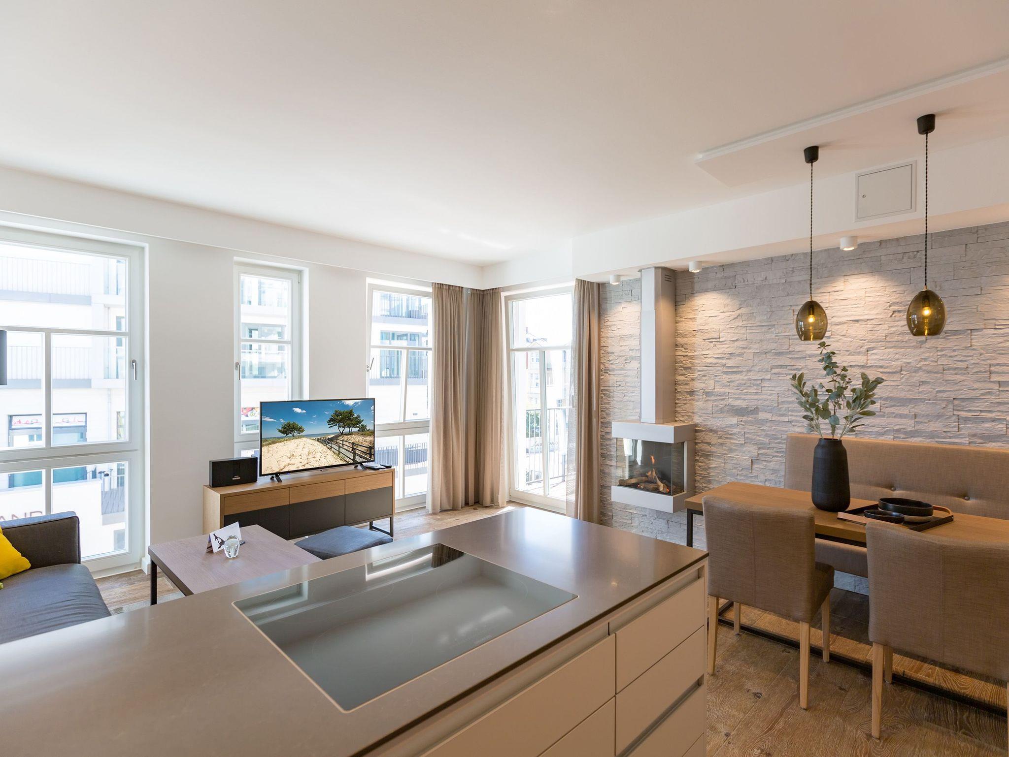 Modern, offen, lichtdurchflutet ? dieses 66 Quadratmeter große Feriendomizil im 1. Obergeschoss macht Ihren Urlaub zu einer Ostsee-Auszeit der exklusiven Art. Vier Personen, ein Kleinkind bis drei Jahre (im Kinderreisebett) und der geliebte Vierbeiner werden sich hier so pudelwohl fühlen, dass sie gar nicht wieder nach Hause wollen. Das Drei-Zimmer-Appartement bietet allen Komfort, den man sich nur vorstellen kann. Dazu modernste Technik und ein ausgewählt stylisches Interieur. Das großzügige und offene Wohn-Esszimmer bildet den Mittelpunkt der Wohnung. Bodentiefe Fenster lassen viel Licht ins Innere. Ein wunderschöner Gas-Kamin sorgt für Behaglichkeit. Ebenso die harmonisch aufeinander abgestimmten Naturmaterialien Holz und Stein. Und immer im Blick das Wasser der Ostsee. Denn vom Balkon (9 Quadratmeter groß) aus haben Sie seitlichen Meerblick. Dieser ist übrigens von allen drei Zimmern aus begehbar. Im Wohnzimmer wartet eine bequeme Couch nur darauf, dass Sie sich einfach fallen und verwöhnen lassen. Ein großer Flat-TV und eine Hi-Fi-Anlage mit Bluetooth sorgen für qualitativ hochwertige Unterhaltung. Ein schöner Essplatz mit zwei Stühlen und einer Sitzbank lädt zum ausgiebigen Dinieren ein. Das Essen können Sie in der vollausgestatteten und in den Wohnraum integrierten Küche zubereiten. Die freistehende Kochinsel eignet sich ideal als Raumteiler. In den Schränken finden Sie ausgewähltes Design-Geschirr. Etwas, was man vor allem im Urlaub sich sehnlichst wünscht, ist ein erholsamer Schlaf. In den bequemen Boxspringdoppelbetten (1,60 m x 2,00 m) werden diese Träume in den beiden Schlafzimmern Realität. Das angenehme Farbkonzept und die anheimelnde Atmosphäre der Einrichtung machen es Ihnen leicht. Das Appartement verfügt über zwei Bäder. Bad Nummer 1 ist nur über eines der beiden Schlafzimmer zugänglich. Beide Bäder jedoch sind mit einer ebenerdigen und großen Regendusche, einem Waschtisch und einem WC ausgestattet. Ein absolutes Highlight erwartet Sie zudem im 2. Bad: Eine Finnische Sauna. Was gibt es Schöneres, als einen entspannten Urlaubstag mit einem noch entspannenderem Saunagang abzuschließen? Handtücher finden Sie natürlich vor Ort. Ebenso sind die Betten bei Ihrer Anreise bereits bezogen. Wenn Sie ins Internet gehen wollen, können Sie das über das kostenfreie WLAN tun. In der Wohnung gibt es einen kleinen Hauswirtschaftsraum, in dem ein Waschtrockner steht. In der modernen Tiefgarage ist für Sie der Stellplatz Nr. 3 im Doppelparker oben (max. Höhe 1,90m, max. Länge 5,10 m, max. Breite 2,50 m, max. Last 2.600 kg) reserviert.