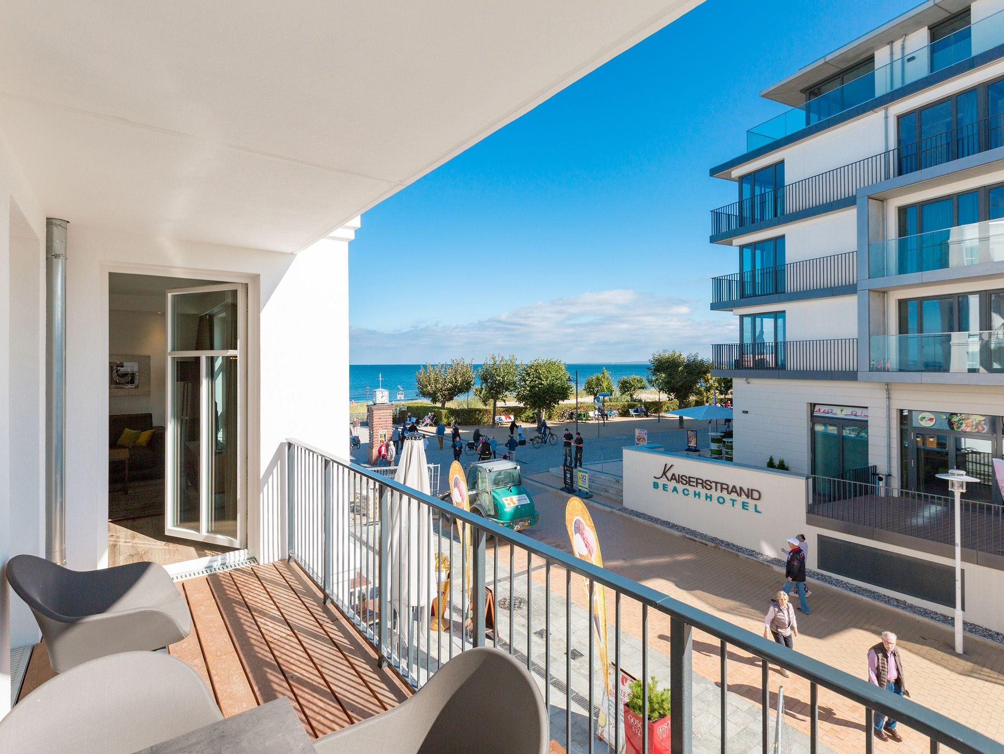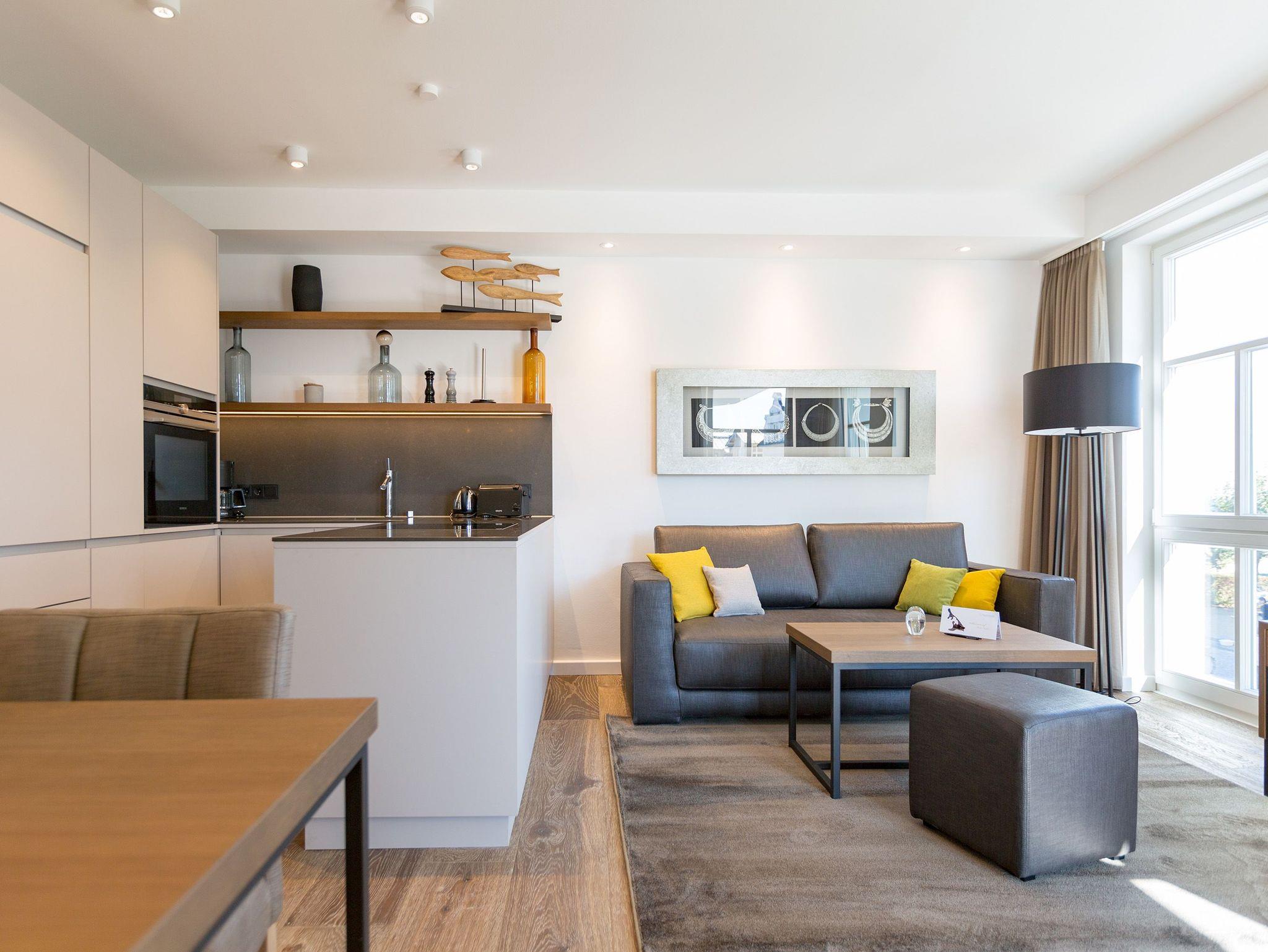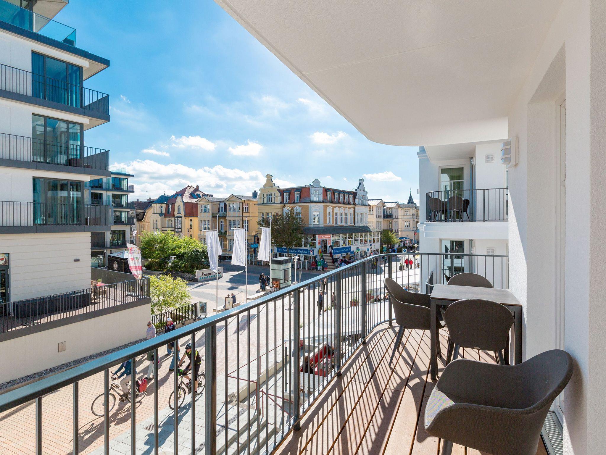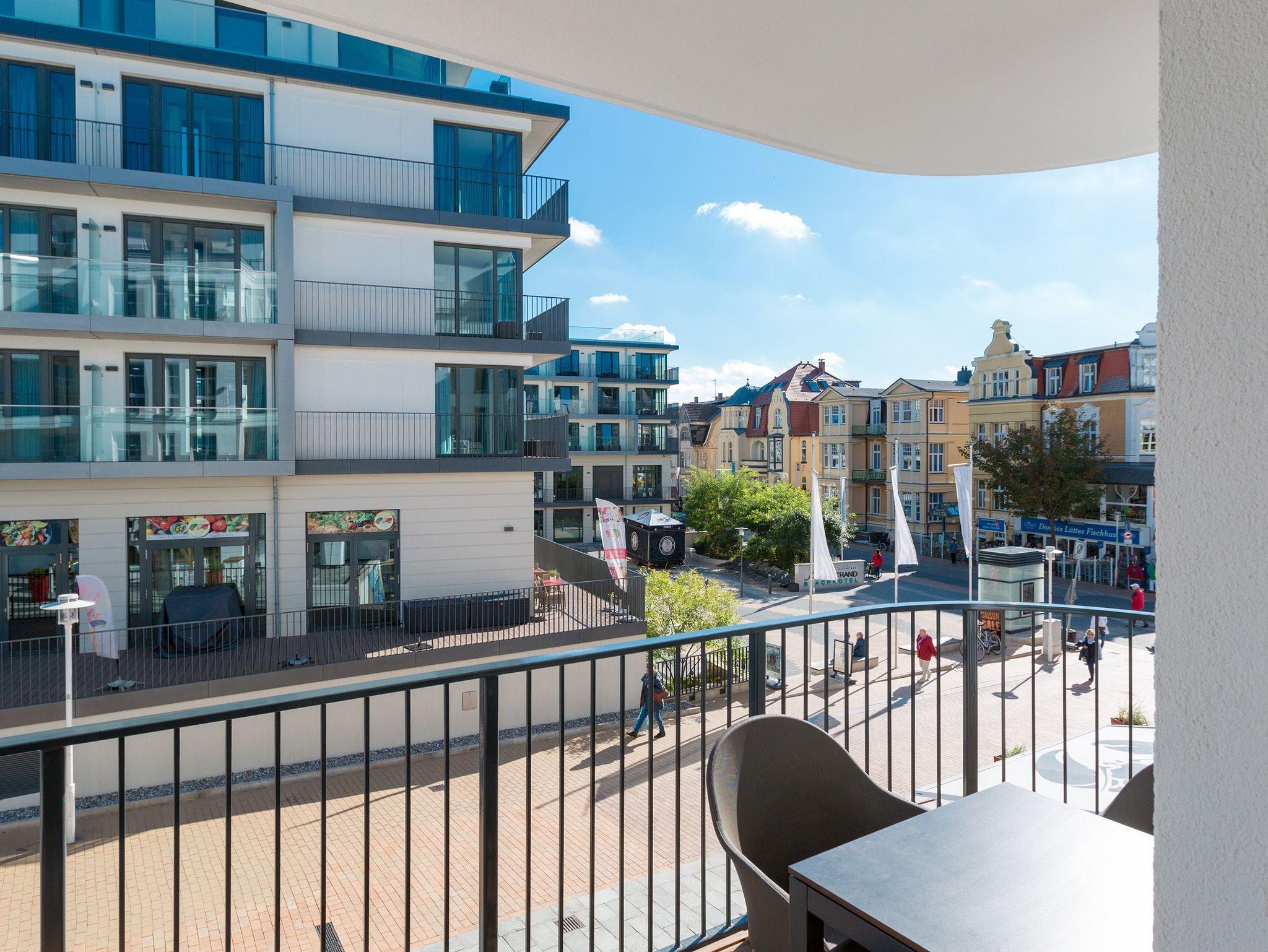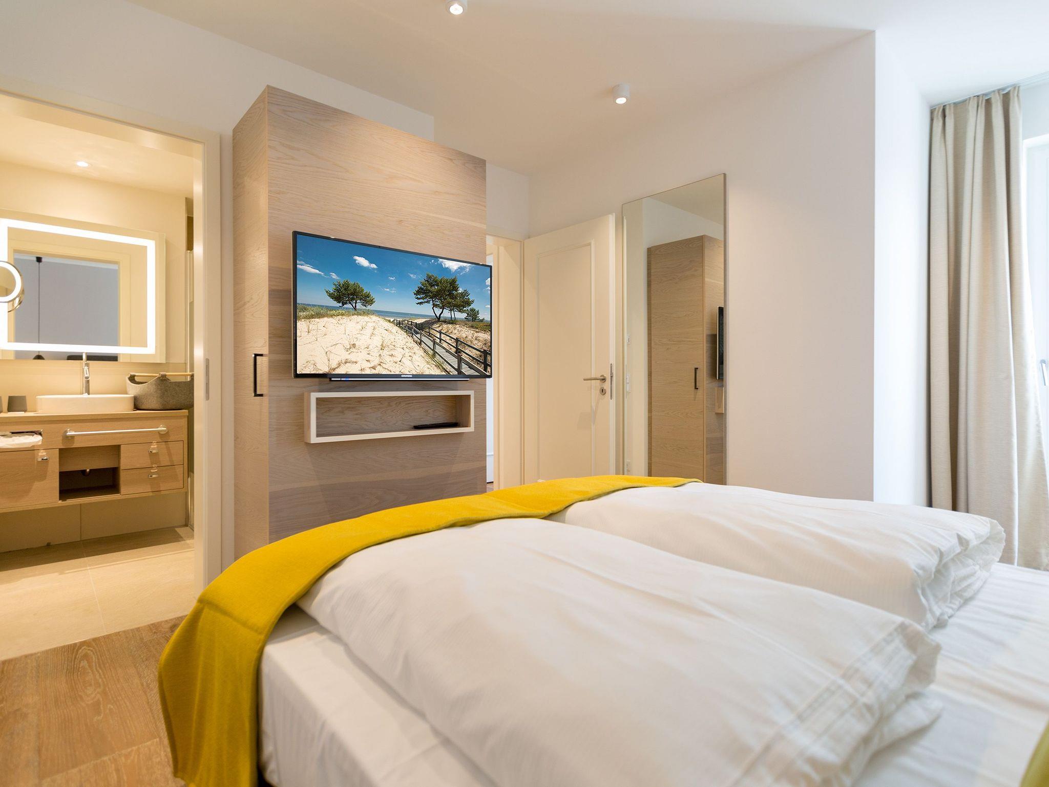 Modern, offen, lichtdurchflutet ? dieses 66 Quadratmeter große Feriendomizil im 1. Obergeschoss macht Ihren Urlaub zu einer Ostsee-Auszeit der exklusiven Art. Vier Personen, ein Kleinkind bis drei Jahre (im Kinderreisebett) und der geliebte Vierbeiner werden sich hier so pudelwohl fühlen, dass sie gar nicht wieder nach Hause wollen. Das Drei-Zimmer-Appartement bietet allen Komfort, den man sich nur vorstellen kann. Dazu modernste Technik und ein ausgewählt stylisches Interieur. Das großzügige und offene Wohn-Esszimmer bildet den Mittelpunkt der Wohnung. Bodentiefe Fenster lassen viel Licht ins Innere. Ein wunderschöner Gas-Kamin sorgt für Behaglichkeit. Ebenso die harmonisch aufeinander abgestimmten Naturmaterialien Holz und Stein. Und immer im Blick das Wasser der Ostsee. Denn vom Balkon (9 Quadratmeter groß) aus haben Sie seitlichen Meerblick. Dieser ist übrigens von allen drei Zimmern aus begehbar. Im Wohnzimmer wartet eine bequeme Couch nur darauf, dass Sie sich einfach fallen und verwöhnen lassen. Ein großer Flat-TV und eine Hi-Fi-Anlage mit Bluetooth sorgen für qualitativ hochwertige Unterhaltung. Ein schöner Essplatz mit zwei Stühlen und einer Sitzbank lädt zum ausgiebigen Dinieren ein. Das Essen können Sie in der vollausgestatteten und in den Wohnraum integrierten Küche zubereiten. Die freistehende Kochinsel eignet sich ideal als Raumteiler. In den Schränken finden Sie ausgewähltes Design-Geschirr. Etwas, was man vor allem im Urlaub sich sehnlichst wünscht, ist ein erholsamer Schlaf. In den bequemen Boxspringdoppelbetten (1,60 m x 2,00 m) werden diese Träume in den beiden Schlafzimmern Realität. Das angenehme Farbkonzept und die anheimelnde Atmosphäre der Einrichtung machen es Ihnen leicht. Das Appartement verfügt über zwei Bäder. Bad Nummer 1 ist nur über eines der beiden Schlafzimmer zugänglich. Beide Bäder jedoch sind mit einer ebenerdigen und großen Regendusche, einem Waschtisch und einem WC ausgestattet. Ein absolutes Highlight erwartet Sie zudem im 2. Bad: Eine Finnische Sauna. Was gibt es Schöneres, als einen entspannten Urlaubstag mit einem noch entspannenderem Saunagang abzuschließen? Handtücher finden Sie natürlich vor Ort. Ebenso sind die Betten bei Ihrer Anreise bereits bezogen. Wenn Sie ins Internet gehen wollen, können Sie das über das kostenfreie WLAN tun. In der Wohnung gibt es einen kleinen Hauswirtschaftsraum, in dem ein Waschtrockner steht. In der modernen Tiefgarage ist für Sie der Stellplatz Nr. 3 im Doppelparker oben (max. Höhe 1,90m, max. Länge 5,10 m, max. Breite 2,50 m, max. Last 2.600 kg) reserviert.