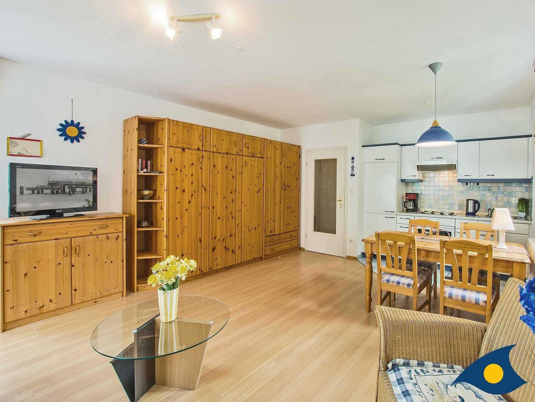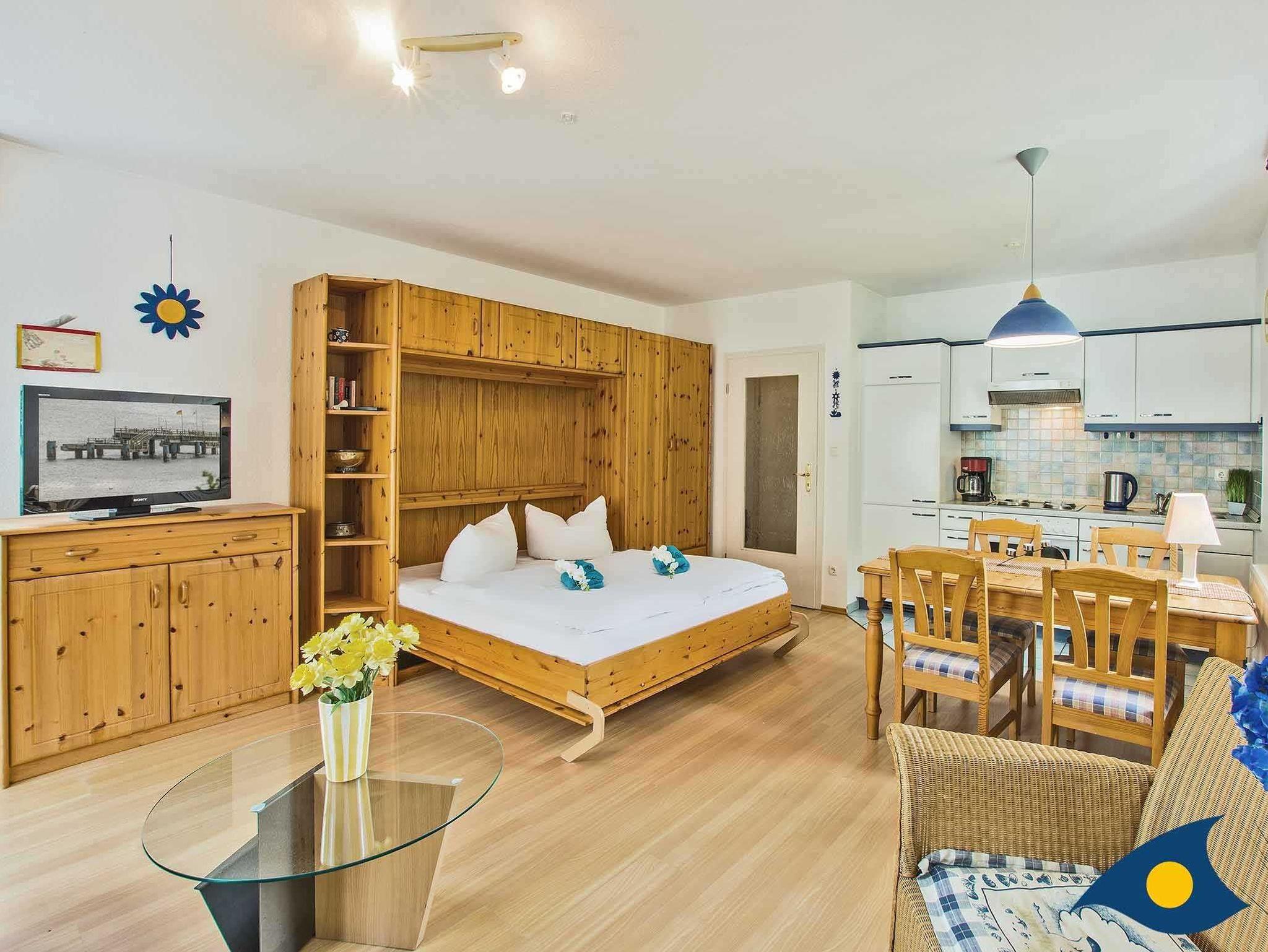 Zur Ausstattung der Wohnung gehören moderne Holzmöbel, Laminatboden, Korbsessel, ein separater Esstisch und eine Küchenzeile mit 4 Plattenherd.