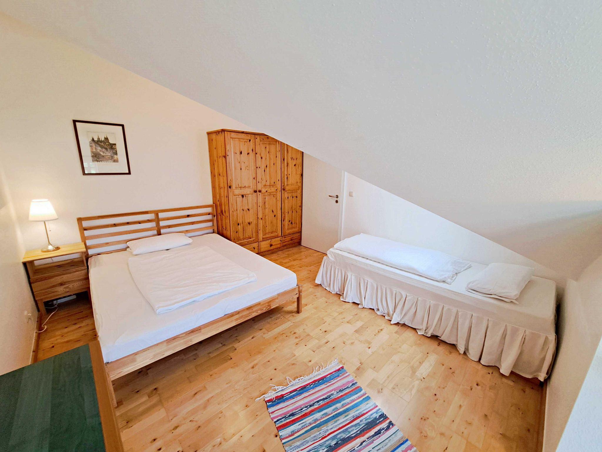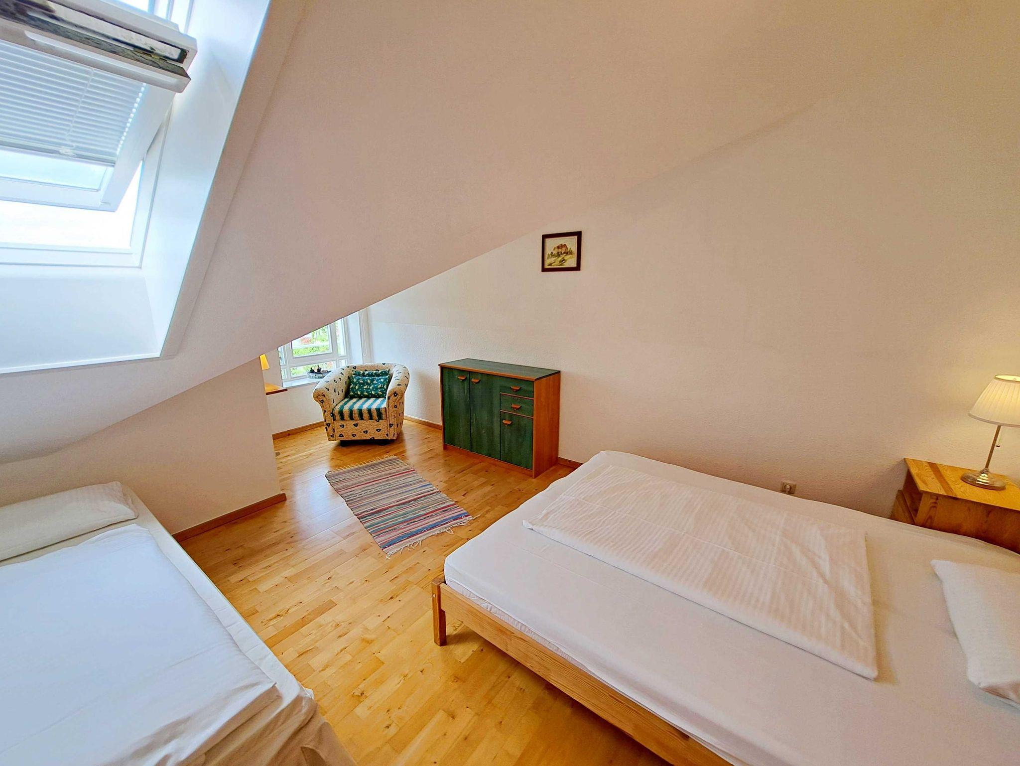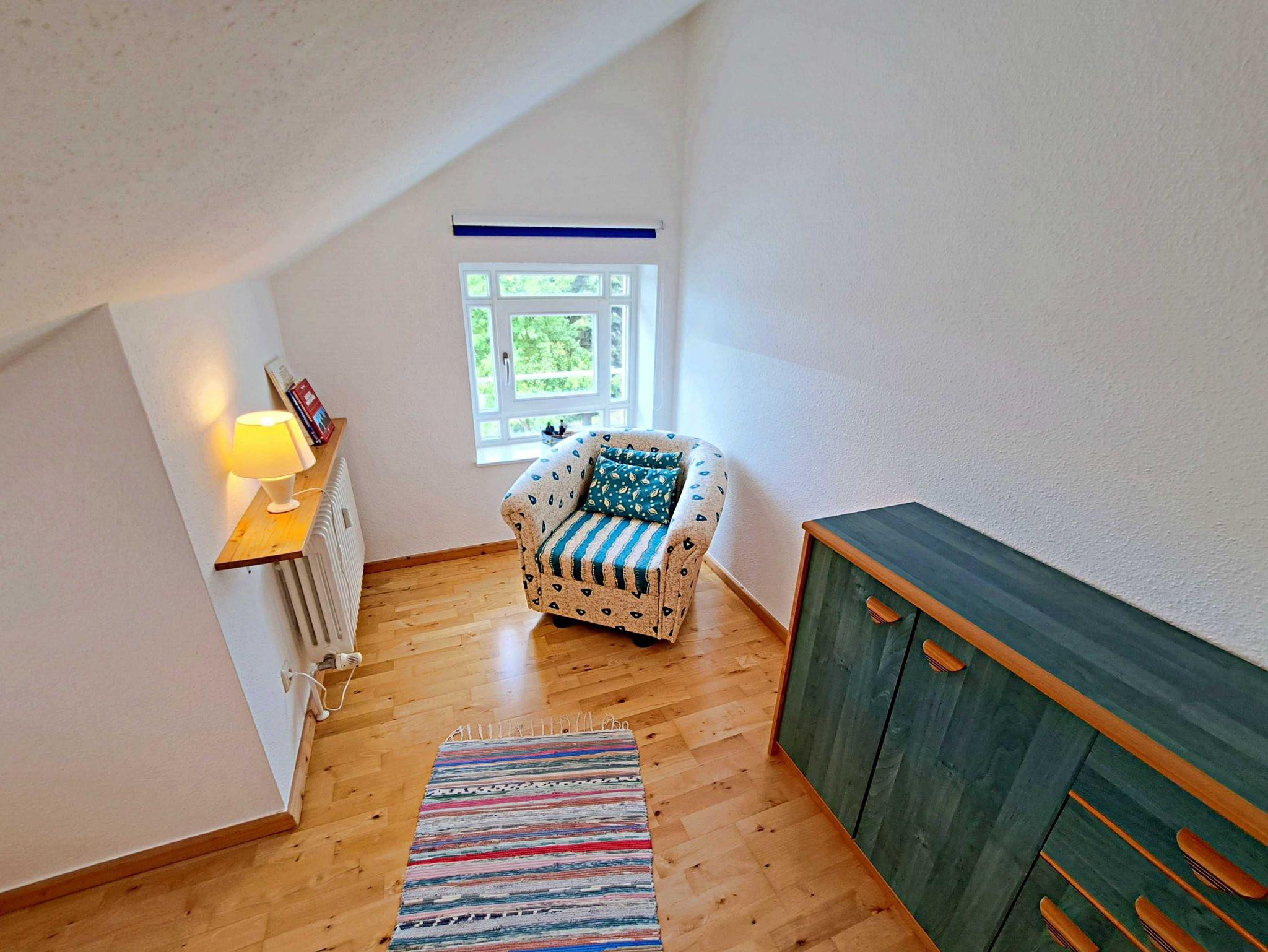 Der separate Eingang führt Sie ins 1. Obergeschoss, wo Sie ein einladendes Wohnzimmer mit einer gemütlichen Couch und einem Flat-TV erwartet. Genießen Sie den Blick auf den idyllischen Schloonsee von Ihrem eigenen Balkon aus. Die voll ausgestattete Küche lässt keine Wünsche offen - hier finden Sie einen Elektroherd, Backofen, Geschirrspüler, Kühlschrank, Mikrowelle, Wasserkocher, Toaster und Kaffeemaschine. Das separate Esszimmer bietet reichlich Platz zum Sitzen und Verweilen und ein Gäste-WC sorgt für zusätzlichen Komfort. Über eine Treppe gelangen Sie in das zweite Obergeschoss, wo sich zwei Schlafzimmer befinden. Das eine Schlafzimmer ist mit einem Doppelbett ausgestattet, während das andere sowohl ein Doppel- als auch ein Einzelbett bietet. Das innenliegende Badezimmer verfügt über eine Badewanne mit Duschfunktion und WC. Abgerundet wird die Wohnung durch eine kleine Galerie, die perfekt als Lese-Ecke genutzt werden kann.