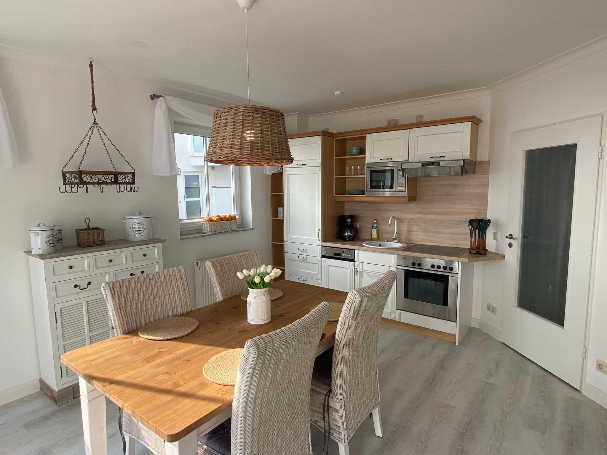 Der große Esstisch und die gut ausgestattete Küchenzeile laden zum gemeinsamen Kochen und Genießen ein.