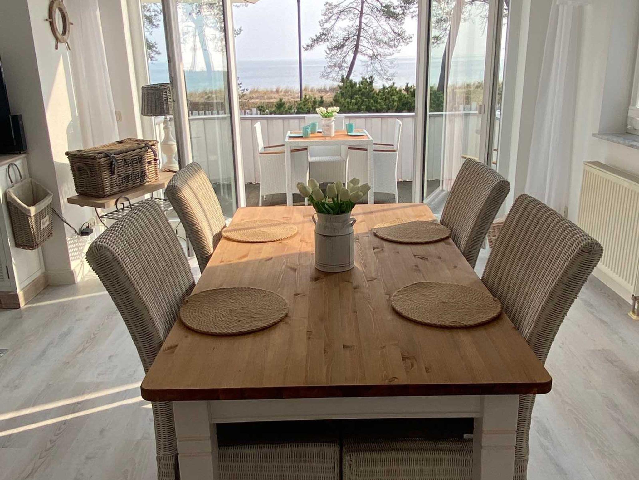 Von der Terrasse aus haben Sie auch einen wunderschönen Blick auf die beiden Seebrücken von Heringsdorf und Bansin, spektakuläre Sonnenaufgänge inclusive. Wenn Sie die beiden Flügelfenster der Terrasse öffnen, verbinden sich Essbereich und Terrasse zu einer Einheit.