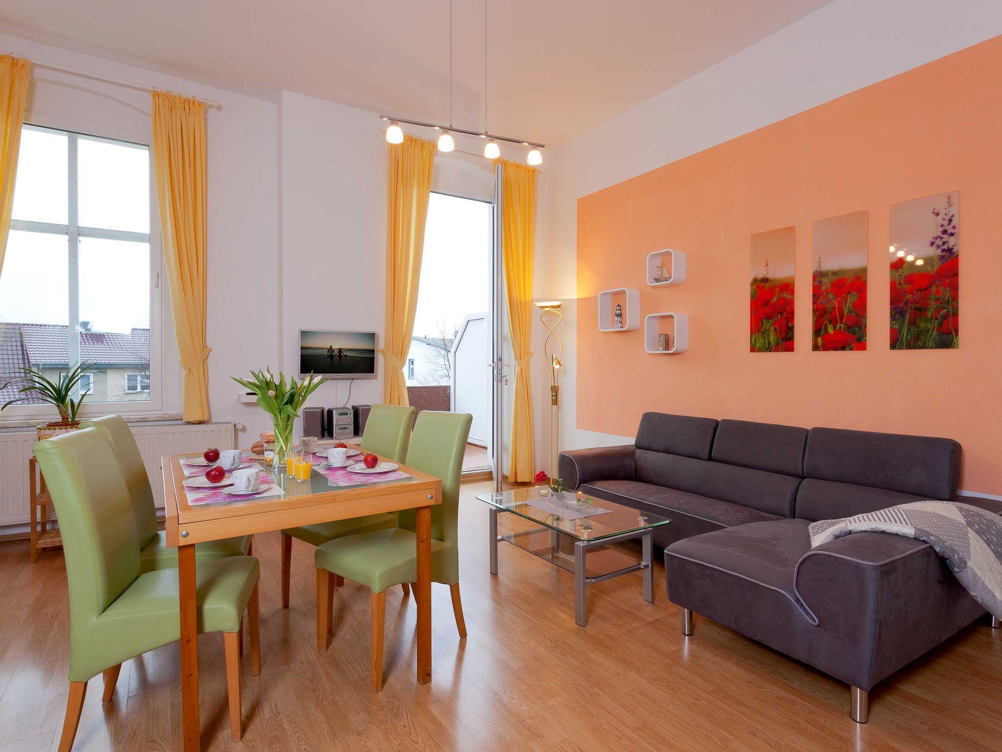 Im Wohnbereich befinden sich eine Küchenzeile mit Sitzgelegenheiten, eine gemütliche Couchecke sowie der 5m² große Südbalkon. Das Zimmer mit zwei Einzelbetten und die Dusche mit WC sind durch das Wohnzimmer zugänglich.