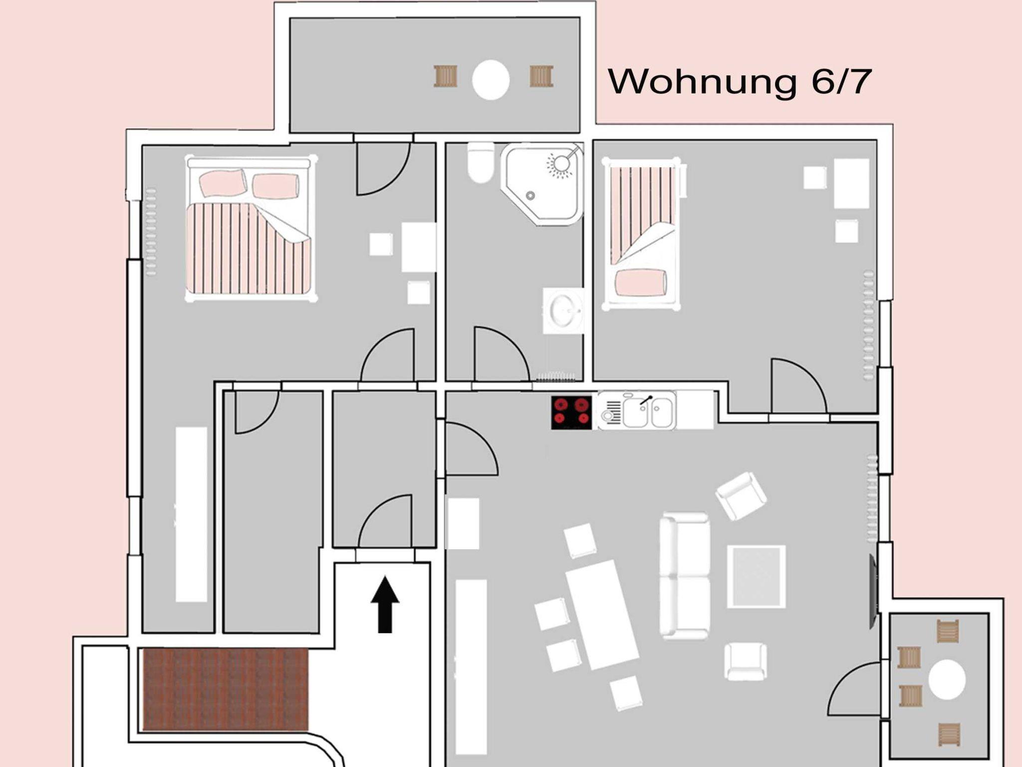 Die Wohnung 6/7 bestehend aus 3 Zimmern befindet sich in der 1. Etage.