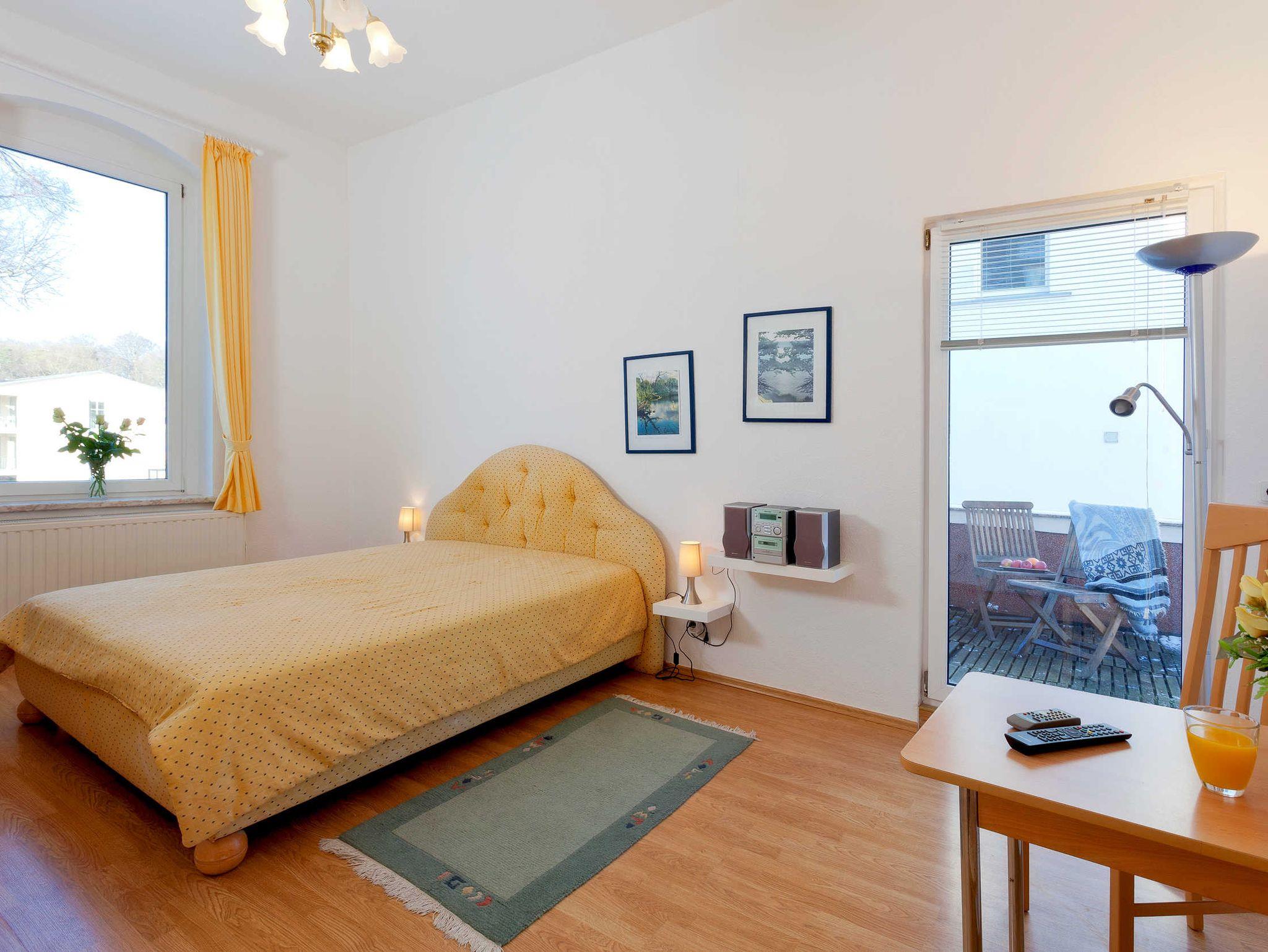 Das nordöstlich gelegene Schlafzimmer integiert ein Doppelbett, Gäste WC und einen 10m² großen Balkon mit Blick auf