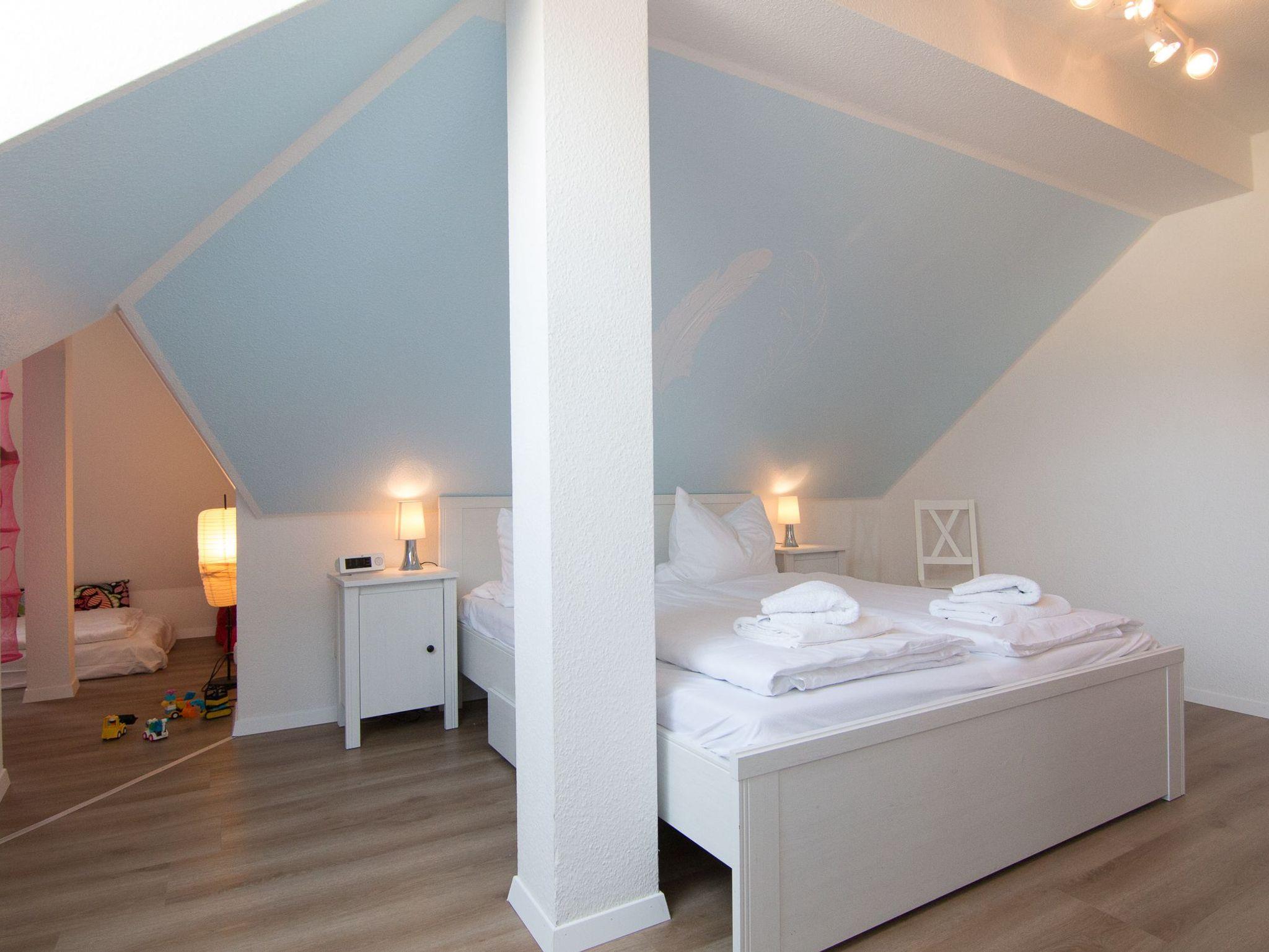 Als Besonderheit verfügt die Ferienwohnung über ein Turmzimmer, welches sich offen an das Schlafzimmer mit Doppelbett anschließt und ideal als Kinderschlafzimmer genutzt werden kann. Hier kann sich Ihr Kind sein eigenes Reich schaffen und ist trotzdem nicht weit weg. Damit Sie nicht zu früh von der Sonne wachgeküsst werden, sind alle Schlafräume sind mit Verdunklungsrollos und Markiesen für den Sonnenschutz ausgestattet.