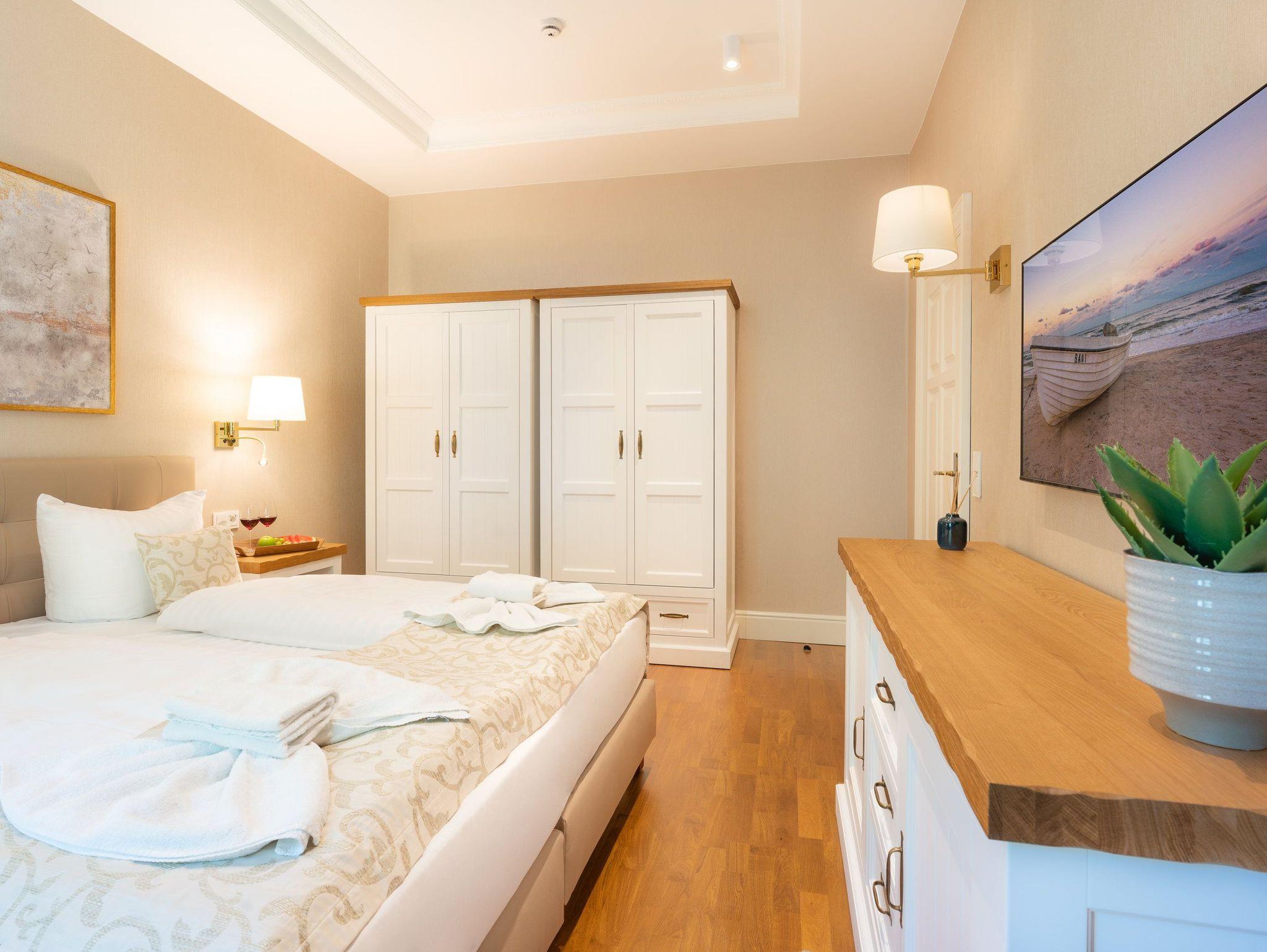 Die Schlafmöglichkeiten sind ideal auf bis zu vier Personen abgestimmt. Im separaten Schlafzimmer sorgt ein hochwertiges Boxspringbett (200 x 200 cm, zwei getrennte Matratzen) für erholsamen Schlaf, während die Schlafcouch im Wohnbereich im Handumdrehen eine komfortable Schlafgelegenheit für zwei weitere Gäste bietet. Ein geräumiger Kleiderschrank steht für Ihr Reisegepäck zur Verfügung.