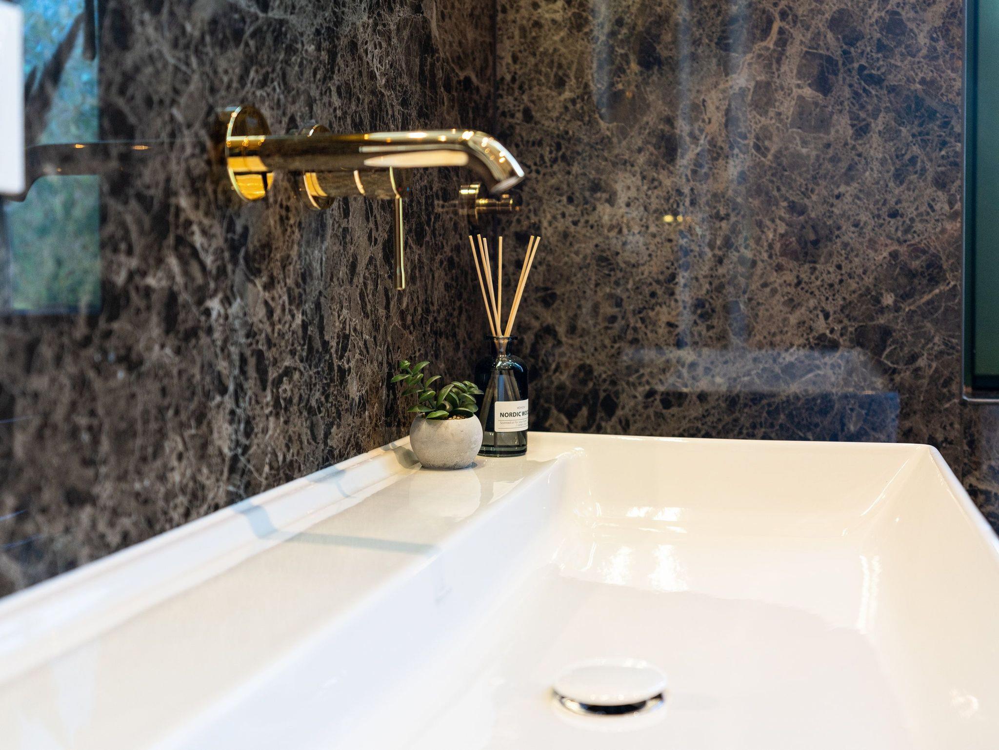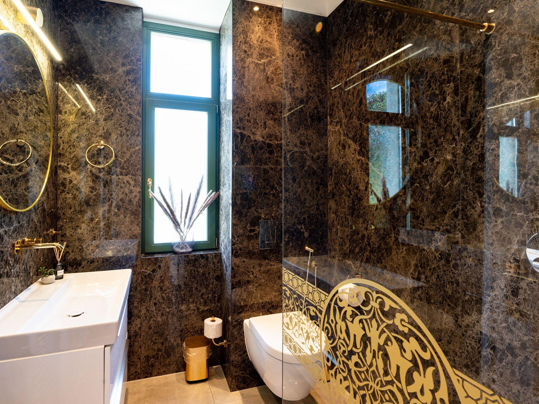 Das modern gestaltete Badezimmer überzeugt mit einer außergewöhnlichen Farb- und Materialkombination: großformatige dunkle Natursteinfliesen, helle Badkeramik sowie edle Messing-Armaturen schaffen ein stilvolles Ambiente. Die bodengleiche Dusche rundet den hohen Komfort ab.