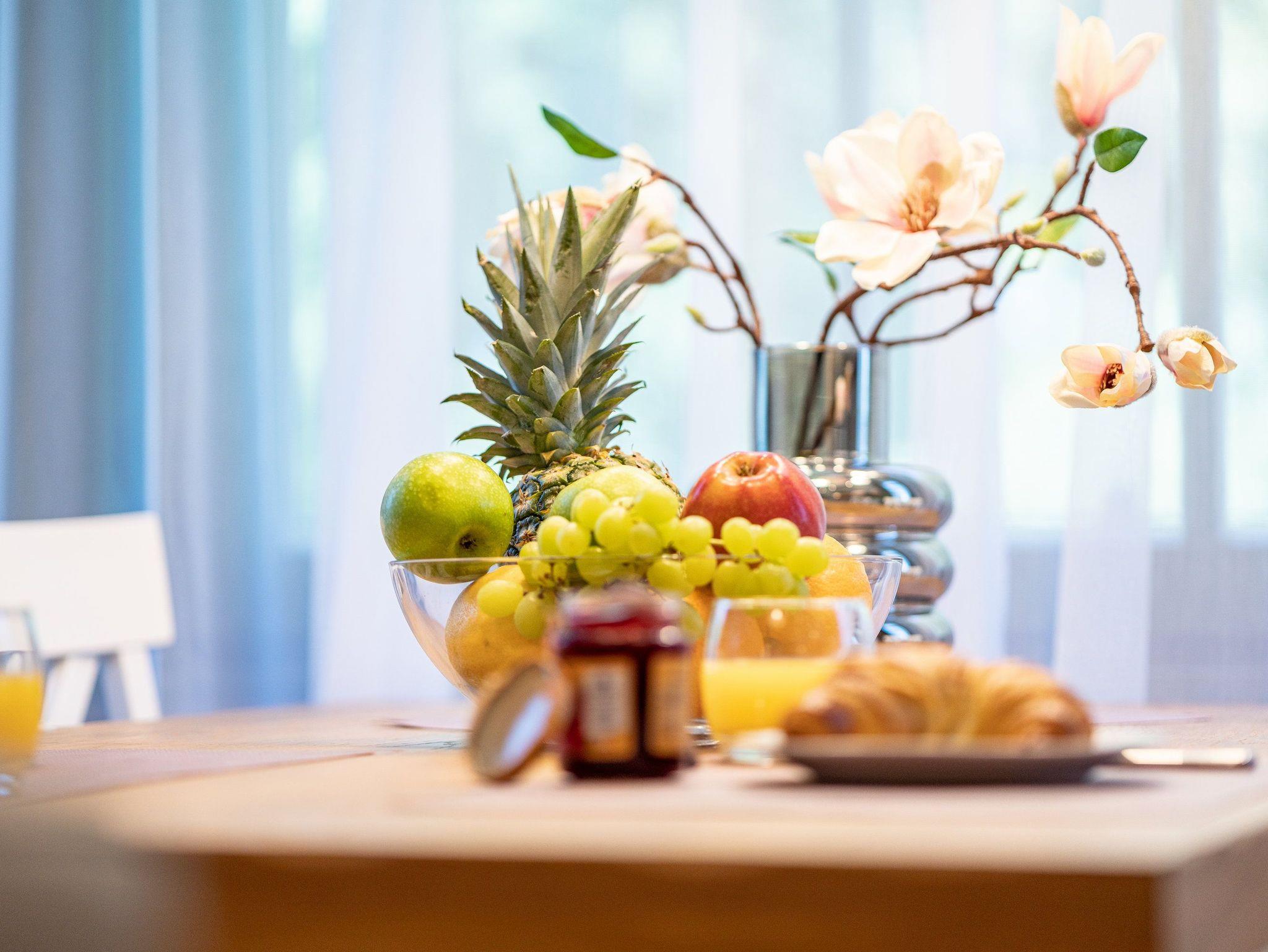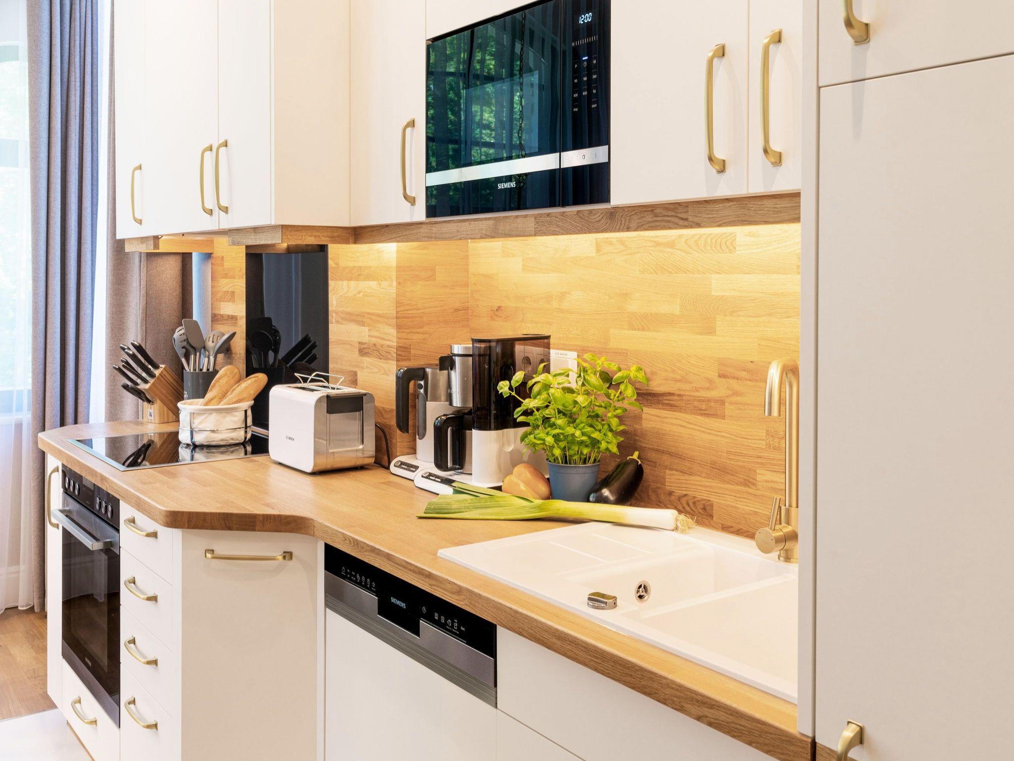 Die maßgefertigte Küche eines regionalen Tischlers ist vollständig ausgestattet und bietet alles, was Sie für einen gelungenen Urlaub benötigen: Backofen, Mikrowelle, Kühlschrank mit Gefrierfach, Toaster, Wasserkocher und Kaffeemaschine. Der Essplatz für vier Personen mit Blick in den gegenüberliegenden Park eignet sich perfekt für gemütliche Mahlzeiten, entspannte Frühstücke oder gemeinsame Spiele mit der Familie.
