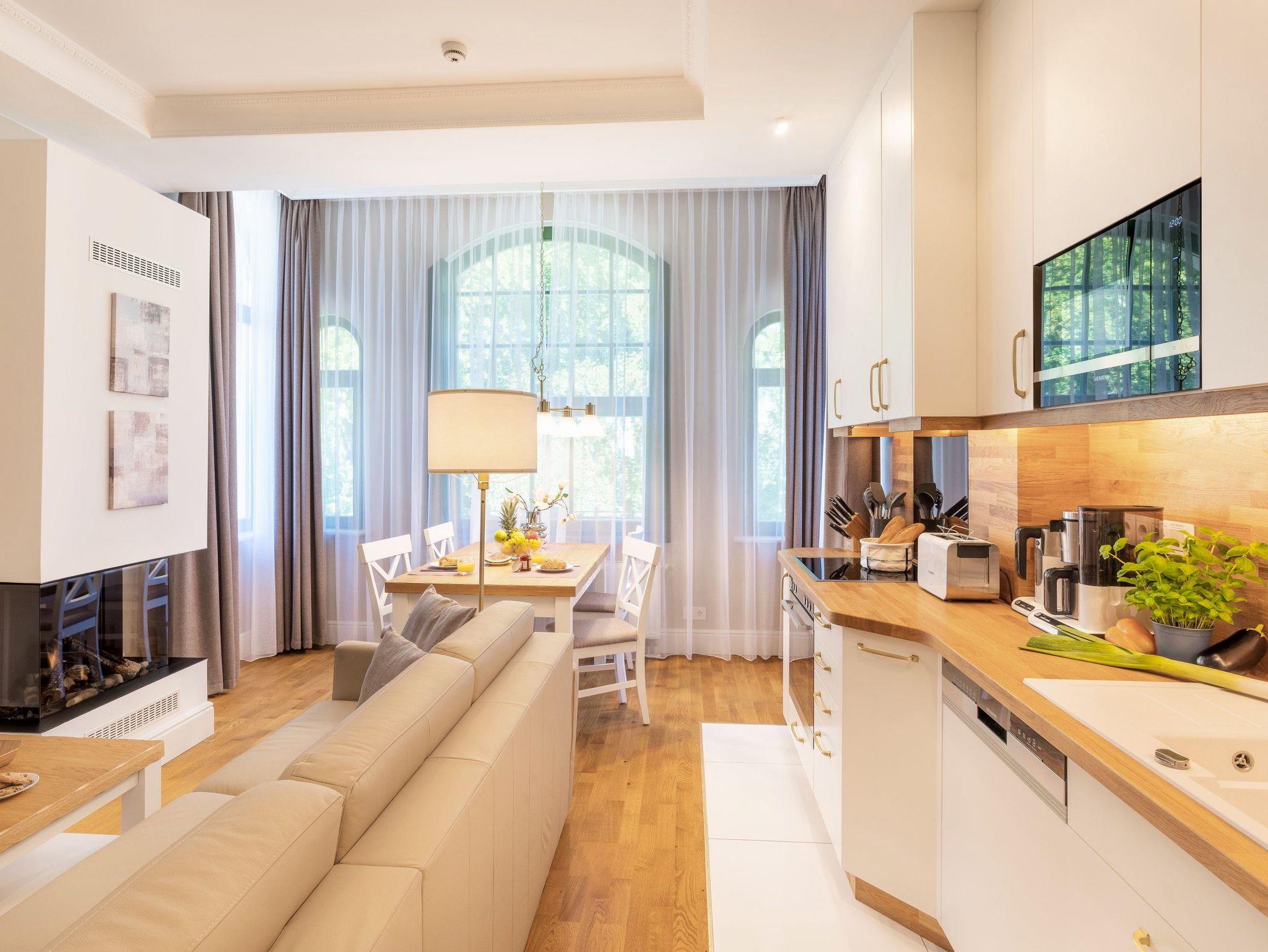 Auf 46 Quadratmetern im 2. Obergeschoss erwartet Sie ein lichtdurchfluteter Wohnbereich, der mit einem eleganten Gaskamin eine besonders gemütliche Atmosphäre schafft ? ideal für entspannte Abende. Die komfortable Couchgarnitur und der Flat-TV laden zum Abschalten, Lesen oder gemeinsamen Fernsehen ein. Hochwertiges Echtholzparkett sowie robuste Designer-Tapeten aus den USA unterstreichen den exklusiven Charakter des Appartements.