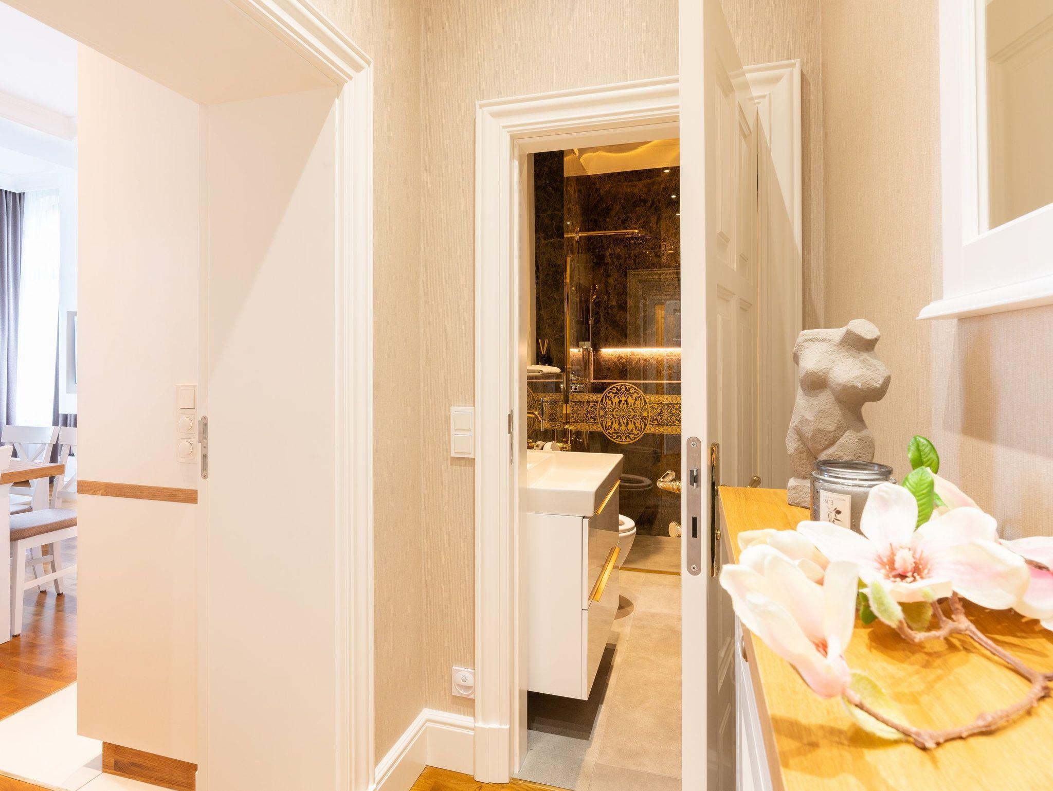 Damit Sie Ihre wohlverdiente Urlaubszeit bereits am Anreisetag in vollen Zügen genießen können, haben wir das Bett für Sie und das für Ihre lieben Mitreisenden bereits bezogen und ein Duschtuch sowie ein kleines Handtuch bereitgelegt. Das Badezimmer als Experiment, einmal mit einer auffallenderen und auch ungewöhnlicheren Farbgestaltung ein Wohlfühlgefühl de luxe zu erzeugen. Das Ergebnis kann sich sehen lassen: großformatige dunkle Natursteinfliesen gepaart mit einer hellen Badkeramik sowie Armaturen und Accessoires in Messing präsentieren nun zusammen mit einer bodengleichen Dusche den Urlaubskomfort.