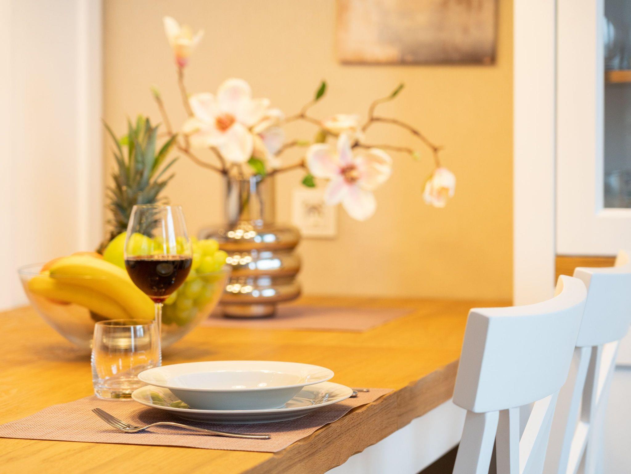 Ein großzügiger Wohnbereich mit einem exklusiven Gaskamin erwartet Sie bereits, sodass Sie eine angenehme Wohlfühlatmosphäre das gesamte Jahr über genießen. Eine bequeme Couchgarnitur und ein Flat-TV runden den Komfort perfekt ab und laden zum Entspannen und Füße hochlegen ein. Das helle Drei-Zimmer-Appartement hat eine Größe von 60 Quadratmetern und liegt im Hochparterre der Villa Waldschloss. Die vollausgestattete Küche, welche speziell von einem einheimischen Tischler angefertigt wurde, ergänzt die Annehmlichkeiten dieses neuen Appartements mit allen Raffinessen: Backofen, Mikrowelle, Kühlschrank mit Gefrierfach, Toaster, Wasserkocher, Kaffeemaschine sowie einem Essplatz für 5 Personen mit Blick in den gegenüberliegenden Park.