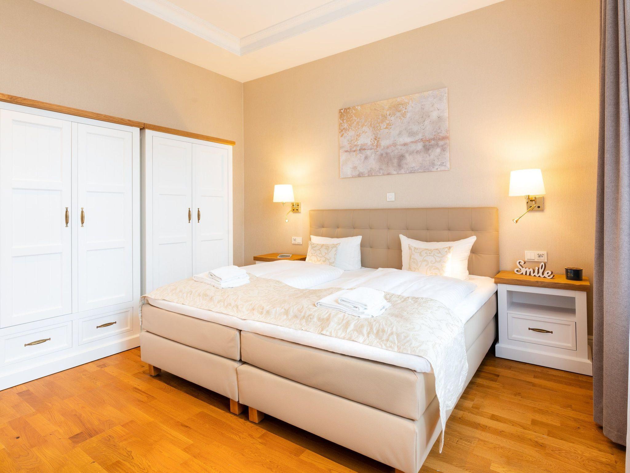 Echtholzparkett im Wohn- und Schlafraum, unkaputtbare Tapeten aus Amerika. Bei der Umgestaltung wurde nichts dem Zufall überlassen. Die fünf Schlafplätze verteilen sich auf zwei Schlafzimmer sowie der Schlafcouch im Wohnbereich, welche sich im Handumdrehen für einen Gast als Schlafmöglichkeit umfunktionieren lässt. Das erste Schlafzimmer lädt mit einem bequemen und zugleich hochwertigem Boxspringbett (200 x 200cm / zwei getrennte Matratze) zur Nachtruhe ein, das zweite Schlafzimmer mit einer hochwertigen Schlafcouch, welche sich im Handumdrehen für zwei Gäste als Schlafstätte umfunktionieren lässt. Lassen Sie hier den Tag ausklingen oder genießen Ihre Lieblingsserie vor dem TV. Ein Kleiderschrank zum Verstauen Ihrer Habseligkeiten während Ihrer Urlaubszeit steht für Sie bereit.