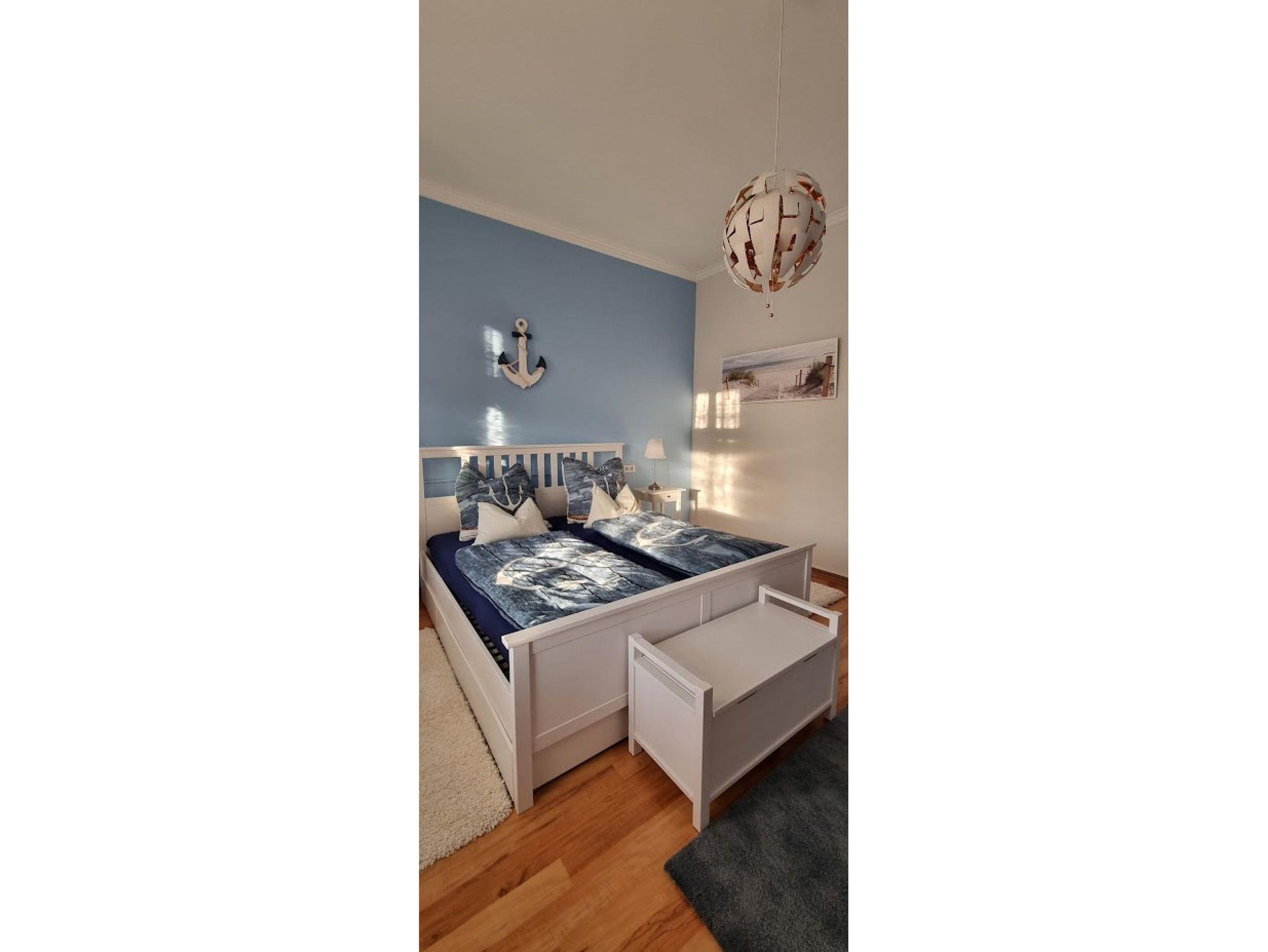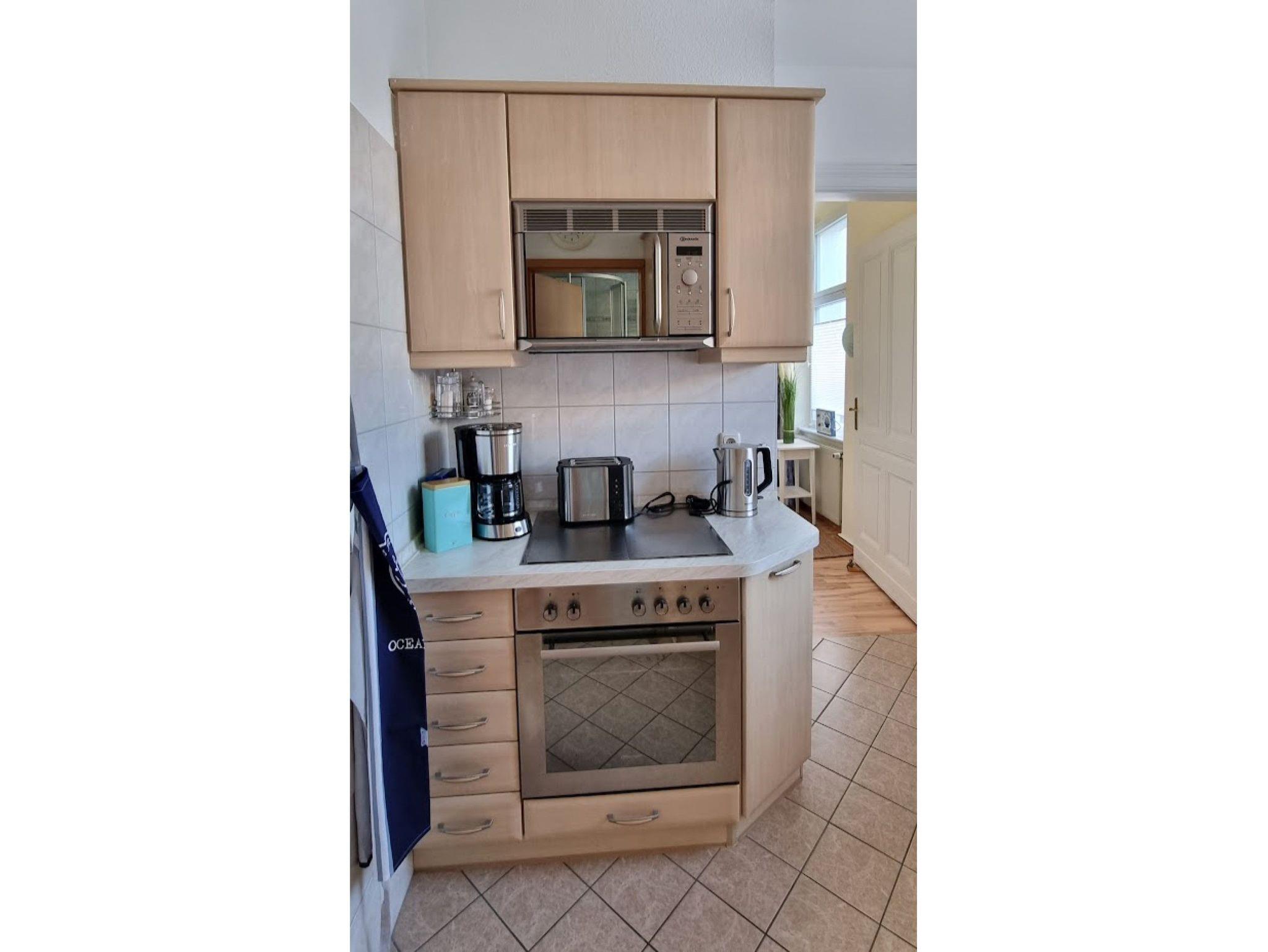 Das Schlafzimmer ist geräumig und mit einem Doppelbett und Kleiderschrank ausgestattet. Die Küchenzeile ist komplett eingerichtet, mit Kochfeld (Ceranfeld) und Backofen, Mikrowelle, Geschirrspüler und Kühlkombination.