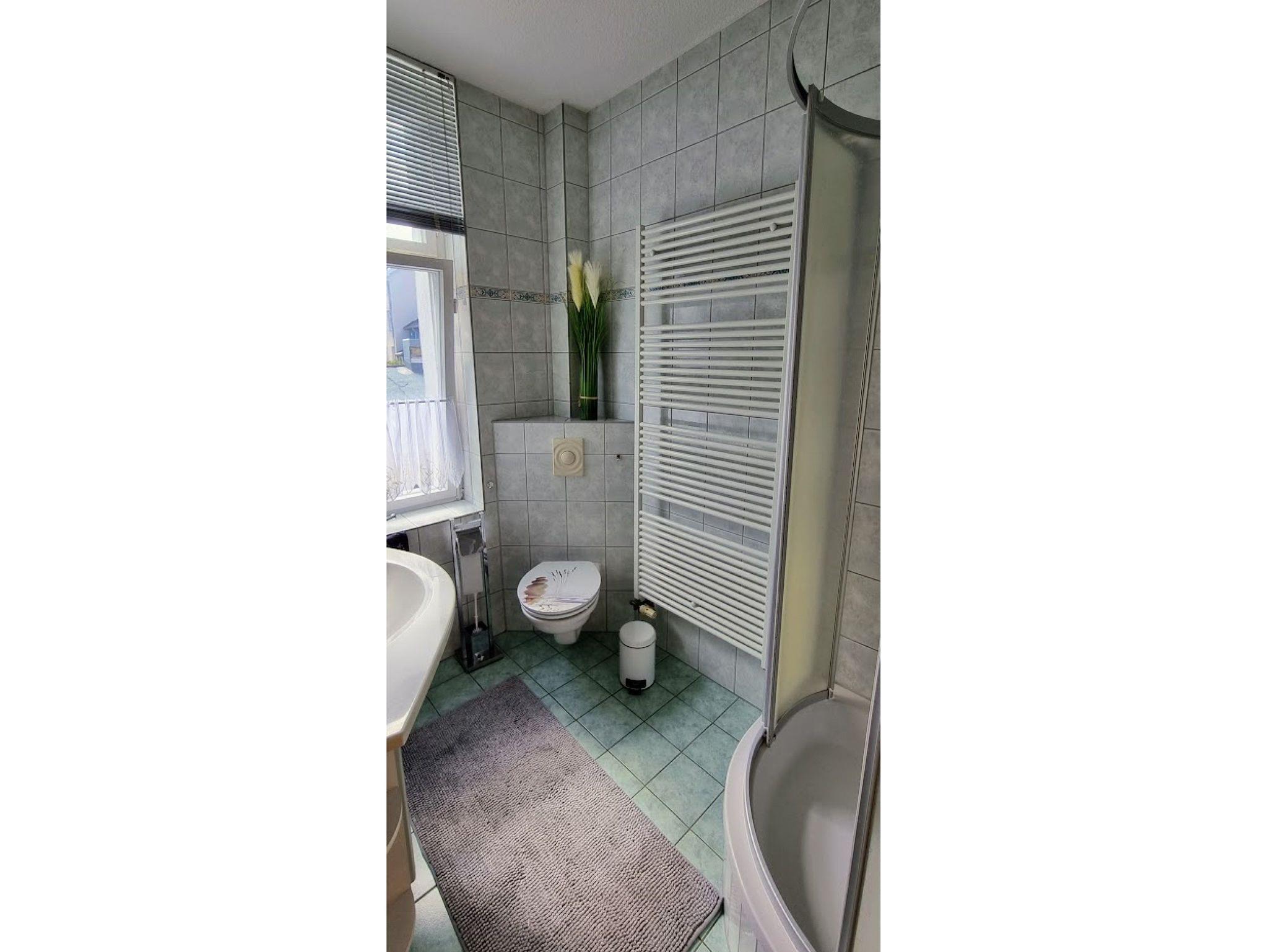 Das Bad verfügt über eine Dusche, einen Waschtisch mit Spiegel und WC.