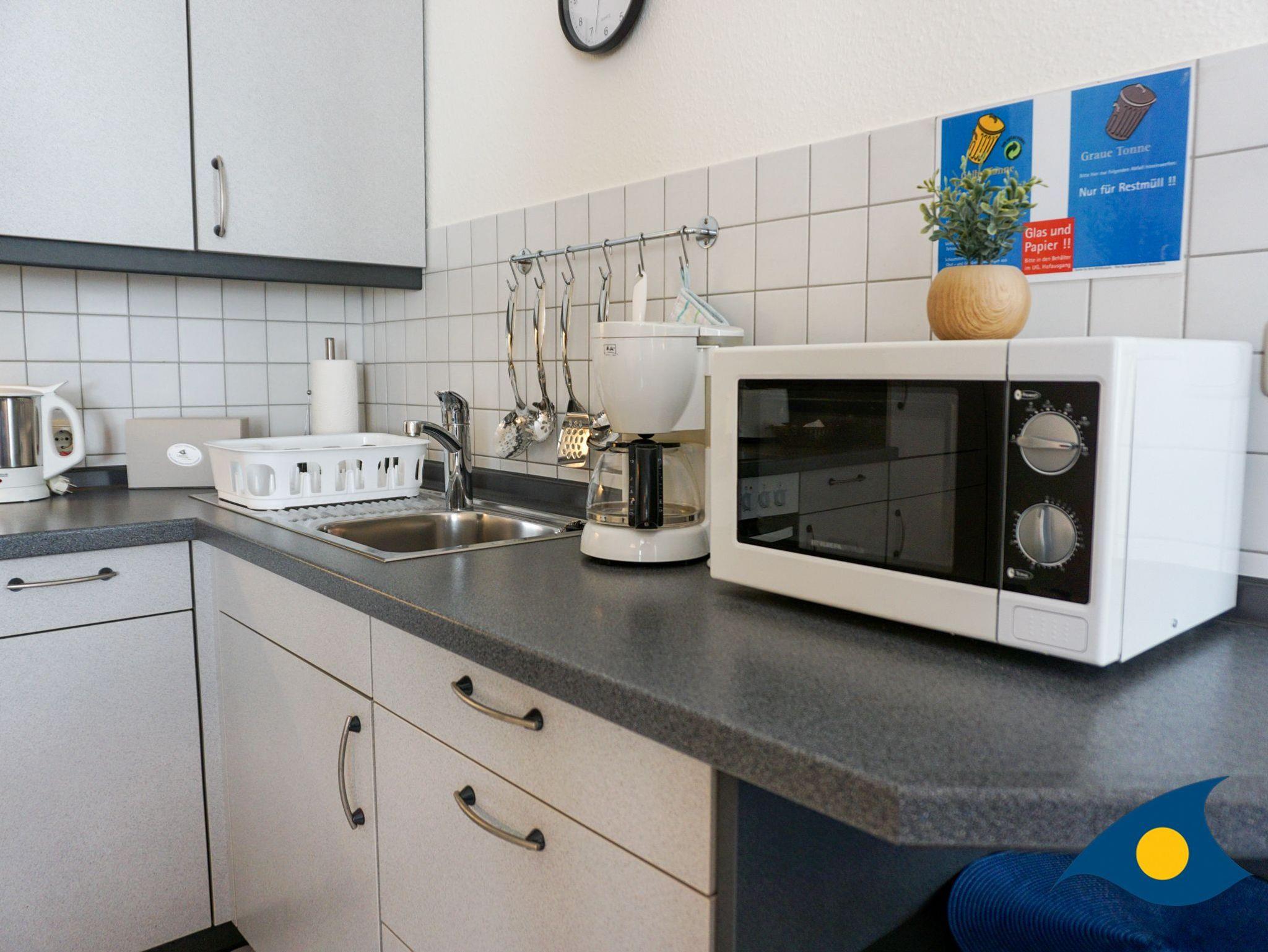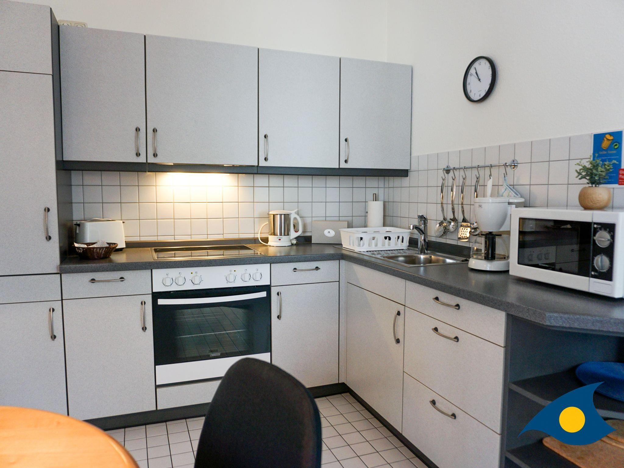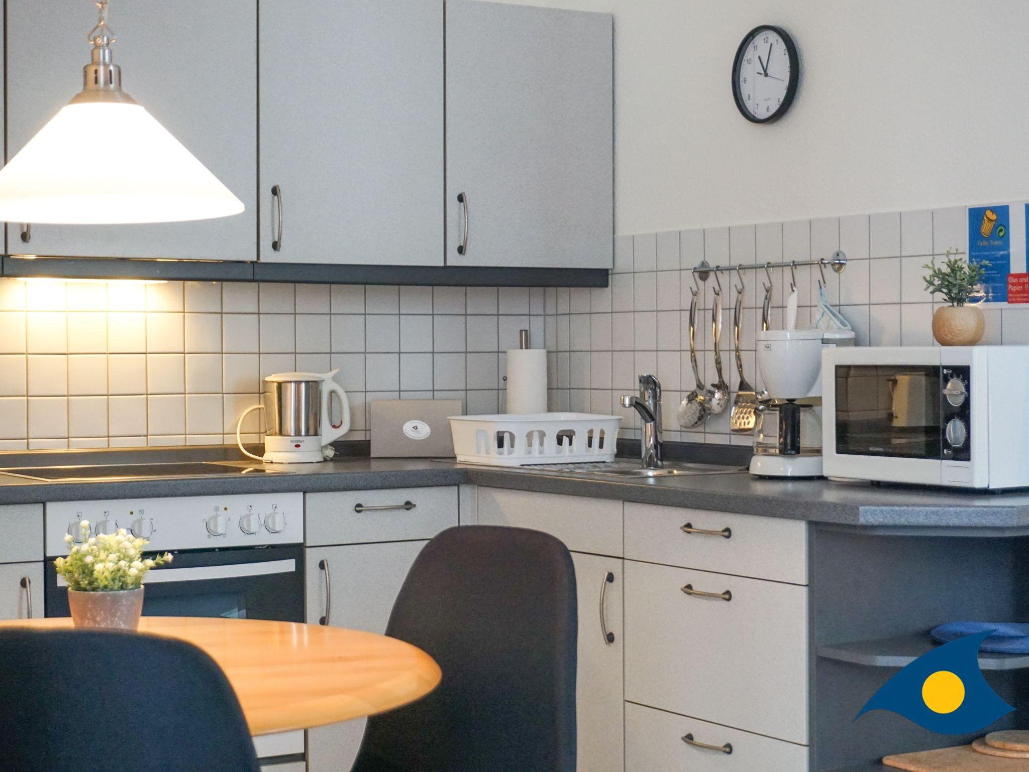 Die gut ausgestattete, etwas separierte Küche, verfügt über einen Herd mit Backofen, Kühlschrank mit Gefrierfach, Mikrowelle sowie Toaster, Wasserkocher und Kaffeemaschine.