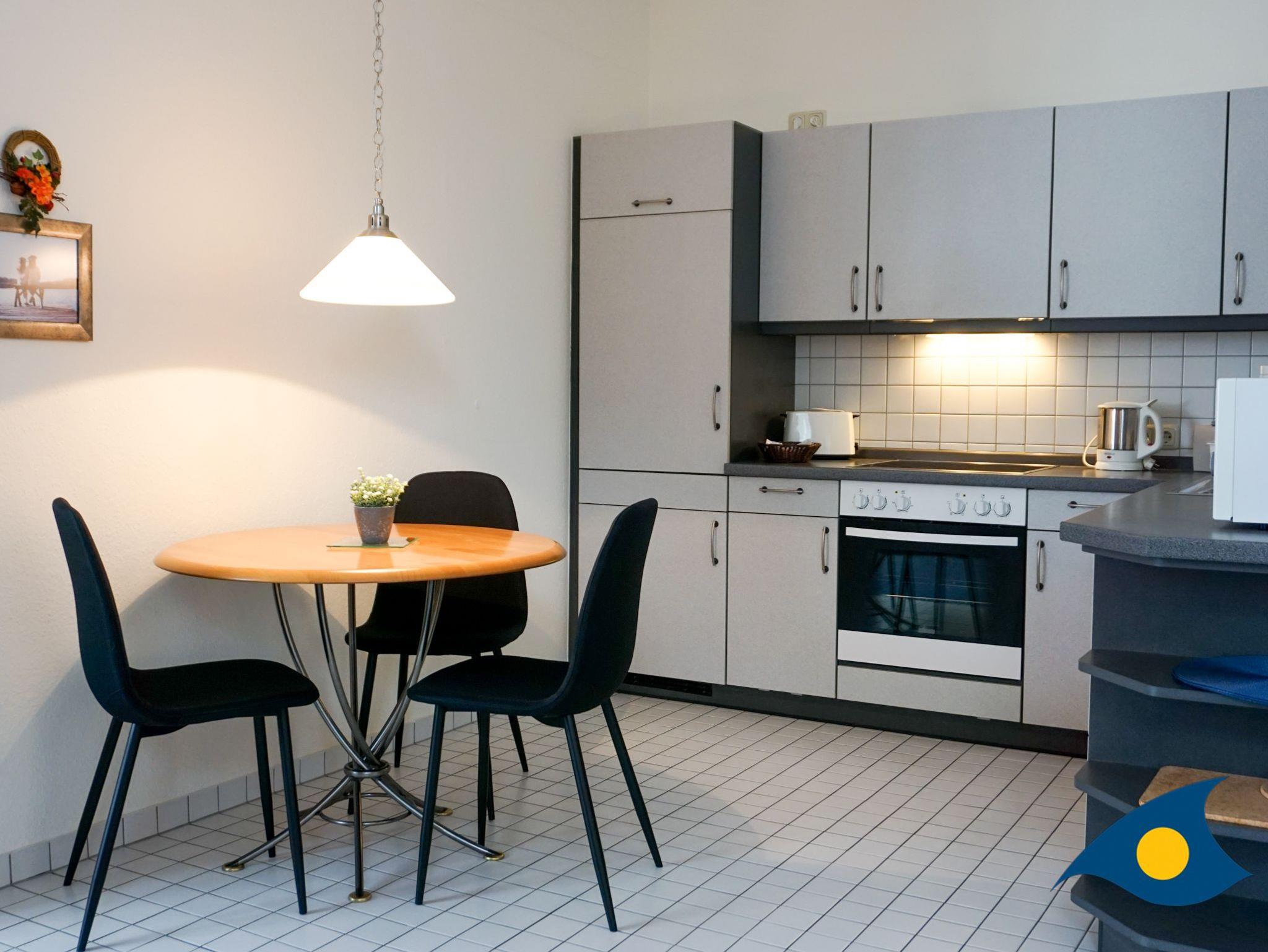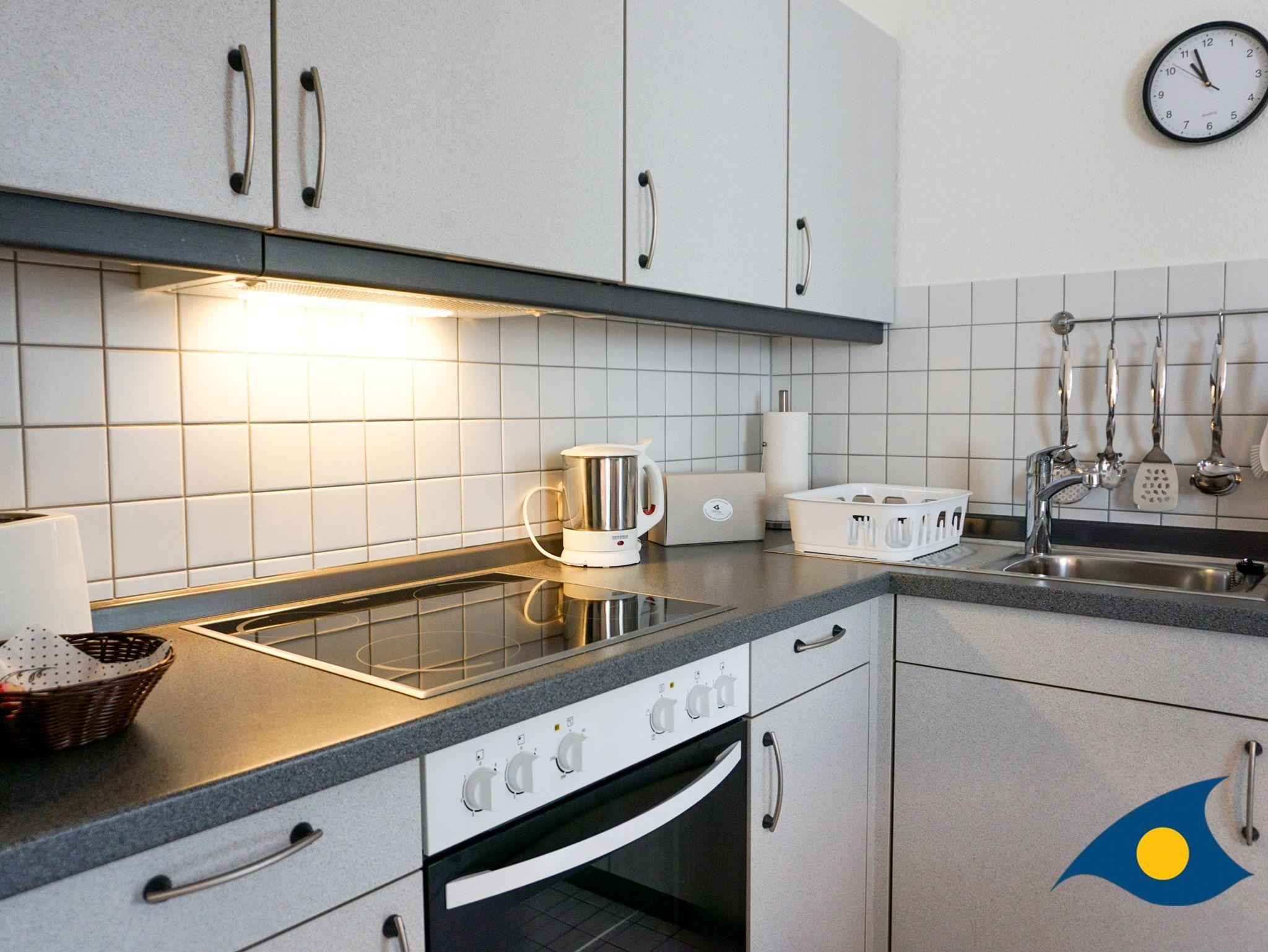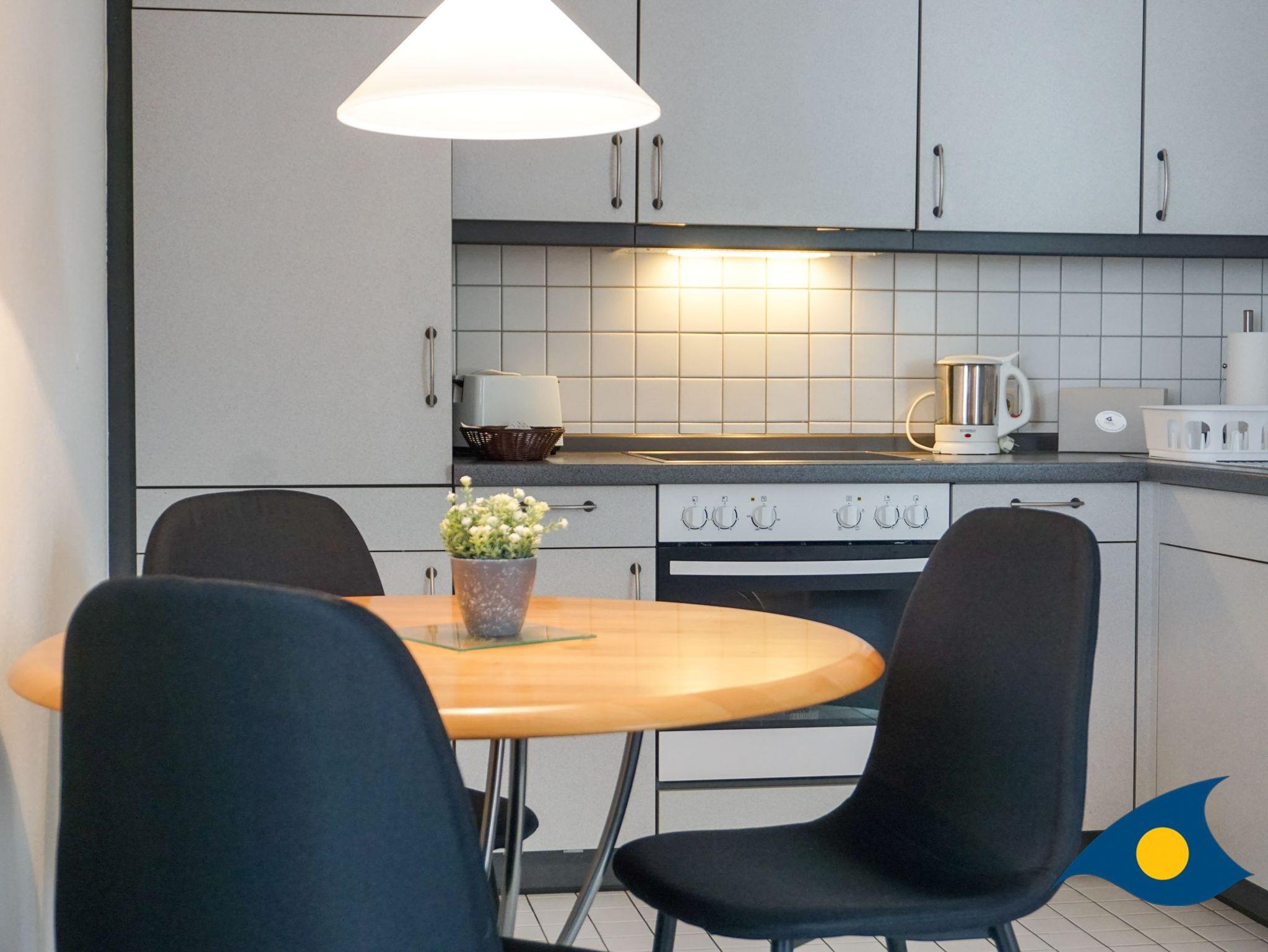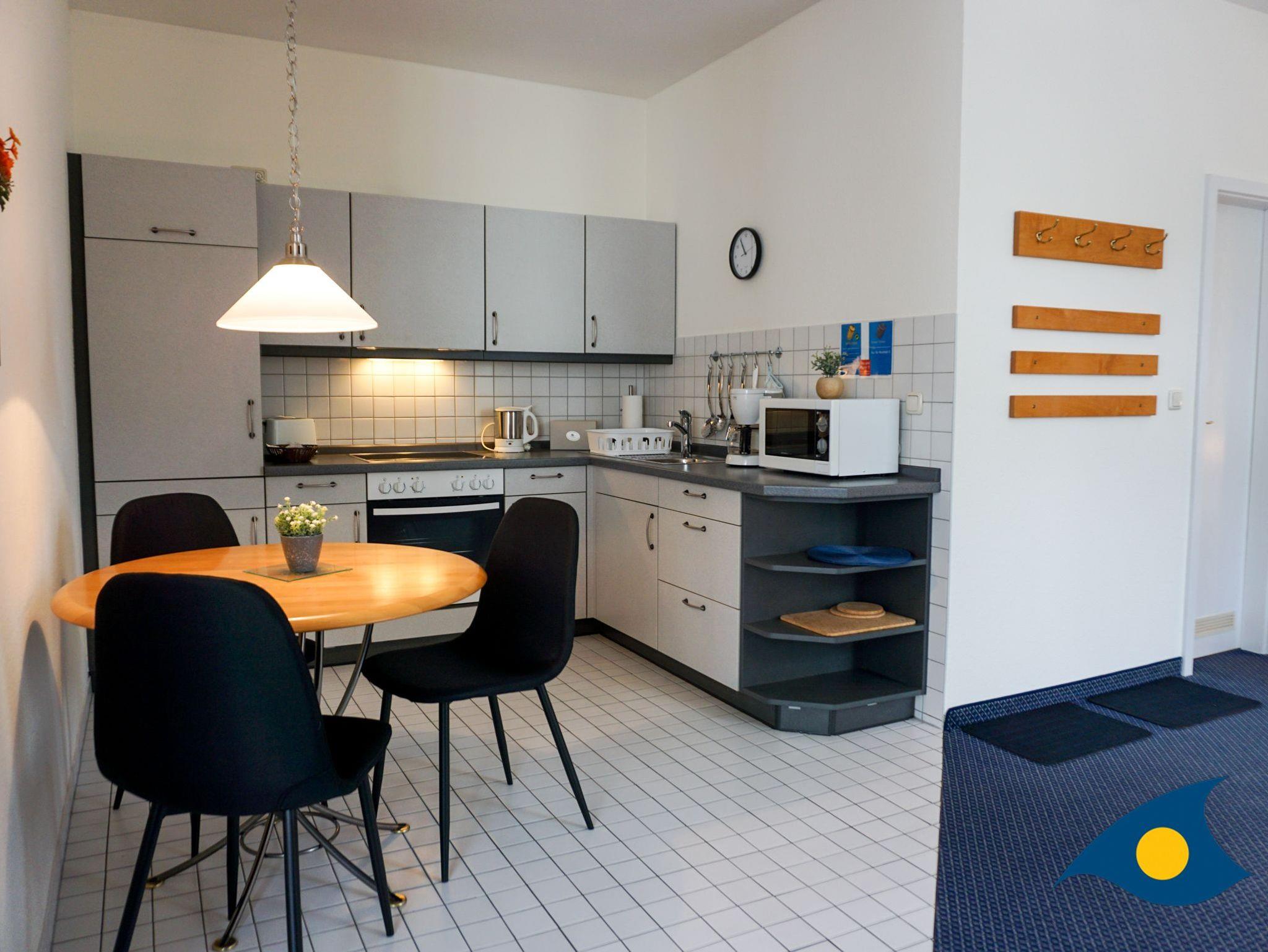 Die gut ausgestattete, etwas separierte Küche, verfügt über einen Herd mit Backofen, Kühlschrank mit Gefrierfach, Mikrowelle sowie Toaster, Wasserkocher und Kaffeemaschine.