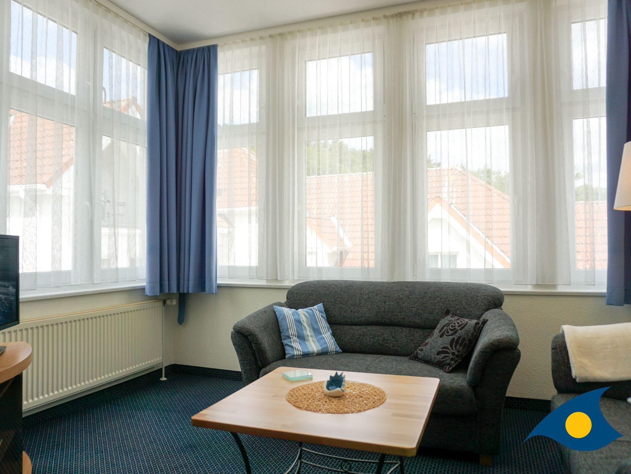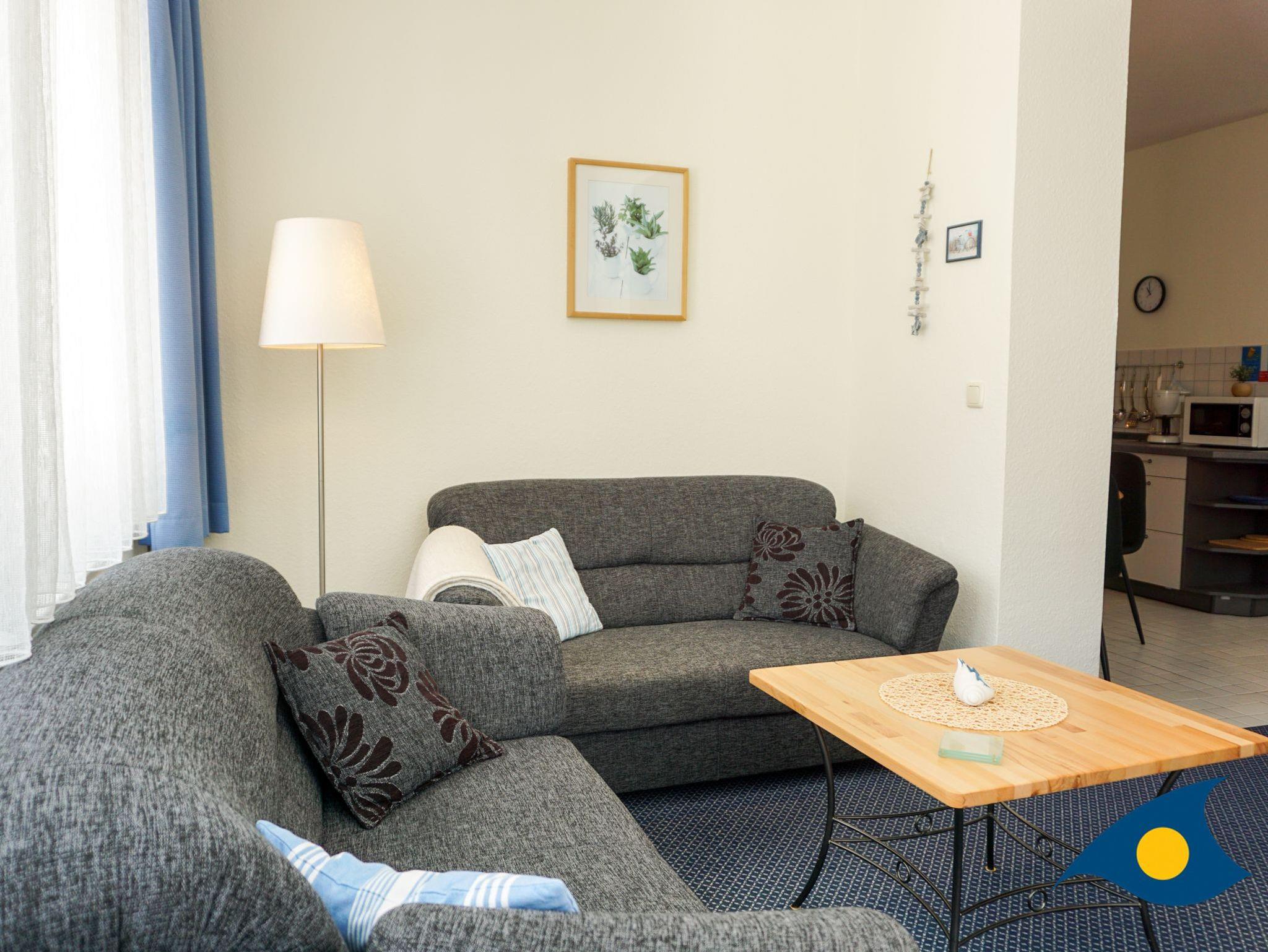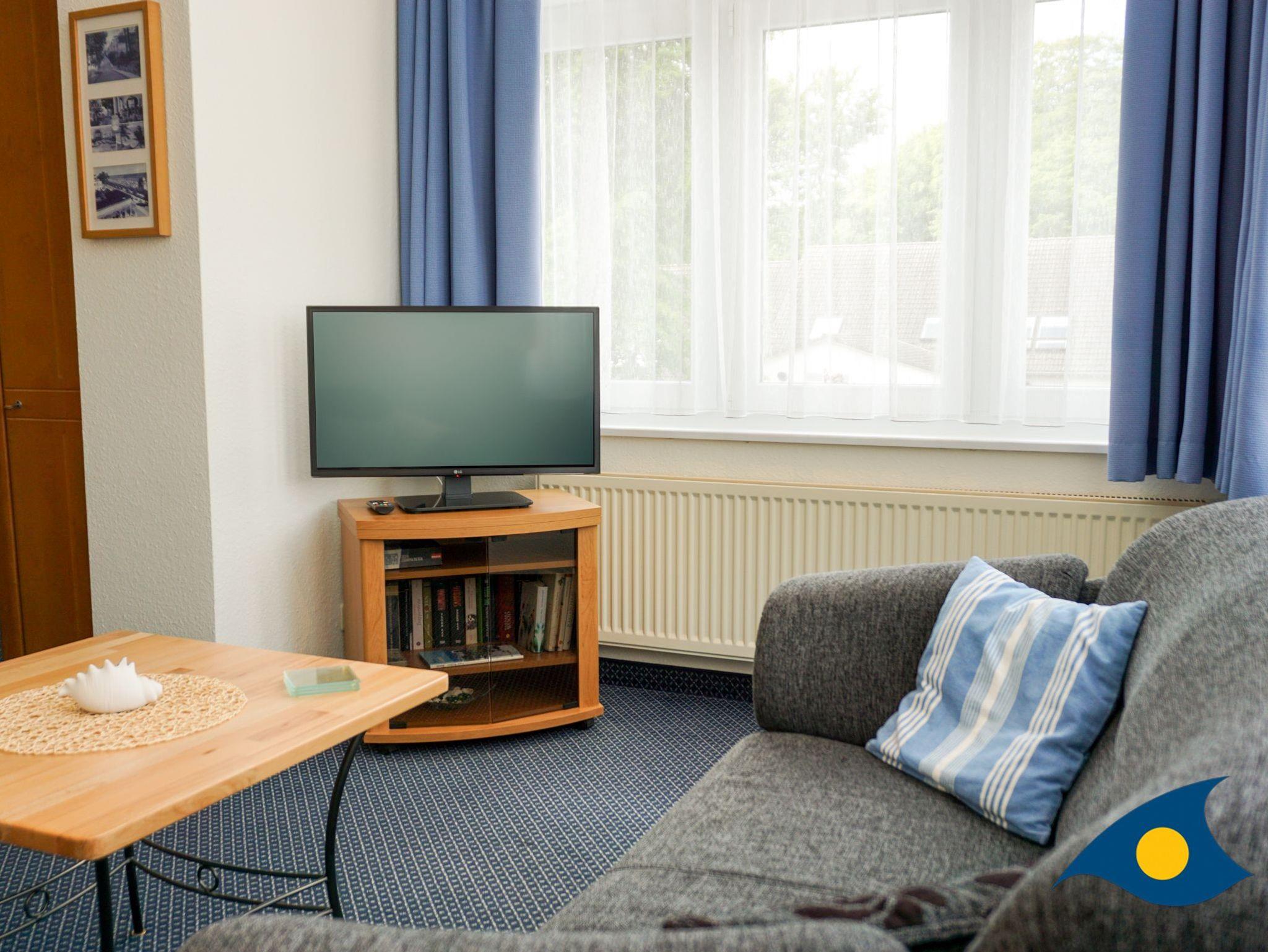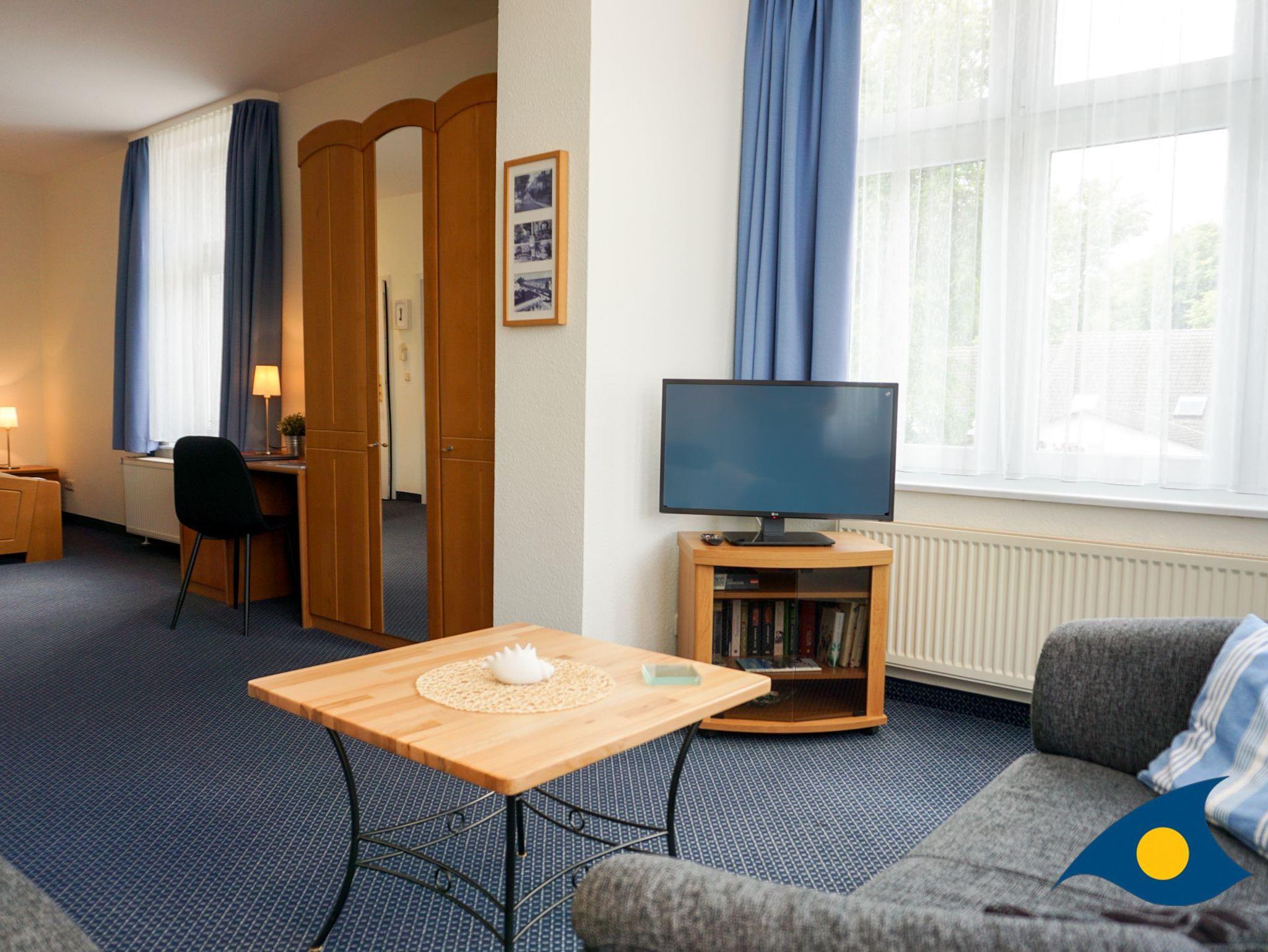 Der kombinierte Wohn- und Schlafbereich besticht durch seinen großzügigen Schnitt. Die gemütliche Couch-Ecke direkt am Fenster, läd zu entspannten Abenden nach langen Strandtagen ein. Für Unterhaltung sorgt ein moderner Smart-TV. Das komfortable Doppelbett (180x200) garantiert ruhige und erholsame Nächte.
